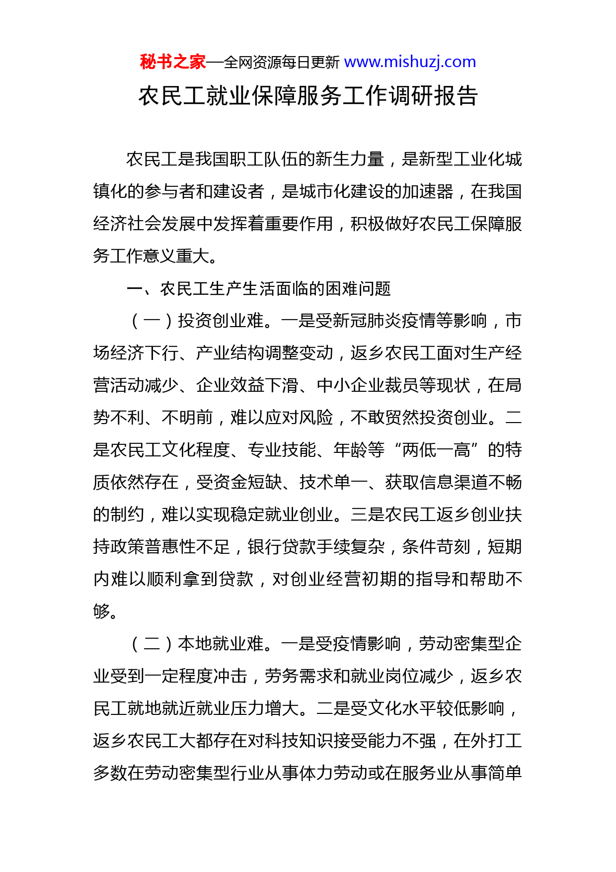 秘书之家—全网资源每日更新www.mishuzj.com农民工就业保障服务工作调研报告农民工是我国职工队伍的新生力量,是新型工业化城镇化的参与者和建设者,是城市化建设的加速器,在我国经济社会发展中发挥着重要作用,积极做好农民工保障服务工作意义重大。一、农民工生产生活面临的困难问题(一)投资创业难。一是受新冠肺炎疫情等影响,市场经济下行、产业结构调整变动,返乡农民工面对生产经营活动减少、企业效益下滑、中小企业裁员等现状,在局势不利、不明前,难以应对风险,不敢贸然投资创业。二是农民工文化程度、专业技能、年龄等“两低一高”的特质依然存在,受资金短缺、技术单一、获取信息渠道不畅的制约,难以实现稳定就业创业。三是农民工返乡创业扶持政策普惠性不足,银行贷款手续复杂,条件苛刻,短期内难以顺利拿到贷款,对创业经营初期的指导和帮助不够。(二)本地就业难。一是受疫情影响,劳动密集型企业受到一定程度冲击,劳务需求和就业岗位减少,返乡农民工就地就近就业压力增大。二是受文化水平较低影响,返乡农民工大都存在对科技知识接受能力不强,在外打工多数在劳动密集型行业从事体力劳动或在服务业从事简单秘书之家—全网资源每日更新www.mishuzj.com的劳动,技能水平普遍不高,择业竞争力不强,影响了重新就业竞争力。三是受信息不畅、情况不明影响,返乡农民工因长期在外务工,对本地企业用工需求了解甚少,尤其是大龄农民工,缺少获得择业择岗信息渠道,返乡后择业择岗情况不明、比较茫然。(四)社保转接难。农民工返乡时,难以将在外务工单位所交纳的社保金、社保关系转回本地接续,单位缴纳部分不能转出,只能退回个人部分,损失会变大。(五)权益维护难。一是大部分农民工的文化素养普遍偏低,当合法权益受到侵害时,不懂得运用法律武器来保护自己,或是采取极端方式解决,使矛盾激化,影响到自身利益的维护和社会的稳定。二是缺乏全国性的“黑名单”失信记录共享平台和农民工信息系统,企业失信行为和农民工行为记录难以互联共享,会出现当地企业在省内出现工资拖欠问题仍可去外省份经营,或是外地有工资拖欠行为的企业仍可在省内正常经营的现象。三是农民工权益保护立法有待完善,现行的大部分农民工权益保障规定基本都是条例、规定文件,上位法缺失,整个立法体系完善度非常淡薄,在实践操作中自然难以取得良好的成效。二、农民工就业创业的期盼意愿(一)“家门口”就业创业意愿大幅增加。一是受新冠肺炎疫情影响,外出务工形势严峻,要继续维继家庭经秘书之家—全网资源每日更新www.mishuzj.com济来源,返乡农民工留乡创业的意向不断增大,愿意在“家门口”创业。二是农民工在外积累了一定的技术、经验和资本,学到了从商和经营知识,又受国家支农惠农政策的吸引,加上对家乡的资源、市场、商机也比较熟悉,认为返乡创业成功的机会较多,有强烈的返乡创业愿望。三是希望在省、市、区内的就业上获得更多机会,让照顾家庭与经济创收实现新突破。(二)外出返岗就业趋势居高不下。一是外出打工挣钱直接驱动力不减。在当地受经济发展程度和消费水平的影响,与沿海等发达城市相比,工资待遇还存在很大差距,认为外出务工收入更高,继续外出务工是“良策”。二是就业渠道选择有惯性。受熟人思维、抱团理念的影响,容易形成一村一地抱团就业的趋势,惯性思维下求稳继续返岗就业。(三)返乡创业凸显新特点。一是已经创业的返乡农民工未来继续创业的意愿相对较高,但是大多数没有扩大经营规模和范围的计划;二是未创业农民工中约1/4有创业意愿;三是有创业意愿的返乡农民工计划创业的领域集中在传统第三产业。三、农民工转移就业的掣肘制约(一)“自身力”不足。农民工整体文化素质和劳动职业技能水平不高,就业技能缺乏,无法适应技能型岗秘书之家—全网资源每日更新www.mishuzj.com位,大部分都是从事重体力、低技术的劳动,随着产业升级的不断推进和经济结构的不断调整,将会在一段时期内造成农民工的结构性失业。(二)“保障力”不足。一是政府职能部门作用发挥不充分。宣传渠道不畅,政策知晓率不高;培训职能分散,针对性不强,培训效果不理想;创业支持和指导不够到位。二是农民工依法维权困难大、签订劳动合同的比例较低、克扣和拖欠农民工工资现象依然存在,保障力不足。三是农民工社保跨地区转移体系尚需完善,社保账户跨地区转移尚存很多困难。(三)“创业力”不足。一是创业条件不充分。许多返乡农民工空有创业意愿和热情,但受学历、经营管理、资金、项目、市场、以及自身能力和经验不足的限制,创业条件不成熟、不充分。二是创业缺乏前瞻性。对市场、项目的把控能力不强,存在盲目投资、跟风创业的现象,很容易成为反面案例,造成不良影响。(四)“吸纳力”不足。一是疫情、经济下行影响,出行难、岗位少,择岗就业难度大。二是农业产业化程度低,岗位创造度低、容纳率小。三是劳动密集型市域经济分布少、规模小,就业岗位不够、“吸纳力”不足。四、农民工转移就业的对策建议一是优化创业环境。放宽对农民工创业的限制,进一秘书之家—全网资源每日更新www.mishuzj.com步推动返乡创业、以企带村的发展模式。放宽资金政策,简化贷款办