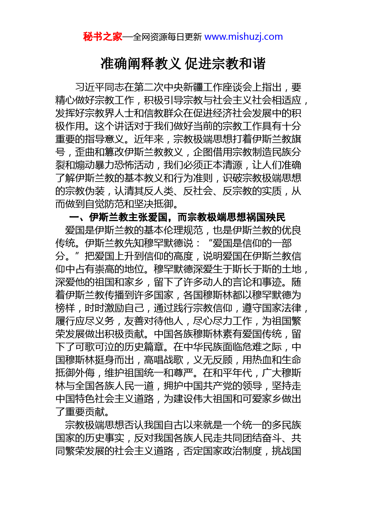 秘书之家—全网资源每日更新www.mishuzj.com准确阐释教义促进宗教和谐习近平同志在第二次中央新疆工作座谈会上指出,要精心做好宗教工作,积极引导宗教与社会主义社会相适应,发挥好宗教界人士和信教群众在促进经济社会发展中的积极作用。这个讲话对于我们做好当前的宗教工作具有十分重要的指导意义。近年来,宗教极端思想打着伊斯兰教旗号,歪曲和篡改伊斯兰教教义,企图借用宗教制造民族分裂和煽动暴力恐怖活动,我们必须正本清源,让人们准确了解伊斯兰教的基本教义和行为准则,识破宗教极端思想的宗教伪装,认清其反人类、反社会、反宗教的实质,从而做到自觉防范和坚决抵御。一、伊斯兰教主张爱国,而宗教极端思想祸国殃民爱国是伊斯兰教的基本伦理规范,也是伊斯兰教的优良传统。伊斯兰教先知穆罕默德说:“爱国是信仰的一部分。”把爱国上升到信仰的高度,说明爱国在伊斯兰教信仰中占有崇高的地位。穆罕默德深爱生于斯长于斯的土地,深爱他的祖国和家乡,留下了许多动人的言论和事迹。随着伊斯兰教传播到许多国家,各国穆斯林都以穆罕默德为榜样,时时激励自己,通过践行宗教信仰,遵守国家法律,履行应尽义务,友善对待他人,尽心尽力工作,为祖国繁荣发展做出积极贡献。中国各族穆斯林素有爱国传统,留下了可歌可泣的历史篇章。在中华民族面临危难之际,中国穆斯林挺身而出,高唱战歌,义无反顾,用热血和生命抵御外侮,维护祖国统一和尊严。在和平年代,广大穆斯林与全国各族人民一道,拥护中国共产党的领导,坚持走中国特色社会主义道路,为建设伟大祖国和可爱家乡做出了重要贡献。宗教极端思想否认我国自古以来就是一个统一的多民族国家的历史事实,反对我国各族人民走共同团结奋斗、共同繁荣发展的社会主义道路,否定国家政治制度,挑战国秘书之家—全网资源每日更新www.mishuzj.com家法律尊严,分裂伟大祖国,完全背离了伊斯兰教热爱祖国的情怀和理念。宗教极端思想以建立政教合一的“哈里发”国家为政治目标,妄图把新疆从祖国版图上分裂出去。为此,他们煽动实施暴力恐怖活动,制造心理恐慌和社会动乱;他们勾结境外分裂势力和反华势力,从事各种颠覆破坏活动;他们对“伊斯兰教法”作极端化解释,并以此作为划分标准,制造民族之间、群众之间的仇视;他们蔑视国家一切法律制度,拒绝政府颁布的法定证件。实际上,国家法律禁止的事情他们做了,伊斯兰教法禁止的事情他们也做了,完全背离了伊斯兰教的教义。二、伊斯兰教崇尚和平,而宗教极端思想煽动暴力“伊斯兰”是阿拉伯文的音译,其字面意义为和平、顺从。从宗教意义上来说,“伊斯兰”就是对真主的归顺与服从,归顺真主的旨意并服从安拉的戒律。那些皈依伊斯兰教的人(穆斯林),就是“和平”的信仰者和归顺者。《古兰经》中说:信道的人们啊!你们当全体入在和平教中。伊斯兰教是追求和平的宗教,穆斯林自当热爱和平,并以实际行动维护和平,反对一切阻碍和平的言行。曾有人问穆罕默德,伊斯兰最宝贵者是什么?穆罕默德回答:“就是用自身的语言和行为使穆斯林得到安宁;穆民就是使人们的生命和财产得到安全的人。”和平理念体现到穆斯林生活的各个方面。伊斯兰教坚决反对滥杀无辜,《古兰经》中说:“凡枉杀一人,如杀众人。”因此,伊斯兰教认为无故杀人是大罪。宗教极端思想打着伊斯兰旗号,用“暴力”替换了“和平”。他们鼓吹以“圣战”来实践“主命”,蛊惑穆斯林去屠杀“异教徒”,声称不杀“异教徒”就不能上天堂。伊斯兰教要求穆斯林驱除内心的一切罪恶,为人光明正大,努力为主道而奋斗。而宗教极端思想却鼓吹暴力,制造恐怖,以“圣战”为名滥杀无辜。把以和平、顺从为旗帜的伊斯兰教,与杀害“异教徒”捆绑在一起,甚至教唆人去杀害无辜的群众,这是对伊斯兰教的严重亵渎和恶意诋毁。秘书之家—全网资源每日更新www.mishuzj.com三、伊斯兰教倡导团结,而宗教极端思想制造分裂伊斯兰教要求实现无差别的人类团结。伊斯兰教打破了阿拉伯人固有的氏族、种族观念。《古兰经》提出,人类同出一源,都是阿丹(亚当)的后裔,是一个大家庭,至于种族、肤色、语言的不同则是为了相互认识和了解,绝对不能以此论贵贱。正如《古兰经》所说:“众人啊!我确已从一男一女创造你们,我使你们成为许多民族和宗族,以便你们互相认识。”穆罕默德在“辞朝演说”中讲:“阿拉伯人不比非阿拉伯人优越,非阿拉伯人不比阿拉伯人优越;红种人不比黑种人优越,黑种人也不比红种人优越。”这些经文和圣训,体现了伊斯兰教对不同民族、不同种族的平等、宽容的思想,有利于增进人类的团结和友爱。伊斯兰教提倡不同宗教间和谐相处,反对狭隘的宗教主义。《古兰经》说:“你们有你们的报应,我也有我的报应。”此处“报应”意为“宗教”,即各有各的宗教,互不干涉,信教自由。而宗教极端思想最害怕各族人民团结,他们离间干群关系、民族关系、宗教关系,甚至离间穆斯林之间的关系。他们鼓吹“异教徒”论,对党员干部和不信教群众采取“见面不问候、遇事不帮忙、有病不看望、死后不送葬”等极端做法,甚至煽动以暴力恐怖手段残害“异教徒”。把坚持反对分裂的少数民族党员干部、爱国宗教界人士以及广大群众,视为眼中钉、