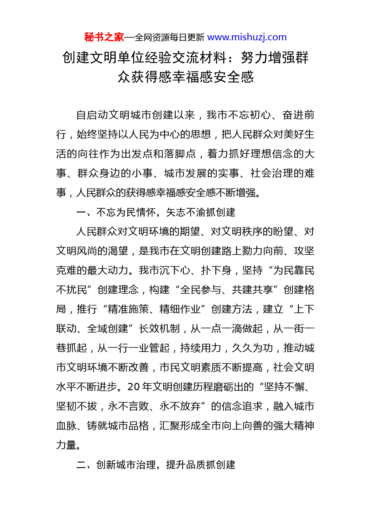 秘书之家—全网资源每日更新www.mishuzj.com创建文明单位经验交流材料:努力增强群众获得感幸福感安全感自启动文明城市创建以来,我市不忘初心、奋进前行,始终坚持以人民为中心的思想,把人民群众对美好生活的向往作为出发点和落脚点,着力抓好理想信念的大事、群众身边的小事、城市发展的实事、社会治理的难事,人民群众的获得感幸福感安全感不断增强。一、不忘为民情怀,矢志不渝抓创建人民群众对文明环境的期望、对文明秩序的盼望、对文明风尚的渴望,是我市在文明创建路上勠力向前、攻坚克难的最大动力。我市沉下心、扑下身,坚持“为民靠民不扰民”创建理念,构建“全民参与、共建共享”创建格局,推行“精准施策、精细作业”创建方法,建立“上下联动、全域创建”长效机制,从一点一滴做起,从一街一巷抓起,从一行一业管起,持续用力,久久为功,推动城市文明环境不断改善,市民文明素质不断提高,社会文明水平不断进步。20年文明创建历程磨砺出的“坚持不懈、坚韧不拔,永不言败、永不放弃”的信念追求,融入城市血脉、铸就城市品格,汇聚形成全市向上向善的强大精神力量。二、创新城市治理,提升品质抓创建秘书之家—全网资源每日更新www.mishuzj.com底蕴丰厚的历史积淀、独具特色的自然景观、包容厚重的文化传承,构成了独特的城市魅力。我市积极探索省会城市现代化治理模式,既提升城市颜值,也涵养城市气质,打造建管并重、内外兼修的品质之城。建立“网格化、精细化、智慧化、法制化”四位一体城市管理机制,累计拆除违法建筑XX万多处、XX多万平方米。打造人脸识别、爱心斑马线、信用惩戒的“路口文明”,文明交通蔚然成风。充分利用XX的独特禀赋,在“显山露水”上做文章,泉水连续14年喷涌,26处山体公园融入城市环境。以壮士断腕的决心打好治霾攻坚战,“蓝天白云、繁星闪烁”渐渐成为生活常态。城市品质的提升,优化了发展环境、增添了发展后劲。创造了十几年来经济发展的最好水平。三、加强人文关怀,服务群众抓创建城市不光要有高楼大厦,更要有文明的温度。我市以打造“温馨XX、温度城市”为目标,推动学雷锋志愿服务制度化、常态化、项目化,全市涌现出XX多支志愿服务队、XX万多名志愿者。三十六年如一日悉心照顾毫无血缘关系孤寡老人的房泽秋,为挽救危重孕妇跑步献血的XX余名XX群众,这些普通市民用他们奉献他人、提升自我的文明行为,传递了正能量,温暖了一座城。为环卫工人开设XX多处休息站,为迎接高考、中考把整个城市调到“静秘书之家—全网资源每日更新www.mishuzj.com音”档,为应对极端天气制定停课安排和误工免责处理意见,为方便市民生活着力打造10分钟社区生活服务圈,这些融入点滴的人文关怀,让城市充满温情,汇聚成城市大爱。文明创建的过程,就是凤凰涅槃、蝶变花开的过程。全国文明城市的荣誉,是对过去20年文明进步的肯定,更是对未来再攀高峰的期许。我市一定用习近平新时代中国特色社会主义思想武装头脑、指导实践、推动工作,认真贯彻表彰大会精神,以城市发展的新气象和城市文明的新进步,为决胜全面建成小康社会做出新的更大贡献。