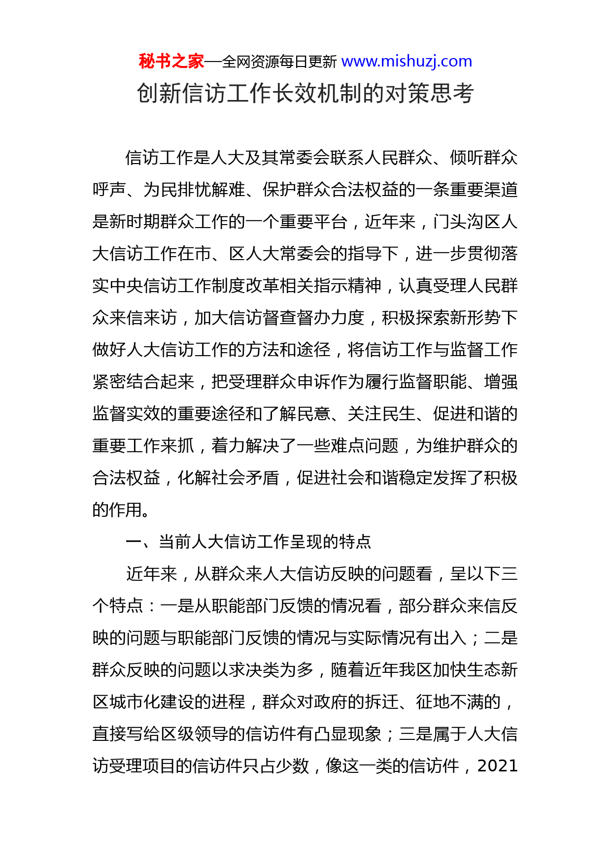 秘书之家—全网资源每日更新www.mishuzj.com创新信访工作长效机制的对策思考信访工作是人大及其常委会联系人民群众、倾听群众呼声、为民排忧解难、保护群众合法权益的一条重要渠道是新时期群众工作的一个重要平台,近年来,门头沟区人大信访工作在市、区人大常委会的指导下,进一步贯彻落实中央信访工作制度改革相关指示精神,认真受理人民群众来信来访,加大信访督查督办力度,积极探索新形势下做好人大信访工作的方法和途径,将信访工作与监督工作紧密结合起来,把受理群众申诉作为履行监督职能、增强监督实效的重要途径和了解民意、关注民生、促进和谐的重要工作来抓,着力解决了一些难点问题,为维护群众的合法权益,化解社会矛盾,促进社会和谐稳定发挥了积极的作用。一、当前人大信访工作呈现的特点近年来,从群众来人大信访反映的问题看,呈以下三个特点:一是从职能部门反馈的情况看,部分群众来信反映的问题与职能部门反馈的情况与实际情况有出入;二是群众反映的问题以求决类为多,随着近年我区加快生态新区城市化建设的进程,群众对政府的拆迁、征地不满的,直接写给区级领导的信访件有凸显现象;三是属于人大信访受理项目的信访件只占少数,像这一类的信访件,2021秘书之家—全网资源每日更新www.mishuzj.com年我区人大只有11件,占全部信访件的16.2%。虽然我们在信访工作中做了许多努力,也取得了一定的成效,但信访工作仍存在一些难点,主要表现在实效性还不强,解决率还不高。以上之特点分析,其实也是目前形势下信访工作遇到的问题和困难,可以称之为“信访困境”,如何走出此困境,必须要构建新的对策机制,而新对策机制的建立,有必要分析产生这些问题的原因。二、“信访困境”原因剖析究其原因,我们认为有以下几点:1.人大信访工作的机制还不尽合理。人大信访工作是按照“分级负责,归口办理”的原则进行运作,人大信访案件以“接访办信”为主,没有直接督办,只是起一种“中转站”的作用。办理质量主要取决于承办单位的领导及办理人员的人大意识以及重视程度。从办理的情况看,相当一部分办理单位存在着重答复、轻解决问题的现象,一定程度上造成了信访人的多头访、重复访、越级访,信访解决率也就难有质和量的突破。2.人大信访工作还缺乏刚性和实效。信访工作成效最终应当体现在信访问题的解决和让信访者满意而归或息访。但在信访无法解决群众困难工作的实践中,人大信访还不能很好地与人大监督工作融为一体。当前,由人大转办、秘书之家—全网资源每日更新www.mishuzj.com交办的信访件,在一些承办单位解决起来有困难的情况下人大信访部门缺少督办机制,有时显得无能为力,特别是像群众反映的一些历史遗留问题、法院执行难等问题。这些都直接困扰了我们人大信访件的办结率,直接影响了人大信访件的办理质量和效率,也影响了人民群众对人大机关地位、性质、作用的认同。3.宣传力度不够和群众自身的认识问题。大多数的群众对人大信访工作的范围、性质还不甚了解。有一半以上的群众对人大信访工作的范围还不甚了解,在遇到问题时本可找政府信访部门,但认为人大是监督“一府一委两院”的,于是,便找了政府信访部门再找人大,找了人大再找政府信访部门。另外,也有部分群众不清楚自己应当如何运用法律武器保护自己的合法权益,即便知道,也是出于各种原因,如:走法律途经要花钱,所以就来人大要求帮助解决,无形中也形成了一种无序的上访。也有少数群众由于对国家的法律、政策不甚了解,出于个人的思维定势和个人的利益反映的问题,往往都带有片面性,甚至与事实不相符合。当然其中也不乏有个别钻“牛角尖”,无理取闹,胡搅蛮缠的。三、创新信访工作长效机制的对策思考有效解决群众信访,是做好新时期信访工作的重要环节。为此,我们按照构建和谐社会的要求,把解决群众的秘书之家—全网资源每日更新www.mishuzj.com合理诉求作为信访工作的第一任务,积极探索从源头上解决群众上访的治本之策,促进社会和谐发展。(一)加强领导,促进重点信访问题化解工作的开展为强化信访工作,我区人大主任高度重视,亲自阅批定期听取重点信访矛盾控制化解情况汇报,对疑难、复杂信访问题逐案分析和研究。如,针对龙泉镇三家店村民反映村干部有违法乱纪的问题、田某某在法庭上被被告打成几级残疾的问题等几个重点信访问题,分别召开信访专题会议,认真听取相关部门对矛盾调处进展情况的情况,研究措施,部署工作,促进问题的解决。(二)坚持制度,健全并完善领导信访责任制一是坚持人大领导信访接待日制度。每季度预约接访一次。二是完善领导包案制度。对经排查确定的重点信访问题,按照问题的性质、涉及单位和领导分工,全部实行了领导包案,明确了包案领导、主办单位、属地责任单位及办理时限,并提出了包案领导包调查、包处理、包结案包息诉和包稳定的“五包”工作要求。(三)及时办理初信初访,切实维护群众利益区人大信访部门不断加强各级人大信访部门办理初信初访的责任意识,严格落实初信初访“首问责任制”、“首办责任制”,在群众信访问题产生的初始阶段解决好信访问题,避免造成群众越级信访或重复信访。同时,畅秘书之家—全网资源每日更新www.mish