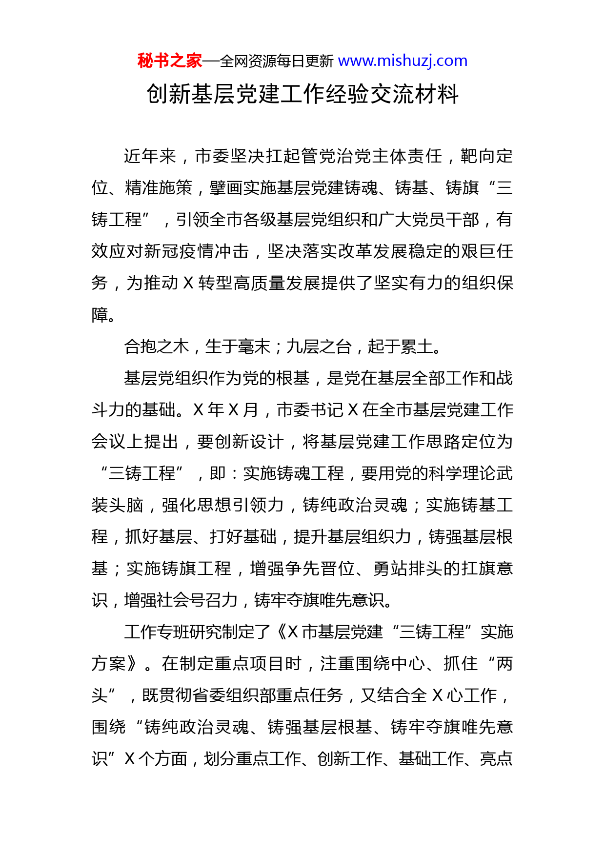 秘书之家—全网资源每日更新www.mishuzj.com创新基层党建工作经验交流材料近年来,市委坚决扛起管党治党主体责任,靶向定位、精准施策,擘画实施基层党建铸魂、铸基、铸旗“三铸工程”,引领全市各级基层党组织和广大党员干部,有效应对新冠疫情冲击,坚决落实改革发展稳定的艰巨任务,为推动X转型高质量发展提供了坚实有力的组织保障。合抱之木,生于毫末;九层之台,起于累土。基层党组织作为党的根基,是党在基层全部工作和战斗力的基础。X年X月,市委书记X在全市基层党建工作会议上提出,要创新设计,将基层党建工作思路定位为“三铸工程”,即:实施铸魂工程,要用党的科学理论武装头脑,强化思想引领力,铸纯政治灵魂;实施铸基工程,抓好基层、打好基础,提升基层组织力,铸强基层根基;实施铸旗工程,增强争先晋位、勇站排头的扛旗意识,增强社会号召力,铸牢夺旗唯先意识。工作专班研究制定了《X市基层党建“三铸工程”实施方案》。在制定重点项目时,注重围绕中心、抓住“两头”,既贯彻省委组织部重点任务,又结合全X心工作,围绕“铸纯政治灵魂、铸强基层根基、铸牢夺旗唯先意识”X个方面,划分重点工作、创新工作、基础工作、亮点秘书之家—全网资源每日更新www.mishuzj.com工作X个类型,共设立重点项目X项,为全市组织工作定方向、指路线、明任务。核心词:学理论、强思想、铸灵魂组织是“形”,思想是“魂”。加强党的组织建设,不但要“造形”,更要“铸魂”。深学理论更新观念。坚持读原著、学原文、悟原理,用党的科学理论武装头脑,强化思想引领力,铸纯政治灵魂。深入开展“解放思想、振兴发展”研讨,市委主要领导带头讲能力作风建设专题党课,示范带动全市副处级以上党员领导干部讲党课X余次。召开反思研讨会,市委常委带头查问题、找不足,X多名科级以上干部线上收看。举办学习党的十九届六中全会精神、基层党组织书记培训等各类培训班X期,轮训党员X万余人次。深化“党课开讲啦”活动,有选择地采取“有声党课”“网络党课”“情景党课”等形式开展党课教育,全市各级党组织书记累计讲党课X余人次,党组织开展干部讲党课X余场次。宣讲推介拓宽视野。创新举办X场X挂职锻炼干部宣讲报告会,累计受众X.X万余人次。持续深化开展“四级书记上讲台走基层谋发展”活动,宣讲党的十九届六中全会精神活动X余次。创新开展“红色公交车”“流动课堂”等特色活动,X条线路、X辆“红色主题公交车”被打造成为党史学习教育“流动课堂”和意识形态宣传阵地。秘书之家—全网资源每日更新www.mishuzj.com感悟党史坚定信念。积极传承红色基因,赓续精神血脉,打造X等红色资源阵地X个,全市党员干部群众利用红色资源阵地有效学习X“四大精神”X余场,累计参加学习X万余人次。在庆祝中国共产党成立X周年期间,对近年来涌现出X个先进基层党组织、X名优秀共产党员和X名优秀党务工作者进行了表彰,通过X电视台《旗帜》专栏、市委组织部《煤海红帆》微信公众号等媒体对先进事迹进行广泛宣传,用正确的舆论导向引导激励广大党员干部担当作为。深入挖掘开发北大荒事迹,制作优秀党员教育片《追忆》在中组部“共产党员网”展播。核心词:创品牌、求实效、铸根基治国安邦,重在基础;管党治党,重在基层。创建品牌强引领。全市各级党组织不断丰富党建工作载体,着力打造一批基层党建“精品”。四方台区积极探索“党建+田长制”新模式,建立“五级共治”责任体系,保护“耕地中的大熊猫”。饶河县立足边疆实际,打造具有饶河特色的“船歌向党”党建品牌,将组织优势转化为发展优势,推动巩固边疆繁荣稳定。X县打造全省首个“第一书记之家”,开创“蓄能充电、资源整合、互进互促、抱团发展”的驻村帮扶新局面,精心设计“X好物我推荐”系列产品,通过驻村第一书记、“村播达人”直播带货助农增收X余万元。X县突出县场融合,开展“五色党秘书之家—全网资源每日更新www.mishuzj.com建”,引领县场各级党组织和广大党员在政治、经济、社会、文化等各领域开展一系列深度融合、合作共建。统筹谋划求实效。深入实施抓党建促乡村振兴“六项专项行动”,《党的生活》杂志社到我市进行专访。深入实施“助力乡村振兴万人计划”,公开招聘大学生到村(社区)任职X名。持续深化社区“五方共议”联动服务机制,引导各方社会力量参与社区基层治理,经验做法先后在央广网、共产党员网、刊发。加强新业态新就业群体领域攻坚破难,在快递行业组织开展“暖蜂行动”,建立“爱心驿站”X余个。X县连续X年开展“头雁”农村党支部评选工作,累计选育“头雁”党支部X个、书记X名,发放奖励资金X余万元,不断放大“头雁领飞、雁阵齐飞”效应。全市选派了X名优秀年轻干部到X县乡镇党政领导班子任职,坚持“X区人办垦区事”推动场县融合,X县X个村党组织书记全部实现“一肩挑”。集贤县采取“党费拨一点、民政拿一点、乡镇出一点、村里筹一点”的方式,在X村投入资金X万元建设X平方米的“党爱公寓”,打造关心关爱困难党员和群众新样板。主动担当做表率。在急难险重任务前,全市各级党组织和党员事不避难,以饱满的热情和坚强的斗志投入到战斗中去,深入开展“党旗飘在一线、堡垒筑在一线、党员冲在一线”行