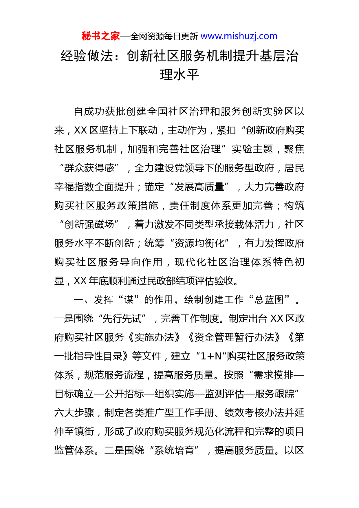 秘书之家—全网资源每日更新www.mishuzj.com经验做法:创新社区服务机制提升基层治理水平自成功获批创建全国社区治理和服务创新实验区以来,XX区坚持上下联动,主动作为,紧扣“创新政府购买社区服务机制,加强和完善社区治理”实验主题,聚焦“群众获得感”,全力建设党领导下的服务型政府,居民幸福指数全面提升;锚定“发展高质量”,大力完善政府购买社区服务政策措施,责任制度体系更加完善;构筑“创新强磁场”,着力激发不同类型承接载体活力,社区服务水平不断创新;统筹“资源均衡化”,有力发挥政府购买社区服务导向作用,现代化社区治理体系特色初显,XX年底顺利通过民政部结项评估验收。一、发挥“谋”的作用,绘制创建工作“总蓝图”。一是围绕“先行先试”,完善工作制度。制定出台XX区政府购买社区服务《实施办法》《资金管理暂行办法》《第一批指导性目录》等文件,建立“1+N”购买社区服务政策体系,规范服务流程,提高服务质量。按照“需求摸排—目标确立—公开招标—组织实施—监测评估—服务跟踪”六大步骤,制定各类推广型工作手册、绩效考核办法并延伸至镇街,形成了政府购买服务规范化流程和完整的项目监管体系。二是围绕“系统培育”,提高服务质量。以区秘书之家—全网资源每日更新www.mishuzj.com级层面投入300余万元为牵引,搭建区、街道、社区三级平台系统,引入各类枢纽型社会组织运作区中心、街道社会组织培育发展中心项目,做到区级政策引导、街道引进培育、社区使用管理。建立社会组织联席会议制度,组织社会组织专项培训,推动公益创投项目与社区服务类项目相结合,充分激发社会组织参与乡村振兴、民主协商、新型社区治理共同体建设等的动力、活力,有力提升社会组织服务社区的实操能力和项目运作质量。三是围绕“实验主题”,打造“溧质”样本。贯彻中央、省市委指示精神,对基层社区“台账多、检查多、门牌多”等现象进行专项整治,推动居委会回归自治本位。将党建引领实验区工作列入了基层党建及镇街考核内容,以社区党组织建设带动基层自治组织、经济组织、社会组织建设,逐步形成了以党委为中心,充分发挥政府行政优势、镇街和社区组织优势、社会组织专业优势,党委、政府、板块、社会有机结合的“1+3”新模式。依托社会治理智慧XX建设大框架,整合社区网格治理以及社区组织信息、阵地、文化、服务等资源,建设一体化平台,为居民群众提供高效、便捷、精准的政务服务和社区服务。二、做好“新”的文章,提升社区治理“含金量”。一是从“自发”到“自觉”,规范购买社区服务新机制。坚持需求导向、问题导向、目标导向,建立健全政府购买秘书之家—全网资源每日更新www.mishuzj.com社区服务的制度体系和“四个集成”的规范机制:制度集成,在全市率先出台政府购买社区服务的实施办法,把多年来的部门规章、部门行为,规范为区政府规章和全区统一行动,突出项目实施监管、绩效评估等实操运用。项目集成,制定了详备的第一批政府购买社区服务指导性目录,通过清单的形式回答了买什么的问题。行为集成,对全区各部门、各层级购买服务行为进行统一规范,改变了过去由街镇、社区自发购买服务的现象。标准集成,强化和规范项目资金的使用范围及标准,保障项目专业社会工作者薪酬,提升社会工作者机构参与和专业社会工作者服务热情。二是从“被动”到“主动”,呈现量质同步发展新势头。在抓好引进外来优势社会组织的同时,着力推动本土社会组织内生孵化。重点打造XX区社会组织服务中心,搭建集党建指导、人才培训、项目策划、评审评估等为一体的社会组织综合服务平台;成功培育一批如东鸿社会工作服务中心和英博社会工作服务中心等已具备一定规模的本土社会组织。目前,全区社会组织数量488个,申报等级评估社会组织122家,评出4A级1家、3A级24家、2A级及以下67家,解决了数千名社会工作者人才就业,数万名居民享受精准专业服务,并形成了系列社区项目品牌。三是从“零散”到“体系”,开拓社区多元服务新局面。以追求实现社会公共利益最大化为目标,创新公秘书之家—全网资源每日更新www.mishuzj.com共服务供给,政府基本职能以外的公共事务、公共服务可以实行购买服务,并实行准入制、清单制,通过资源下沉开展多元化社区服务,积极探索从制度优势向治理效能转化的新路径。坚持实验区建设与实施乡村振兴战略,建设新时代文明实践中心、所、站等相结合,推动实施有条件的农村专业合作社组建区域化党委和产业联盟体,带动老旧小区改造、精准扶贫脱贫、美丽乡村建设以及产业规模发展。自去年7月出现禄口机场突发疫情到目前的常态化疫情防控以来,社区从起初的匆忙应对到从容防控,全区137家社会组织中的500多名社会工作者从仓促上阵到有序参与、服务战“疫”,有效检验了多年来实验区建设沉淀的治理成果和长效治理能力,诠释了全区社区、社会建设凝聚起的众志成城、共抗疫情的正能量。三、凝聚“保”的共识,扩大建设发展“软实力”。一是强化组织保障。为确保实验区创建工作运行有力,区委、区政府制定印发《关于开展全国社区治理和服务创新实验区建设的实施意见》,成立以区委、区政府主要领导为组长的领导小组,建立实验区创