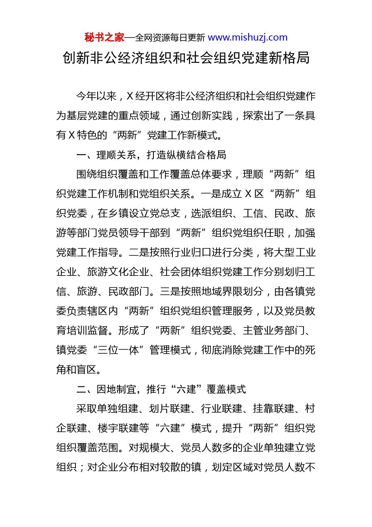 秘书之家—全网资源每日更新www.mishuzj.com创新非公经济组织和社会组织党建新格局今年以来,X经开区将非公经济组织和社会组织党建作为基层党建的重点领域,通过创新实践,探索出了一条具有X特色的“两新”党建工作新模式。一、理顺关系,打造纵横结合格局围绕组织覆盖和工作覆盖总体要求,理顺“两新”组织党建工作机制和党组织关系。一是成立X区“两新”组织党委,在乡镇设立党总支,选派组织、工信、民政、旅游等部门党员领导干部到“两新”组织党组织任职,加强党建工作指导。二是按照行业归口进行分类,将大型工业企业、旅游文化企业、社会团体组织党建工作分别划归工信、旅游、民政部门。三是按照地域界限划分,由各镇党委负责辖区内“两新”组织党组织管理服务,以及党员教育培训监督。形成了“两新”组织党委、主管业务部门、镇党委“三位一体”管理模式,彻底消除党建工作中的死角和盲区。二、因地制宜,推行“六建”覆盖模式采取单独组建、划片联建、行业联建、挂靠联建、村企联建、楼宇联建等“六建”模式,提升“两新”组织党组织覆盖范围。对规模大、党员人数多的企业单独建立党组织;对企业分布相对较散的镇,划定区域对党员人数不秘书之家—全网资源每日更新www.mishuzj.com足X人的企业联合建立党组织;在党员集聚明显的行业,采取“协会+党组织”等形式组建;对企业分布相对集中的镇,引导规模较小、党员人数不足X人的企业就近挂靠已建立党组织的企业进行组建;针对城乡结合部农村企业多,村企之间利益相互交织的情况,采取村企共建党组织的模式组建;将一幢或多幢大型商务楼宇作为一个党建单元,统一建立党组织。目前,X区共建立“两新”组织党组织X个,覆盖企业X家,其中单独建立党组织X个,联建党组织X个,今年新建“两新”组织党组织X个,覆盖率达到X%。三、积极探索,创新党员管理方法一是实行党员“五双”(双登记、双培训、双活动、双考评、双帮扶)管理方法。规定长期在非公企业工作的村级党员分别在村党支部和企业党支部进行党员信息登记,党员参加两个党支部双重培训和活动,接受双重考评。由机关优秀党员与非公企业党支部对困难户建立“双帮扶”机制,每个企业党支部联系X—X户低收入家庭进行长期帮扶,不乡村振兴不脱钩。通过实施党员“五双”管理方法,有效解决了“两新”组织党组织生活不经常的问题。二是强化流动党员管理。区“两新”组织党委分别在……等X籍党员分布较多的地区建立驻外党支部,让流动党员秘书之家—全网资源每日更新www.mishuzj.com“离乡离土不离党,高举党旗闯市场”。驻外党支部书记每季度参加“两新”组织党总支述职会议,汇报党支部开展活动、党员管理和培训等党建工作,交流党员管理,带回沿海先进地区最新产业理念、技术创新成果,推动家乡行业产业实现新的发展。三是强化党员教育保障新机制。以“共建共享、集约利用”的理念,集中有限的财力人力,建立“两新”组织党员活动中心,设置党员心灵驿站、党员“双创空间”、党员之家等党员教育活动场所,提供给“小微”企业党组织使用。同时,镇“两新”党总支定期组织党员培训,较好地解决了一些非公有制“小微”企业党建阵地和教育设施缺乏的难题。四、党建引领,发挥党组织示范带动作用一是建立“两新+帮扶”新模式。充分利用非公企业资源和优势,促进乡村振兴工作。一是实行结对帮扶,X个“两新”党组织,分包X户低收入家庭,制定帮扶措施,重点解决低收入家庭生产生活问题,增加造血功能。二是由“两新”组织党总支牵头,组织非公企业党支部捐款,建立帮扶基金,确保低收入家庭早日乡村振兴。三是提供就业岗位,“两新”组织党总支不定期发布企业用工信息,为有劳动能力和意愿的低收入家庭提供就业岗位。二是打造“党建+电商”新引擎。以党建为内生动力,秘书之家—全网资源每日更新www.mishuzj.com推动X首家“淘宝镇”建设工作。一是充分发挥党组织和党员示范带动作用,成立“淘宝”党支部,建立“淘宝镇”孵化基地,发展电子商务。共开展电子商务培训班X期,培训学员X人,指导学员开设网上店铺X家。二是定期组织党员店铺开展交流座谈和培训,力争将党员店铺打造成龙头,带领其它店铺发展壮大。三是亮明党员身份,以党员店铺作示范,公开承诺诚信经营,引导其他商铺开展诚信经营,实现持续发展。目前已经有X家党员店铺主动亮明身份,今年X-X月份实现销售收入X万元,淘宝店铺累计销售额达到X余万元。三是谱写“党建+产业”新篇章。通过“两新”党组织打造“红色引擎”,从生产方式、经营模式等方面推动企业转型升级,在企业内部掀起一线员工党员带头学先进技术热潮。开展“岗位大练兵”“技术大比武”活动,打破企业间壁垒,形成产业集聚效应,带动带活相关企业X余家,从业者约X万人,产品销售份额占全国市场X%以上,出口欧美等X多个国家和地区,实现年生产总值近X亿元,年出口创汇总额X万美元。