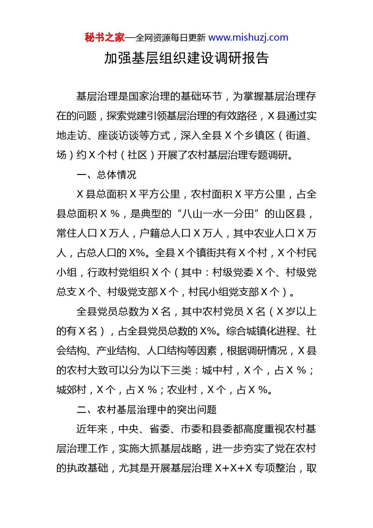 秘书之家—全网资源每日更新www.mishuzj.com加强基层组织建设调研报告基层治理是国家治理的基础环节,为掌握基层治理存在的问题,探索党建引领基层治理的有效路径,X县通过实地走访、座谈访谈等方式,深入全县X个乡镇区(街道、场)约X个村(社区)开展了农村基层治理专题调研。一、总体情况X县总面积X平方公里,农村面积X平方公里,占全县总面积X%,是典型的“八山一水一分田”的山区县,常住人口X万人,户籍总人口X万人,其中农业人口X万人,占总人口的X%。全县X个镇街共有X个村,X个村民小组,行政村党组织X个(其中:村级党委X个、村级党总支X个、村级党支部X个,村民小组党支部X个)。全县党员总数为X名,其中农村党员X名(X岁以上的有X名),占全县党员总数的X%。综合城镇化进程、社会结构、产业结构、人口结构等因素,根据调研情况,X县的农村大致可以分为以下三类:城中村,X个,占X%;城郊村,X个,占X%;农业村,X个,占X%。二、农村基层治理中的突出问题近年来,中央、省委、市委和县委都高度重视农村基层治理工作,实施大抓基层战略,进一步夯实了党在农村的执政基础,尤其是开展基层治理X+X+X专项整治,取秘书之家—全网资源每日更新www.mishuzj.com得了明显成效。由于X县农村地区地域广、差别较大,目前,农村基层治理工作中还存在着一些突出问题,具体如下:(一)农村基层治理的“两差”问题。一是基层党组织作用发挥差。当前,村(社区)“两委”干部为民服务能力弱,任期X年没有给群众留下很好的业绩,群众的生活、公共设施都无明显改进,部分农村基层党组织统揽能力、影响力不强,村民有困难首先想到的不是党组织,而是村委会或村民小组等,群众对党组织和村干部的认可度不高。二是村民自治组织力量差。村委会在农村地位比村委会高,不尊重党支部的领导。同时,农村集体经济组织普遍没有独立的班子、账户和办公场所,法人代表一般都由村委会主任兼任,村委会决定集体“三资”的处置和集体经济运作。(二)农村基层治理中的“两缺”问题。一是村干部、党员和群众之间缺乏有效沟通。一些村干部民主意识薄弱,部分群众对村务工作不知晓、不理解、不支持,干群感情生疏。目前,村民代表党员比例不高,村小组长党员比例也较低,党员与群众联系少,群众认可度低。二是村务工作监督的缺位。民主监督不完善,一些事关全村发展、村民利益的重大决策,以村主要干部碰头决定或“两委”班子讨论研究居多,少数任职时间较长、资格较老的秘书之家—全网资源每日更新www.mishuzj.com村支部书记不管大事小事都是个人说了算。村务公开不规范,公开的范围不广,公布的形式单一,公开的内容不齐全。(三)农村基层治理的“两落后”问题。一是集体经济发展落后。全县X个村,。全县年收入在X万元以下的村有X个,占X%,年收入在X万元以下的村有X个,占X%;收入为X的村有X个(龙田镇下洞村),占X%。二是农村基础设施落后。农田水利建设滞后,道路交通建设不足,教育、医疗等公共服务设施普遍缺乏,环卫设施差等等。(四)农村基层治理的“两多”问题。一是空心化村多。X处于珠三角边缘,经济发达的珠三角对农村年轻人吸引力非常大,大批青壮年外出务工,村里留下的多数是“X”部队(妇女、儿童、老人),农村出现空心化、老龄化现象。二是生态环境保护历史欠债多。随着经济发展,越来越多的乡镇企业兴起,这些企业大多是技术含量低的粗放型企业,环保措施不到位。同时,农民在从事农业生产时,科学种养知识和技术薄弱,过度依赖和过量滥用农药化肥,影响农村生态环境。(五)农村基层治理的“两涣”问题。一是民心涣散。主要体现为村民凝聚力、团结力弱,没有主心骨,村里缺乏共同的“道德约束”、民心散乱,基层“一盘散秘书之家—全网资源每日更新www.mishuzj.com沙”。二是民俗涣失。年轻人外出务工导致不少村的传统习俗工艺、民俗风情得不到有效传承,出现“后继无人”的危机。三、农村基层治理存在问题的原因分析X县农村基层治理工作存在的突出问题,原因是多方面的,综合起来,主要有五方面:(一)乡镇龙头作用未充分发挥。主要体现在三个方面:一是管理“失责”。大部分乡镇都把重点放在发展经济上,一些乡镇根本没有精力管理、服务和监督、考核行政村,影响农村基层治理效果。二是资源“失调”。大部分乡镇由于财力所迫,往往会把市、县部门每年安排用于农村基层治理的资金、资源,扣留一部分作为乡镇日常开支。三是选人“失效”。部分乡镇党委不够重视农村基层组织班子建设,没有注重后备村干部的培养,村干部年龄老化、知识结构不合理、文化素质低等问题长期得不到根本解决。(二)集体经济发展思路欠缺。一方面,村组发展集体经济的思路“模糊”。有的乡镇认为村组不具备发展集体经济的资源和条件,发展视野不开阔,大多数村的集体收入仍然沿用“大锅饭”的分配模式,以致养成农村基层干部长期不作为、不主动的惯性思维。另一方面,村组发展没有走特色经济之路。乡镇(街道)没有因地制宜研究秘书之家—全网资源每日更新www.mishuzj.com指导,以致一些村组盲目找项目、投资金,发展一些短期项目、不切合实际的种养项目和带有影响村民生产生活的污染项目,造成村组集体经济“二次负债”。(三)农村基层组织管理出现“架空”。目前,行