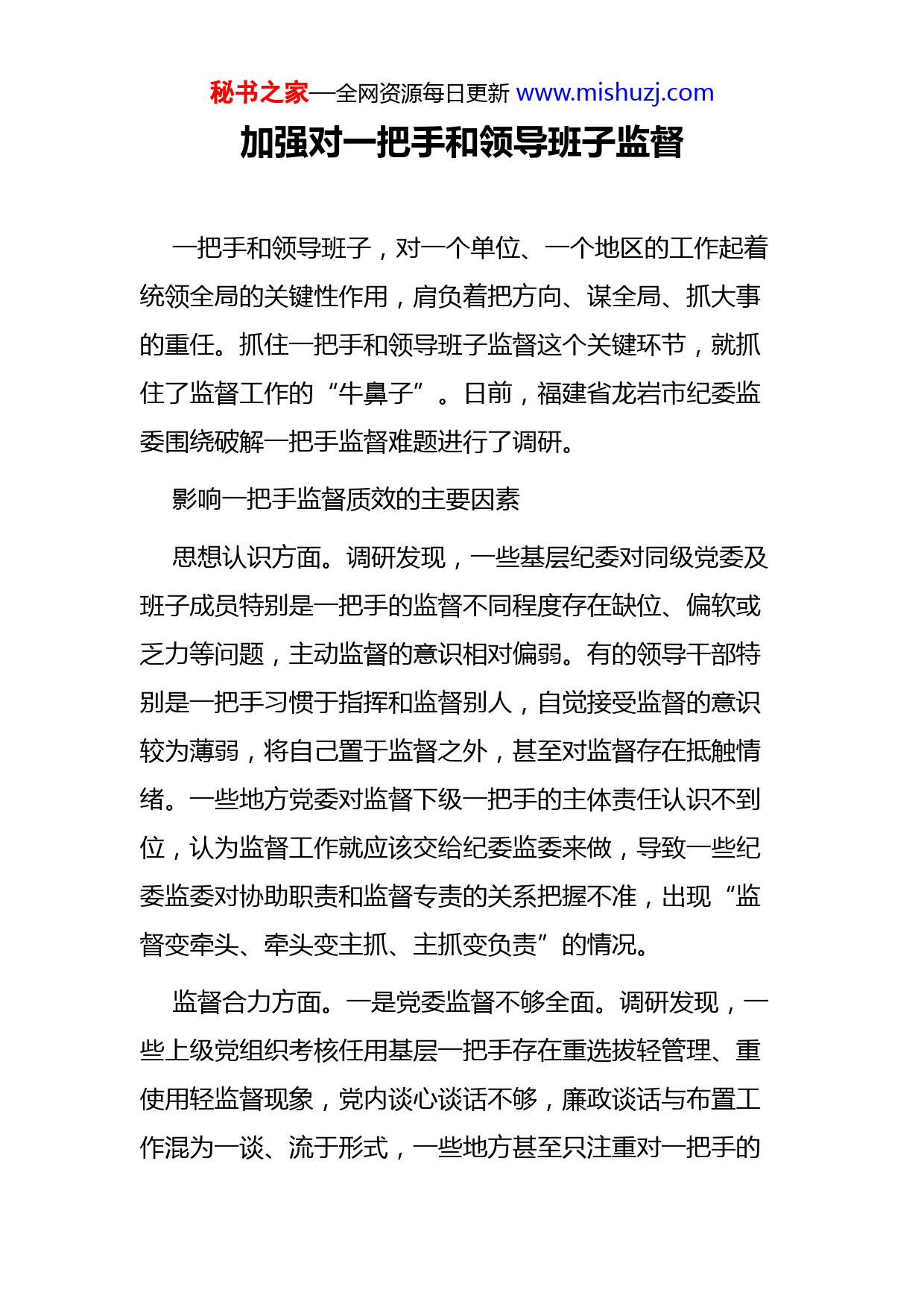 秘书之家—全网资源每日更新www.mishuzj.com加强对一把手和领导班子监督一把手和领导班子,对一个单位、一个地区的工作起着统领全局的关键性作用,肩负着把方向、谋全局、抓大事的重任。抓住一把手和领导班子监督这个关键环节,就抓住了监督工作的“牛鼻子”。日前,福建省龙岩市纪委监委围绕破解一把手监督难题进行了调研。影响一把手监督质效的主要因素思想认识方面。调研发现,一些基层纪委对同级党委及班子成员特别是一把手的监督不同程度存在缺位、偏软或乏力等问题,主动监督的意识相对偏弱。有的领导干部特别是一把手习惯于指挥和监督别人,自觉接受监督的意识较为薄弱,将自己置于监督之外,甚至对监督存在抵触情绪。一些地方党委对监督下级一把手的主体责任认识不到位,认为监督工作就应该交给纪委监委来做,导致一些纪委监委对协助职责和监督专责的关系把握不准,出现“监督变牵头、牵头变主抓、主抓变负责”的情况。监督合力方面。一是党委监督不够全面。调研发现,一些上级党组织考核任用基层一把手存在重选拔轻管理、重使用轻监督现象,党内谈心谈话不够,廉政谈话与布置工作混为一谈、流于形式,一些地方甚至只注重对一把手的秘书之家—全网资源每日更新www.mishuzj.com工作业绩特别是经济指标完成情况的监督,忽视对其思想、作风特别是廉洁自律情况的监督。二是同级监督缺少力度。有的单位班子成员信奉好人主义,对一把手不愿监督,认为多一事不如少一事,刻意回避和掩盖矛盾,无原则搞“一团和气”,即使发现问题也很少同上级部门反映;有的单位“三会一课”、民主生活会流于形式,以工作建议代替批评意见,批评与自我批评作为党内监督的有力武器没有发挥应有作用。三是“四项监督”合力有待加强。各监督主体间互相通报信息往往只涉及常规问题、苗头性和倾向性问题,深度共享不够,统筹监督不够全面有效。四是群众监督缺乏实效。虽然党务、政务公开取得一定的成效,但类似权力清单、预算资金、政府采购、工程建设、招投标等内容专业性较强,群众受限于专业知识储备,往往只能旁观、无法评判。监督质效方面。一是对象不够精准。在具体实践中,有的纪检监察机关对监督对象的边界未能很好厘清,不能做到精准识别监督对象,导致监督力量被分散弱化。二是聚焦不够精准。如,有的派驻纪检监察组过于依赖会议监督,较少针对“三重一大”等重要事项谋划开展专项监督,未能把握被监督部门的政治生态状况和一把手及班子成员履职情况,把脉问诊、对症下药的监督效果大打折扣。三是秘书之家—全网资源每日更新www.mishuzj.com方法不够精准。一些基层纪检监察机关监督方式方法单一,大多采取谈心谈话、信访举报等传统方式,难以及时发现和纠正问题,不同程度存在监督浮在表面的现象。打好一把手监督组合拳提高政治站位,增强“关键少数”自觉接受监督的意识。要紧盯一把手是否深入学习贯彻党的十九届五中全会精神,贯彻落实党中央决策部署,自觉适应新发展阶段、贯彻新发展理念、构建新发展格局,不断提高政治判断力、政治领悟力、政治执行力;是否坚持党建业务一起抓,推动形成决策科学、执行坚决、监督有力的权力运行机制;是否带头遵守党的六项纪律,带头贯彻落实中央八项规定及其实施细则精神,驰而不息反对“四风”。要着力发展健康的党内政治文化,把党史学习教育作为加强党的政治建设的重要抓手,同时不断加强警示教育,充分发挥一把手典型违纪违法案例的反面教材作用,强化通报曝光,引导督促“关键少数”加强自我监督。紧盯三个环节,对一把手用权全程监督。完善选人用人机制,严格执行《党政领导干部选拔任用工作条例》,强化对一把手和班子成员选拔动议、研究、考核、公示、谈话等环节的监督,严格把好干部选拔任用党风廉政意见回复关,健全干部带病提拔问责机制,严肃查处选人用人中秘书之家—全网资源每日更新www.mishuzj.com的不正之风。强化廉政风险防控,紧盯权力运行各环节,加强对一把手权力运行的监管,推进机构、职能、权限、程序、责任法定化,全面推行权力清单、负面清单和责任清单制度,抓好关键环节排查和重点领域防控。加强经济责任离任审计,一把手离任、转任前,组织部门要提前与审计机关沟通,保证足够时间全面审计一把手任职期间的经济责任,加大离任审计的力度,分清经济责任,使离任干部不交马虎账,下任干部不接糊涂班。压实工作责任,凝聚对一把手监督的工作合力。坚持以党内监督为主导,推动各类监督有机贯通、相互协调。督促各级党委认真贯彻落实《党委(党组)落实全面从严治党主体责任规定》,压实党委书记全面从严治党第一责任人职责和其他班子成员的“一岗双责”,定期听取下级党组织一把手工作汇报,认真参加下级班子民主生活会,通过加强检查考察、谈心谈话等方式,了解情况、发现问题,充分有效履行监督职责,层层压实全面从严治党责任。各级纪检监察机关要围绕加强对各级党组织一把手的监督,完善细化谈话提醒、述责述廉等制度,把握运用好“四种形态”,在重点查处不收敛、不收手等严重违纪违法行为的同时,也要重视审查党政一把手的一般性违纪行为,切实体现严管即是厚爱。要将组织监督关口前移,上