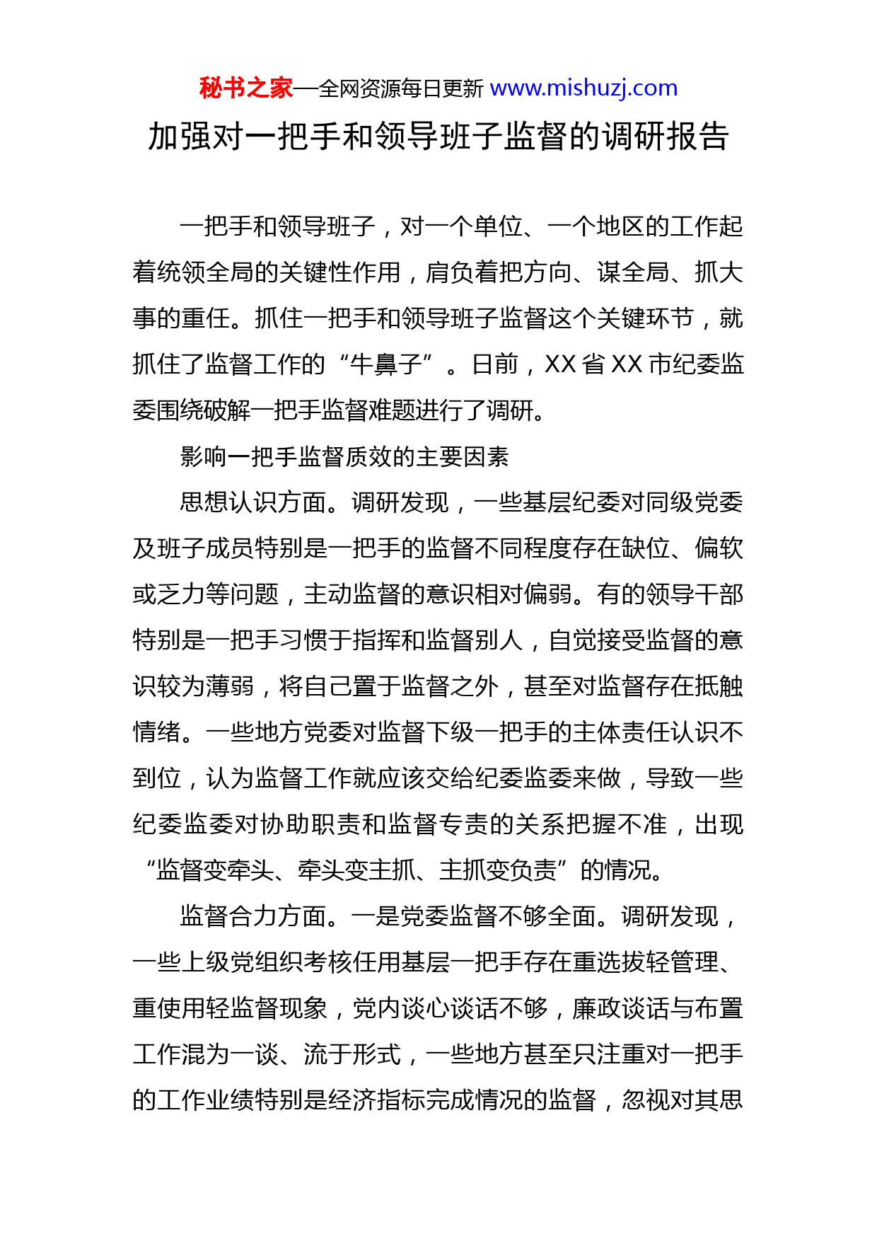 秘书之家—全网资源每日更新www.mishuzj.com加强对一把手和领导班子监督的调研报告一把手和领导班子,对一个单位、一个地区的工作起着统领全局的关键性作用,肩负着把方向、谋全局、抓大事的重任。抓住一把手和领导班子监督这个关键环节,就抓住了监督工作的“牛鼻子”。日前,XX省XX市纪委监委围绕破解一把手监督难题进行了调研。影响一把手监督质效的主要因素思想认识方面。调研发现,一些基层纪委对同级党委及班子成员特别是一把手的监督不同程度存在缺位、偏软或乏力等问题,主动监督的意识相对偏弱。有的领导干部特别是一把手习惯于指挥和监督别人,自觉接受监督的意识较为薄弱,将自己置于监督之外,甚至对监督存在抵触情绪。一些地方党委对监督下级一把手的主体责任认识不到位,认为监督工作就应该交给纪委监委来做,导致一些纪委监委对协助职责和监督专责的关系把握不准,出现“监督变牵头、牵头变主抓、主抓变负责”的情况。监督合力方面。一是党委监督不够全面。调研发现,一些上级党组织考核任用基层一把手存在重选拔轻管理、重使用轻监督现象,党内谈心谈话不够,廉政谈话与布置工作混为一谈、流于形式,一些地方甚至只注重对一把手的工作业绩特别是经济指标完成情况的监督,忽视对其思秘书之家—全网资源每日更新www.mishuzj.com想、作风特别是廉洁自律情况的监督。二是同级监督缺少力度。有的单位班子成员信奉好人主义,对一把手不愿监督,认为多一事不如少一事,刻意回避和掩盖矛盾,无原则搞“一团和气”,即使发现问题也很少同上级部门反映;有的单位“三会一课”、民主生活会流于形式,以工作建议代替批评意见,批评与自我批评作为党内监督的有力武器没有发挥应有作用。三是“四项监督”合力有待加强。各监督主体间互相通报信息往往只涉及常规问题、苗头性和倾向性问题,深度共享不够,统筹监督不够全面有效。四是群众监督缺乏实效。虽然党务、政务公开取得一定的成效,但类似权力清单、预算资金、政府采购、工程建设、招投标等内容专业性较强,群众受限于专业知识储备,往往只能旁观、无法评判。监督质效方面。一是对象不够精准。在具体实践中,有的纪检监察机关对监督对象的边界未能很好厘清,不能做到精准识别监督对象,导致监督力量被分散弱化。二是聚焦不够精准。如,有的派驻纪检监察组过于依赖会议监督,较少针对“三重一大”等重要事项谋划开展专项监督,未能把握被监督部门的政治生态状况和一把手及班子成员履职情况,把脉问诊、对症下药的监督效果大打折扣。三是方法不够精准。一些基层纪检监察机关监督方式方法单一,大多采取谈心谈话、信访举报等传统方式,难秘书之家—全网资源每日更新www.mishuzj.com以及时发现和纠正问题,不同程度存在监督浮在表面的现象。打好一把手监督组合拳提高政治站位,增强“关键少数”自觉接受监督的意识。要紧盯一把手是否深入学习贯彻党的十九届五中全会精神,贯彻落实党中央决策部署,自觉适应新发展阶段、贯彻新发展理念、构建新发展格局,不断提高政治判断力、政治领悟力、政治执行力;是否坚持党建业务一起抓,推动形成决策科学、执行坚决、监督有力的权力运行机制;是否带头遵守党的六项纪律,带头贯彻落实中央八项规定及其实施细则精神,驰而不息反对“四风”。要着力发展健康的党内政治文化,把党史学习教育作为加强党的政治建设的重要抓手,同时不断加强警示教育,充分发挥一把手典型违纪违法案例的反面教材作用,强化通报曝光,引导督促“关键少数”加强自我监督。紧盯三个环节,对一把手用权全程监督。完善选人用人机制,严格执行《党政领导干部选拔任用工作条例》,强化对一把手和班子成员选拔动议、研究、考核、公示、谈话等环节的监督,严格把好干部选拔任用党风廉政意见回复关,健全干部带病提拔问责机制,严肃查处选人用人中的不正之风。强化廉政风险防控,紧盯权力运行各环节,加强对一把手权力运行的监管,推进机构、职能、权秘书之家—全网资源每日更新www.mishuzj.com限、程序、责任法定化,全面推行权力清单、负面清单和责任清单制度,抓好关键环节排查和重点领域防控。加强经济责任离任审计,一把手离任、转任前,组织部门要提前与审计机关沟通,保证足够时间全面审计一把手任职期间的经济责任,加大离任审计的力度,分清经济责任,使离任干部不交马虎账,下任干部不接糊涂班。压实工作责任,凝聚对一把手监督的工作合力。坚持以党内监督为主导,推动各类监督有机贯通、相互协调。督促各级党委认真贯彻落实《党委(党组)落实全面从严治党主体责任规定》,压实党委书记全面从严治党第一责任人职责和其他班子成员的“一岗双责”,定期听取下级党组织一把手工作汇报,认真参加下级班子民主生活会,通过加强检查考察、谈心谈话等方式,了解情况、发现问题,充分有效履行监督职责,层层压实全面从严治党责任。各级纪检监察机关要围绕加强对各级党组织一把手的监督,完善细化谈话提醒、述责述廉等制度,把握运用好“四种形态”,在重点查处不收敛、不收手等严重违纪违法行为的同时,也要重视审查党政一把手的一般性违纪行为,切实体现严管即是厚爱。要将组织监督关口前