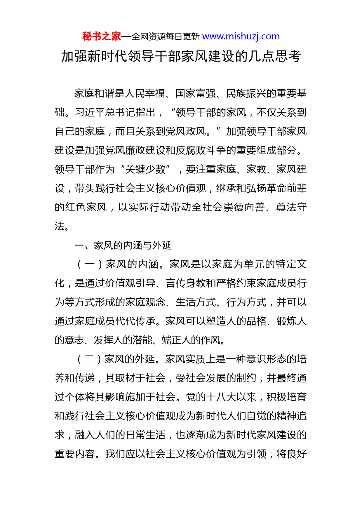 秘书之家—全网资源每日更新www.mishuzj.com加强新时代领导干部家风建设的几点思考家庭和谐是人民幸福、国家富强、民族振兴的重要基础。习近平总书记指出,“领导干部的家风,不仅关系到自己的家庭,而且关系到党风政风。”加强领导干部家风建设是加强党风廉政建设和反腐败斗争的重要组成部分。领导干部作为“关键少数”,要注重家庭、家教、家风建设,带头践行社会主义核心价值观,继承和弘扬革命前辈的红色家风,以实际行动带动全社会崇德向善、尊法守法。一、家风的内涵与外延(一)家风的内涵。家风是以家庭为单元的特定文化,是通过价值观引导、言传身教和严格约束家庭成员行为等方式形成的家庭观念、生活方式、行为方式,并可以通过家庭成员代代传承。家风可以塑造人的品格、锻炼人的意志、发挥人的潜能、端正人的作风。(二)家风的外延。家风实质上是一种意识形态的培养和传递,其取材于社会,受社会发展的制约,并最终通过个体将其影响施加于社会。党的十八大以来,积极培育和践行社会主义核心价值观成为新时代人们自觉的精神追求,融入人们的日常生活,也逐渐成为新时代家风建设的重要内容。我们应以社会主义核心价值观为引领,将良好秘书之家—全网资源每日更新www.mishuzj.com家风建设与营造优良党风、廉洁政风、和谐社风、淳朴民风、文明乡风、向上学风相结合,加强社会公德、职业道德、家庭美德、个人品德建设,以家风建设助力作风涵养,以家庭和睦引领社会和谐。二、新时代加强领导干部家风建设的理论与实践来源(一)传统文化基因:中华传统家风文化。家风是中国传统文化的重要元素,浓缩了中华民族的传统美德。所谓“积善之家,必有余庆;积不善之家,必有余殃”。古人认为家风对个人成长至关重要。《大学》有言,“古之欲明明德于天下者,先治其国;欲治其国者,先齐其家”。建设良好家风是修身、治国、明德的基础和前提。(二)深厚理论基石:马克思主义家庭观。马克思在《德意志意识形态》中指出,“夫妻之间的关系,父母和子女的关系,也就是家庭。这种家庭起初是唯一的社会关系。”恩格斯在《家庭、私有制和国家的起源》中指出,一定历史时代和一定地区内的人们生活于其下的社会制度,受着两种生产的制约:一方面受劳动的发展阶段的制约,另一方面受家庭的发展阶段的制约。马克思主义经典著作为家风建设提供了的深邃理论基础,对于加强新时代领导干部家风建设具有较强指导意义。(三)实践基础:红色家风的传承。老一辈无产阶级革命家在革命、建设、改革的实践中形成了红色家风。它秘书之家—全网资源每日更新www.mishuzj.com涵盖了老一辈共产党人崇高的共产主义理想与坚定的马克思主义立场;为中国人民谋幸福、为中华民族谋复兴的初心使命;以身作则、率先垂范,对子女严格培养,不搞特殊化的高尚品格等。毛泽东、周恩来、朱德等老一辈无产阶级革命家通过言传身教诠释着红色家风的深厚内涵。三、新时代加强领导干部家风建设的重要意义(一)有利于营造风清气正的政治生态。领导干部的家风,不是个人小事、家庭私事,而是领导干部作风的重要表现。事实表明,一些领导干部出现贪腐和违纪问题,根源往往在于家风不正。从领导干部的家风建设抓起,把家风建设作为领导干部作风建设的重要内容,有助于从根源上筑牢思想防线,提高领导干部拒腐防变的能力,推动形成风清气正的政治生态。(二)有利于形成崇德向善的社会风尚。习近平总书记指出,“千家万户都好,国家才能好,民族才能好。”家庭是社会的基本细胞,也是人生的第一所学校。领导干部带头注重家庭、家教、家风,培育和弘扬社会主义核心价值观,有助于实现以家风建设培育民风、带动社风的目标,进而使千千万万个家庭成为国家发展、民族复兴、社会和谐的重要基点,有力推进社会主义精神文明建设,推动形成崇德向善的社会风尚。(三)有利于推进新时代公民道德建设。新时代公民秘书之家—全网资源每日更新www.mishuzj.com道德建设包括家庭美德、职业道德、社会公德、个人品德等方面,与家风建设息息相关。只有注重家庭、端正家风、严格家教,才能培养出对党忠诚、顾全大局、为民服务、与时俱进、追求卓越的社会主义建设者和接班人;才能更好践行社会主义核心价值观,不断提升道德素养;才能有效发挥道德建设的示范作用,推动社会文明程度提升。四、新时代加强领导干部家风建设的实践路径(一)丰富领导干部家风建设形式。一是完善家训。领导干部可以参照历史名人的治家之道、治家理念、治家格言完善家训。二是健全家规。家规是约束家庭成员的行为准则,新时代领导干部要在继承红色家风的同时,健全家规。三是经常与家人谈心谈话。要了解家庭成员的思想状况,引导家人牢固树立社会主义核心价值观,坚决抵制拜金主义、享乐主义等腐朽思想。(二)列出领导干部家风建设正负面清单。一是列出家风建设的目标事项清单。明确责任和目标,设定完成期限,推动领导干部有步骤、有计划地完成家风建设各项任务和目标。二是列出家风建设负面清单。对于家庭成员可能出现的不良行为,领导干部要采取有效应对措施。完善家风建设闭环管理,出现问题要反思总结,及时改正。(三)强化领导干部家风建设的监