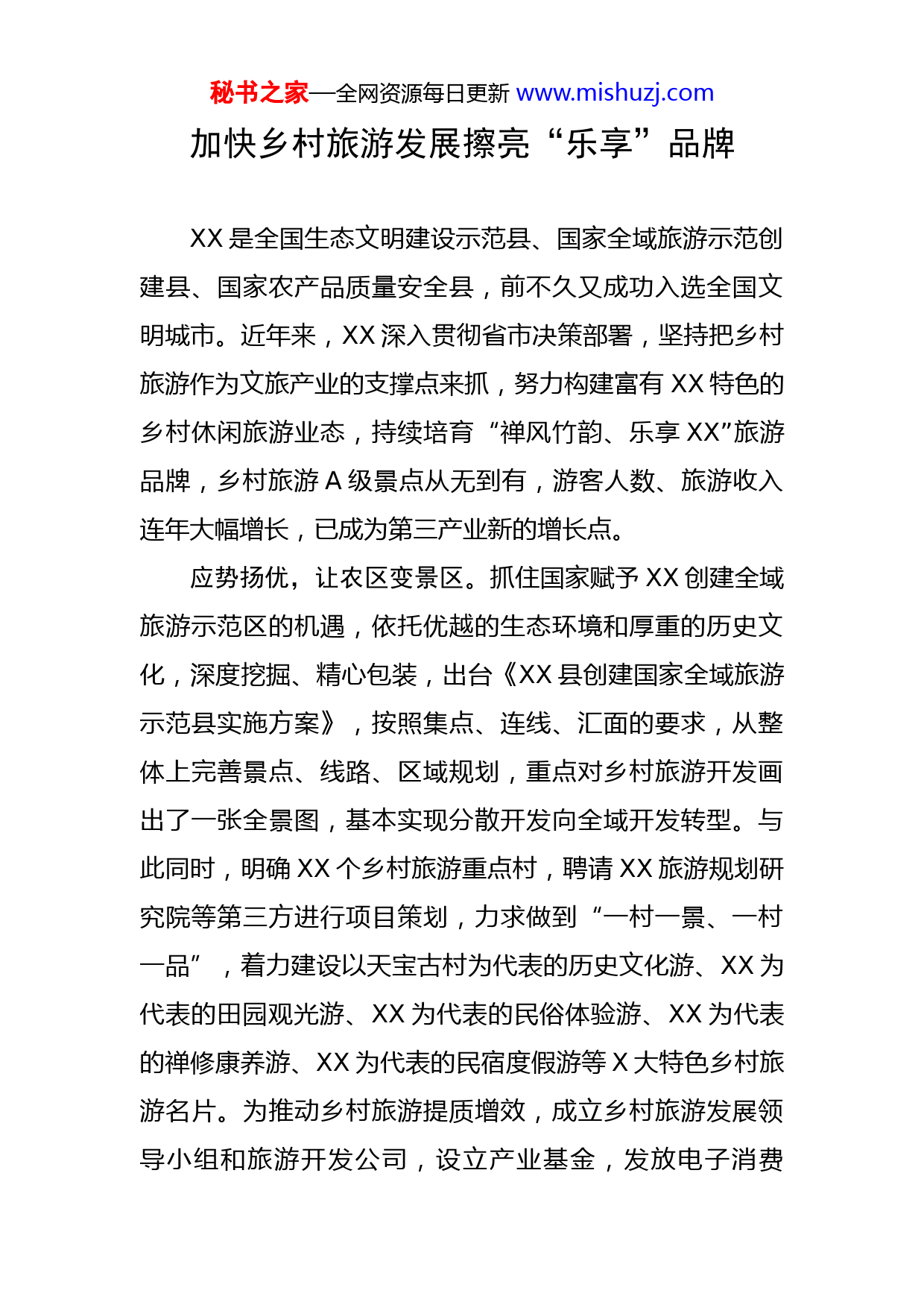 秘书之家—全网资源每日更新www.mishuzj.com加快乡村旅游发展擦亮“乐享”品牌XX是全国生态文明建设示范县、国家全域旅游示范创建县、国家农产品质量安全县,前不久又成功入选全国文明城市。近年来,XX深入贯彻省市决策部署,坚持把乡村旅游作为文旅产业的支撑点来抓,努力构建富有XX特色的乡村休闲旅游业态,持续培育“禅风竹韵、乐享XX”旅游品牌,乡村旅游A级景点从无到有,游客人数、旅游收入连年大幅增长,已成为第三产业新的增长点。应势扬优,让农区变景区。抓住国家赋予XX创建全域旅游示范区的机遇,依托优越的生态环境和厚重的历史文化,深度挖掘、精心包装,出台《XX县创建国家全域旅游示范县实施方案》,按照集点、连线、汇面的要求,从整体上完善景点、线路、区域规划,重点对乡村旅游开发画出了一张全景图,基本实现分散开发向全域开发转型。与此同时,明确XX个乡村旅游重点村,聘请XX旅游规划研究院等第三方进行项目策划,力求做到“一村一景、一村一品”,着力建设以天宝古村为代表的历史文化游、XX为代表的田园观光游、XX为代表的民俗体验游、XX为代表的禅修康养游、XX为代表的民宿度假游等X大特色乡村旅游名片。为推动乡村旅游提质增效,成立乡村旅游发展领导小组和旅游开发公司,设立产业基金,发放电子消费秘书之家—全网资源每日更新www.mishuzj.com券,将文旅产业发展纳入全县高质量发展综合考评。目前全县已打造出X个XA、X个XA、X个XA级乡村旅游点,其中X入选中国美丽休闲乡村、中国秀美乡村百佳范例。XX旅游集团投资XX亿元的天宝古城、投资X.X亿元由XX温泉旅游投资集团和我县共同打造的XX温泉酒店等重点项目正在全力推进。融合带动,让产业变主业。注重发挥乡村旅游的综合带动功能,拓展深度融合发展的新业态。与秀美乡村同频。坚持乡村旅游点优先建设秀美乡村,按照“X+X”建设模式,集成历史文化、产业支撑等要素,建成XX个宜居宜业宜游的秀美乡村。以旅强农和借农强旅双促进,按照A级景区标准,新建鲁盛富硒蔬菜产业园等X个农旅综合体和九天中草药科普教育基地等X个研学基地,较好丰富了乡村旅游产品供给。与民宿产业共进。依托特色民风民俗和文化风情,尽量保持完整的传统乡村风貌,因地制宜发展民宿产业。出台《民宿管理和产业扶持办法》,设立XXXX万元产业发展基金,设定乡村星级民宿评定标准,建成精品民宿、客栈XX家XXX间,同时培育包装“一地一味”的饮食品牌,推出民宿“五道茶”“竹乡宴”“八碗八碟二点”等“必点菜”,尽量满足游客多样性需求。与农民增收双赢。充分发挥农民主体作用,通过旅游开发联合体、公司+集体经济合作社等模式,发展特产种养、瓜果秘书之家—全网资源每日更新www.mishuzj.com采摘等产业项目,培育特色鲜明的文旅产品,国家地理标志产品竹笋、蜂蜜、省级非遗老字号天宝罗酒、黄岗味道小吃等土特产品年销售额近XX亿元,带动XXXX多户贫困户持续增收。擦亮品牌,让看点变卖点。以游客体验和市场拓展为中心,完善基础设施和景区景点建设,升级服务管理和市场营销,提高XX乡村旅游的美誉度和知名度。精细化配套基础。按照“快旅慢游”理念,新建改建旅游公路X条XX.X公里,游步道、骑行线XX公里,旅游厕所和城乡公厕XXX座。结合农村人居环境综合整治,对乡村旅游点周边、通道沿线开展综合治理,建成X条美丽示范风景线和XXXX多个美丽庭院。标准化规范市场。设立乡村旅游经营主体准入标准和诚信等级评定,落实安全生产、食品商品常态监管,培训“明星服务员”“金牌导游员”XXXX人次,对旅游市场违法违规行为“零容忍”打击。立体化推介营销。线上线下融合推介,让更多人到XX乡村感受美的风光、收获美的发现。先后在XX、XX等地举办X场旅游推介会,在XX机场、XX地铁X号线等地投放形象广告,策划“北纬XX度·乐享XX”网上直播,在XX文化园拍摄的芒果TV亲子节目《XX》X期节目总播放量突破X亿次,每年组织XX节、XX节、XX节等X个乡村旅游文化节,在乡村旅游点举办全国农耕健身大赛、全国垂钓巡回赛等秘书之家—全网资源每日更新www.mishuzj.com多项体育运动赛事,有力提升了品牌影响力。