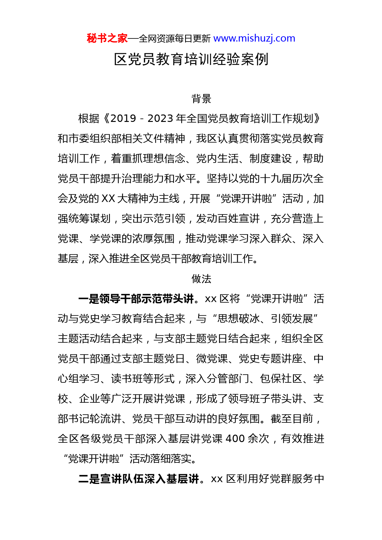 秘书之家—全网资源每日更新www.mishuzj.com区党员教育培训经验案例背景根据《2019-2023年全国党员教育培训工作规划》和市委组织部相关文件精神,我区认真贯彻落实党员教育培训工作,着重抓理想信念、党内生活、制度建设,帮助党员干部提升治理能力和水平。坚持以党的十九届历次全会及党的XX大精神为主线,开展“党课开讲啦”活动,加强统筹谋划,突出示范引领,发动百姓宣讲,充分营造上党课、学党课的浓厚氛围,推动党课学习深入群众、深入基层,深入推进全区党员干部教育培训工作。做法一是领导干部示范带头讲。xx区将“党课开讲啦”活动与党史学习教育结合起来,与“思想破冰、引领发展”主题活动结合起来,与支部主题党日结合起来,组织全区党员干部通过支部主题党日、微党课、党史专题讲座、中心组学习、读书班等形式,深入分管部门、包保社区、学校、企业等广泛开展讲党课,形成了领导班子带头讲、支部书记轮流讲、党员干部互动讲的良好氛围。截至目前,全区各级党员干部深入基层讲党课400余次,有效推进“党课开讲啦”活动落细落实。二是宣讲队伍深入基层讲。xx区利用好党群服务中秘书之家—全网资源每日更新www.mishuzj.com心、新时代文明实践站等具有群众基础的教育基地和教学点,发挥好基层党组织凝聚力、创造力、战斗力,从党员干部群众中发现有信仰、有理想、有担当、有情怀的先进人物和典型代表,成立党委宣讲团、青年宣讲团、百姓宣讲队。盘活资源,了解“身边事”,认识“身边人”,用“小故事”讲述“大道理”,向先进学习,向榜样靠拢,示范引领推动形成“人人想讲、人人会讲、人人讲好”的良好风尚。其中,老战士xxx、xxx、xxx等走上讲台,与辖区党员群众分享自己亲历的革命故事,进一步弘扬了伟大的革命精神。xxx社区在党50年老党员xxx深入各社区讲述自身的入党故事,与社区干部共同追忆入党初心。宣讲团成员深入xxx社区,为辖区青少年开展“学党史、知党情、童心向党树美德”党课宣讲活动,向青少年讲好党史,传承红色基因。三是多措并举创新形式讲。xx区适应新时代新要求,积极创新内容、形式和方法,综合运用网上专栏、云上党课等形式,把线下学习与线上交流相结合,把书面学和互动学相结合,增强党课活力动力。区委理论中心组成员参观走访xxx纪念馆,聆听时代楷模、全国优秀共产党员xxx一心为民、艰苦朴素、廉洁奉公的先进事迹;xxx社区全体党员干部利用“学习强国”xxx公众号等党史栏目,学习交流“党史百年天天读”“党史故事”“红色印象”秘书之家—全网资源每日更新www.mishuzj.com等内容。积极筹划了庆祝建党百年红色记忆城市定向赛活动,组织辖区党员干部寻找红色记忆,激发干事创业热情。依托辖区红色阵地,构建开放式学习载体。各级党组织充分利用xxx纪念馆、xxx机修厂工人俱乐部等红色资源,组织辖区党员走入红色阵地,以“学习党的宝贵精神财富”为主题开设“红色课堂”,缅怀革命英烈、先锋楷模,在学思践悟中传承红色力量。xxx社区组织党员前往xxx民俗馆,透过老物件宣讲艰苦奋斗的时代记忆。利用辖区资源,开展精准化党课学习。充分发挥专家学者、下沉党员力量,根据社区、企业、机关、学校等不同领域、不同群体党组织的实际情况,开展主题突出、特色鲜明的学习教育,不断提高党课的针对性、实效性。xx区“两新”党工委指导xxx开展专题党课,邀请xxx教授进行授课,并组织企业党员分享党史经典小故事,引导党员干部边学、边看、边听、边思考,共同感悟“红色故事”,追寻“红色记忆”。启示(一)压实责任,强化党员教育培训重要性。坚持把学习贯彻《2019-2023年全国党员教育培训工作规划》作为一项重要工作来抓,进一步强化各级党组织负责人抓基层党建工作责任制,引导全区党员积极参学,牢固树立历史使命感和社会责任感,做到信念坚定、对党忠诚,勤秘书之家—全网资源每日更新www.mishuzj.com学苦练、增强本领。严肃工作纪律,转变工作作风,发扬马克思主义优良学风,把党员培训教育同增强业务能力和提升基层治理能力有机结合起来,坚决克服形式主义、官僚主义,确保学习教育各项任务落到实处、取得实效。(二)创新载体,增强党员教育培训针对性。创新党员教育方式,依托“党课开讲啦”、微党课等活动,对不同对象进一步明确党员教育培训的目标要求、重点内容,不断增强针对性和实效性。针对行动不便的老党员,通过送学上门,一对一授课,结对帮扶等方式,加强心理疏导和人文关怀,帮助解决实际问题,增强党员政治荣誉感、组织归属感。针对流动党员,依托“学习强国”学习平台、学习群等载体,精准推送教育内容。针对在职党员,运用“相互交流”“现场教学”等教学方法,做到“考察、实践、调查报告”相结合,充分调动学员的主动性和创造性。针对“两新”组织党员,以生产管理和党务基础知识为主开展专题培训,同时,以xxx为龙头,不定期开展交流推进会,实现组织共建、资源共享、难题共解,全力打通基层党员教育、管理、服务“最后一公里”。(三)重视规律,提高党员教育培训的实效性。整合各类资源,加强分类指导,根据实际情况建立师资库、课程库、资源库,夯实党员教育特色化基础,加强对党务干部抓党员教育的素质能力提升培训,引导党务干部结合工秘