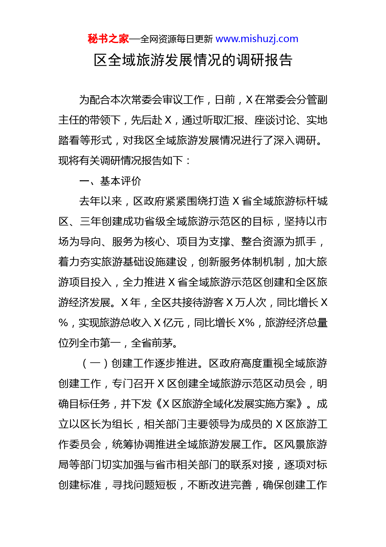 秘书之家—全网资源每日更新www.mishuzj.com区全域旅游发展情况的调研报告为配合本次常委会审议工作,日前,X在常委会分管副主任的带领下,先后赴X,通过听取汇报、座谈讨论、实地踏看等形式,对我区全域旅游发展情况进行了深入调研。现将有关调研情况报告如下:一、基本评价去年以来,区政府紧紧围绕打造X省全域旅游标杆城区、三年创建成功省级全域旅游示范区的目标,坚持以市场为导向、服务为核心、项目为支撑、整合资源为抓手,着力夯实旅游基础设施建设,创新服务体制机制,加大旅游项目投入,全力推进X省全域旅游示范区创建和全区旅游经济发展。X年,全区共接待游客X万人次,同比增长X%,实现旅游总收入X亿元,同比增长X%,旅游经济总量位列全市第一,全省前茅。(一)创建工作逐步推进。区政府高度重视全域旅游创建工作,专门召开X区创建全域旅游示范区动员会,明确目标任务,并下发《X区旅游全域化发展实施方案》。成立以区长为组长,相关部门主要领导为成员的X区旅游工作委员会,统筹协调推进全域旅游发展工作。区风景旅游局等部门切实加强与省市相关部门的联系对接,逐项对标创建标准,寻找问题短板,不断改进完善,确保创建工作秘书之家—全网资源每日更新www.mishuzj.com有序推进。为了更好地发展旅游经济,今年专门成立文旅集团,进一步推动提升我区整体旅游品质。(二)科学规划强化统筹。区政府坚持以规划引领全域旅游发展。在《X区休闲旅游“十四五”规划》的引领下,编制X等规划。通过规划引领,不断加强特色小镇、乡村旅游创建,形成“一心两翼”的总体发展格局。(三)项目建设加快实施。近年来,区政府以大平台、大项目建设为载体,聚焦X等重点板块,加快推进X镇、兰里景区、现代农业产业园等项目开发建设,为我区创建奠定了良好的基础。切实加大扶持力度,出台《X区加快旅游业发展扶持意见》等政策,促进旅游设施提升改造,帮助旅游项目做大做强,推动旅游产业转型升级,提升了我区旅游产品的品质和美誉度。(四)旅游环境不断优化。以全域土地综合整治、小城镇综合整治、美丽乡村建设为主要内容的美丽X行动纵深推进。X镇九街正式开街,X小镇成功创建国家XA级旅游景区,X镇和艺创小镇通过国家XA景区景观质量等级评价,全区X个村社成功创建X省A级景区村,玉泉社区创建成为X省休闲旅游示范村,景区景点不断增多。道路交通、标识标牌、集散中心等基础配套不断完善,深入推进“厕所革命”,旅游服务设施逐步优化。(五)品牌形象显著提升。创新打造节庆活动,探索秘书之家—全网资源每日更新www.mishuzj.com发展市场化、多主体的办节新模式,激发各类主体做旅积极性,各类特色节庆活动丰富多彩,精彩纷呈。积极组织旅游企业到重点客源地开展旅游推介活动,广泛推广X旅游产品,树立了良好的品牌形象。加强与网络、电台媒体以及电信运营商等商业媒介的合作,有效增强了营销宣传效果,提升了X旅游品牌的知名度和影响力。二、存在问题我区全域旅游发展虽然取得了明显成效,但对标《X省全域旅游示范区认定标准》以及打造X省全域旅游标杆城区总目标,依然存在一些不足,有待进一步改进和提升。(一)体制机制有待完善1、合力兴旅机制还需完善。尽管建立了全域旅游工作领导小组,但体制机制尚不够健全。全域旅游发展理念的认识还不深,工作力度还要加强。各镇街对自身作为旅游经济主体的认识有待提高,对全域旅游建设的积极性与参与度有待进一步提升。2、考核激励力度还需加大。目前对镇街年度目标综合考评中,旅游休闲经济发展工作相对其他经济工作考核权重较轻(X分占X分),激励作用不明显。(二)基础保障有待加强1、资金投入和用地难题亟待破解。近年,区政府出台了一些旅游产业扶持政策,每年安排扶持资金X万,用于秘书之家—全网资源每日更新www.mishuzj.com扶持旅游企业做大做强,但与萧山、淳安等地相比扶持力度还不够大。相关单位对盘活存量土地用于旅游发展的探索不足,特别是如何合理盘活利用村集体存量建设用地,用于旅游发展的尝试不够,这也在一定程度上影响了旅游项目的落地推进和旅游产业的发展。2、基础设施配套不足。公共服务体系有待加强,景区景点附近、高速入城口和主要道路周边,旅游交通标识标牌不够完善。厕所革命有待深化。景区厕所布局不够合理,不利于旅游厕所规范化管理。部分基础设施建设未能充分考虑满足旅游的需求。如X等地在开展生活污水治理时,终端污水处理设计容量仅考虑满足农户日常生活污水排放量,而随着农家乐、民宿的兴起,污水排放量急剧增长,部分村社污水排放已远超设计处理容量,对生态环境保护带来不利影响。(三)产业培育力度有待加大1、项目建设不够快。兰里景区因前期可行性研究不够深入充分,当前又由于作为景区核心的台湾五生现代农业产业园建设较为缓慢,景区建设管理工作困难较大。蓝城农业产业园目前也未按预期目标开展大规模的农业观光项目建设和运营,对区域旅游的拉动效应尚未真正体现。2、旅游内涵不够丰富。旅游与自然资源、人文资源相融合还需进一步提升。比如翠苑一区作为时任X省委书记秘书之家—全网资源每日更新www.mishuzj.com习近平同志的基层联系点,相关部门发展红色旅游的意识不够强,没有很好地进行规划成