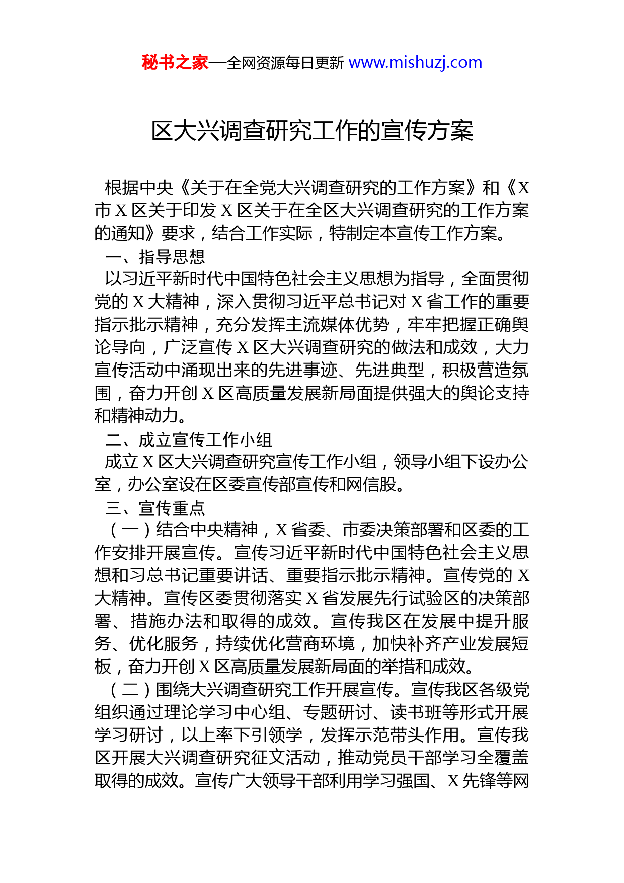 秘书之家—全网资源每日更新www.mishuzj.com区大兴调查研究工作的宣传方案根据中央《关于在全党大兴调查研究的工作方案》和《X市X区关于印发X区关于在全区大兴调查研究的工作方案的通知》要求,结合工作实际,特制定本宣传工作方案。一、指导思想以习近平新时代中国特色社会主义思想为指导,全面贯彻党的X大精神,深入贯彻习近平总书记对X省工作的重要指示批示精神,充分发挥主流媒体优势,牢牢把握正确舆论导向,广泛宣传X区大兴调查研究的做法和成效,大力宣传活动中涌现出来的先进事迹、先进典型,积极营造氛围,奋力开创X区高质量发展新局面提供强大的舆论支持和精神动力。二、成立宣传工作小组成立X区大兴调查研究宣传工作小组,领导小组下设办公室,办公室设在区委宣传部宣传和网信股。三、宣传重点(一)结合中央精神,X省委、市委决策部署和区委的工作安排开展宣传。宣传习近平新时代中国特色社会主义思想和习总书记重要讲话、重要指示批示精神。宣传党的X大精神。宣传区委贯彻落实X省发展先行试验区的决策部署、措施办法和取得的成效。宣传我区在发展中提升服务、优化服务,持续优化营商环境,加快补齐产业发展短板,奋力开创X区高质量发展新局面的举措和成效。(二)围绕大兴调查研究工作开展宣传。宣传我区各级党组织通过理论学习中心组、专题研讨、读书班等形式开展学习研讨,以上率下引领学,发挥示范带头作用。宣传我区开展大兴调查研究征文活动,推动党员干部学习全覆盖取得的成效。宣传广大领导干部利用学习强国、X先锋等网秘书之家—全网资源每日更新www.mishuzj.com“”络学习平台,通过三会一课、主题党日等方式,对标对表常态学,进一步解放思想。宣传我区各级领导干部聚焦X“”区重点开发两翼、三大片“”区,紧密结合部署开展的服务工业企业突破攻坚年等开展深调研、解决实际问题以及调研成果转化的情况。宣传各级各部门在深入乡村振兴、项目建设、环境治理、窗口服务、企业生产经营等一线中涌现出来的先进典型,展现我区广大党员干部进一步转变作风、敢为先勇担当善作为的良好精神风貌。宣传各级各部门推动各项工作任务补短“”“”板强弱项的思路措施,以小切口取得深突破的实际成“”效,推动全区经济高质量发展的样板。宣传全区广大党“”员干部在深调研中坚持问题导向,对发现的问题不等不靠、即知即改、立行立改的好经验好典型,勇于自我解剖、直面矛盾问题、对标先进榜样、提高能力水平、狠抓工作落实的责任感紧迫感。“”宣传我区各级党组织深化放管服改革、积极构“”“”“建亲清新型政商关系,推动重大项目建设、开展企业”服务年活动中,以优化服务提升营商环境、助推纾困解难的最新做法、取得的成果和敢于担当、攻坚克难的精神状态和工作作风。宣传报道企业对改善营商环境的反馈反映,群众对解决热点难点问题的切身体会等鲜活的实例,诠释我区营商环境建设工作成果。多渠道、多方式宣传对优化营商环境有突出贡献的个人和企业的先进事迹,着力营造人人都是营商环境、处处都是营商环境、事事都是营商环境、时时都是营商环境的舆论氛围。宣传中央、X省委、市委和区委关于激励干部担当作为的新部署新要求。宣传我区出台的激励干部担当作为的政策制度和激励措施。围绕组织担当、干部担当、人才担当三个重点,深入挖掘宣传在全区各级各部门各行业中涌现出的先进典型,深入宣传一批专业技术拔尖人才、X名师、X名医、X工匠、最美科技工作者等先进典型。宣传我区实施秘书之家—全网资源每日更新www.mishuzj.com人才强基工作的做法和成效。宣传我区推进全面脱贫与乡村振兴有效衔接,积极培养农村实用型人才的进展情况和“”取得的成效。坚持正向激励主基调,通报昏庸懒散拖反“面案例,释放有为者有位、吃苦者吃香、流血流汗牺牲者”流芳的正向效应,引导干部乐于担当,在全区营造勇于负责担当、争相干事创业的浓厚氛围。四、工作职责各镇街和各部门在宣传报道中要紧扣活动主题,充分利用本部门宣传平台(微信公众号、官方网站等),开设活动专题专栏,突出宣传本地区本单位的好思路、好做法和好经验。(一)区委宣传部:“按照效率要高、节奏要快、密度要”大、质量要精的要求,精心制定宣传方案,对每一项重大部署、每一项重点工作、每一个重要节点,制定详细宣传报道计划和方案,加强统筹协调组织市级新闻媒体进行全方位宣传报道。深入挖掘各级各部门工作亮点,提炼总结典型经验,宣传活动中涌现出来的先进事迹、先进典型。加大对外宣传力度,主动加强与中央、X省级新闻媒体的沟通联系,积极邀请上级媒体到X采访报道,力争在人民日报、中央广播电视总台、X省日报、X省广播电视台等主流媒体多上稿件,扩大活动影响力。(二)区活动领导小组办公室:负责收集汇总各级各部门推进活动的信息素材,及时提供给区委宣传部,每月统计数量汇编全区宣传报道采用情况统计表,及时通报各级各部门活动开展情况及宣传动态,并适时向活动领导小组反馈情况。联合区委宣传部每月设定若干主题,向各级各部门约稿、组稿,配合区委宣传部向上级媒体推送稿件。(三)区四项措施工作专班:及时收集各参加单位开展活动的亮点素