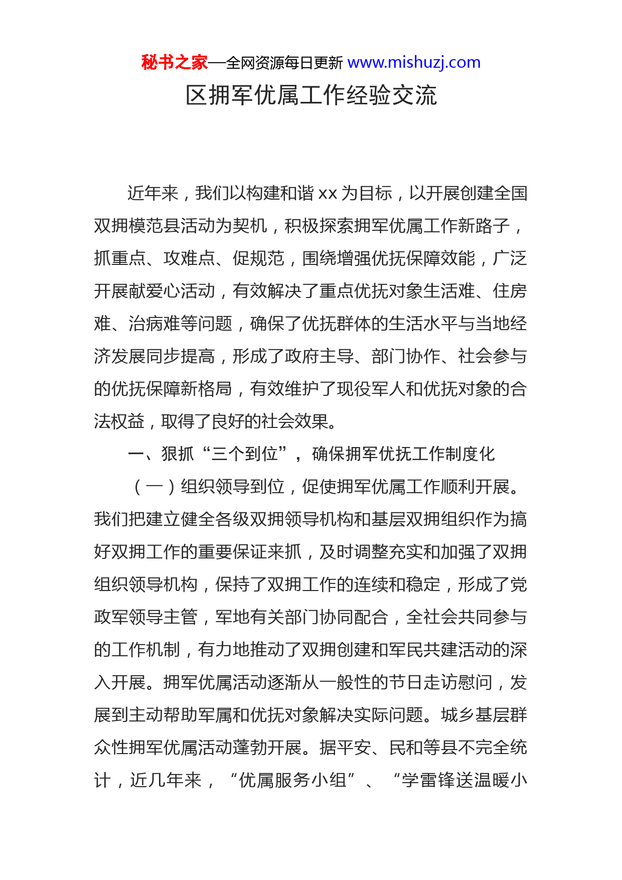 秘书之家—全网资源每日更新www.mishuzj.com区拥军优属工作经验交流近年来,我们以构建和谐xx为目标,以开展创建全国双拥模范县活动为契机,积极探索拥军优属工作新路子,抓重点、攻难点、促规范,围绕增强优抚保障效能,广泛开展献爱心活动,有效解决了重点优抚对象生活难、住房难、治病难等问题,确保了优抚群体的生活水平与当地经济发展同步提高,形成了政府主导、部门协作、社会参与的优抚保障新格局,有效维护了现役军人和优抚对象的合法权益,取得了良好的社会效果。一、狠抓“三个到位”,确保拥军优抚工作制度化(一)组织领导到位,促使拥军优属工作顺利开展。我们把建立健全各级双拥领导机构和基层双拥组织作为搞好双拥工作的重要保证来抓,及时调整充实和加强了双拥组织领导机构,保持了双拥工作的连续和稳定,形成了党政军领导主管,军地有关部门协同配合,全社会共同参与的工作机制,有力地推动了双拥创建和军民共建活动的深入开展。拥军优属活动逐渐从一般性的节日走访慰问,发展到主动帮助军属和优抚对象解决实际问题。城乡基层群众性拥军优属活动蓬勃开展。据平安、民和等县不完全统计,近几年来,“优属服务小组”、“学雷锋送温暖小秘书之家—全网资源每日更新www.mishuzj.com组”、“智力拥军优属小组”等基层群众拥军组织多达1180个。这些组织在帮助军属及其他优抚对象解决住房、就业、生活等实际问题方面发挥了重要作用。部分县还开展了“双向教育,双向服务”活动,对干部群众进行国防知识教育,开展拥军优属活动;对优抚对象进行艰苦奋斗教育,开展建功立业活动。积极探索建立基层优抚保障网络,在城镇,把日常性的拥军优属活动同社区服务相结合同建立城市最低生活保障制度相结合;在农村,把优抚对象纳入农村社会保障体系,解决他们的生活困难问题。通过开展形式多样,内容丰富的拥军优属活动,为双拥工作增添了活力,赋予了新的内涵,有力地推进了双拥工作的社会化进程,进一步密切了军政军民关系,维护了社会稳定。(二)政策制度到位,确保了拥军优属工作的规范运行。近年来,我区优抚制度逐步完善。一是大兴调查研究之风,为制定完善优抚制度提供依据。我们紧紧围绕优抚对象抚恤标准低,重点优抚对象的生活、住房、医疗难等一系列问题进行了广泛深入的专题调查研究。在充分掌握情况、分析形势的基础上,提出了解决问题的办法和建议有效地提高了优抚工作的主动性、针对性和科学性。二是从本地实际出发,制定完善配套制度。新的《军人抚恤优待条例》公布实行后,我区按照“适应形势,抓住重点,秘书之家—全网资源每日更新www.mishuzj.com突破难点”的要求,及时补充、修订和完善已经出台的各项优抚制度,并通过督促检查,确保有关政策法规的落实几年来,全区陆续出台了《关于做好新时期拥军优属工作的若干规定》、《军人抚恤优待暂行办法》、《关于企事业单位拥军优属的决定》、《关于建立抚恤补助标准自然增长机制的意见》、《关于建立全区重点优抚对象医疗保障制度的实施意见》等一系列规范性文件,进一步完善了优待、抚恤、评残等方面的制度,使优抚工作做到了有章可循,依法办事。在军民共建中,进一步完善了工作例会双向联系、走访慰问等6项制度,通过量化标准,促使共建工作向规范化方向迈进。(三)资金投入到位,夯实了拥军优属工作的基础。几年来,我们先后筹集资金80余万元,对5处烈士陵园进行维修改造,美化了园内环境,园容园貌大有改观,使烈士陵园成为以褒扬烈士为主的集宣传、教育、游览等多功能于一体的社会主义精神文明建设阵地。民和、平安等县投资5万余元,在城区几条主要路段设置了10余块“军民共建”永久性标志牌。进一步加大了拥军优属活动经费投入,四年来,仅用于节日慰问驻军部队、优抚对象,以及开展双拥各项活动的经费就达120余万元。二、实现“三个突破”,推动优抚工作规范化(一)在解决“三难”问题上实现新突破。为解决重秘书之家—全网资源每日更新www.mishuzj.com点优抚对象在生活、住房和医疗方面的难题,我们实施了“三大工程”。一是小康工程,解决生活困难问题。全区各级党委、政府高度重视优抚对象的生活保障。近年来,为了保证补助标准能够随着当地经济发展和人民生活水平同步提高,在上级抚恤补助的基础上,加大对烈属、残疾军人等重点优抚对象补助资金投入,使他们的生活标准达到或略高于当地居民平均生活水平。同时,对在乡老复员军人和带病回乡退伍军人按照当地农村居民平均生活水平给予定期定量补助,其他重点优抚对象的抚恤定补,加上自身生产收入,均达到或超过当地人均收入水平,保障了重点优抚对象的生活。特别是在实施城市最低生活保障和农村特困救助制度时,为体现国家对优抚对象的特殊照顾各县认真落实抚恤补助金不计入家庭收入的规定,对享受了抚恤补助后生活仍有困难的优抚对象,农村的给予特困救助,城镇的纳入最低生活保障范围,实行双重保障,较好地解决了重点优抚对象生活困难问题。去年,我们将559名1959年以前入伍的老退伍军人纳入了定期定量补助范围。二是安居工程,解决住房困难问题。自2000年开展“爱心献功臣行动”以来,我区把解决优抚对象的住房困难,作为一项重要工作来