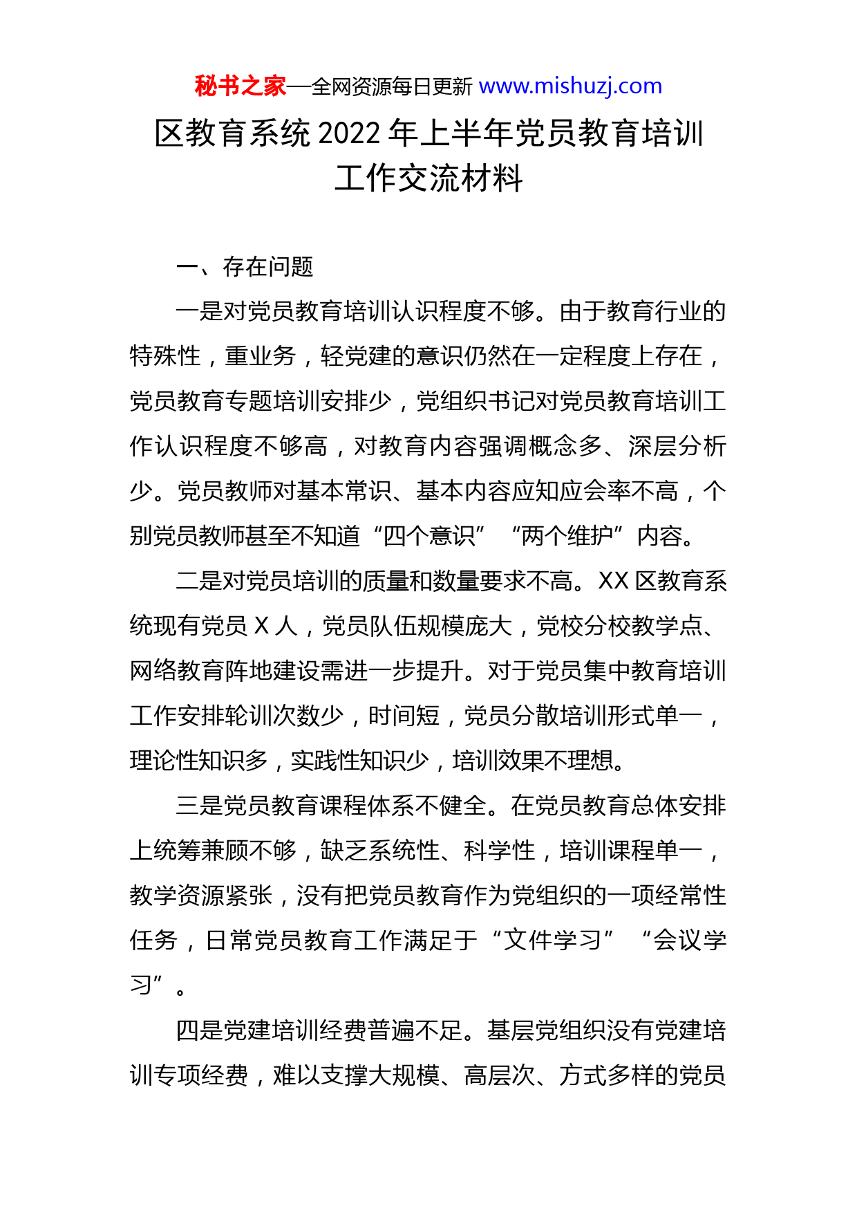 秘书之家—全网资源每日更新www.mishuzj.com区教育系统2022年上半年党员教育培训工作交流材料一、存在问题一是对党员教育培训认识程度不够。由于教育行业的特殊性,重业务,轻党建的意识仍然在一定程度上存在,党员教育专题培训安排少,党组织书记对党员教育培训工作认识程度不够高,对教育内容强调概念多、深层分析少。党员教师对基本常识、基本内容应知应会率不高,个别党员教师甚至不知道“四个意识”“两个维护”内容。二是对党员培训的质量和数量要求不高。XX区教育系统现有党员X人,党员队伍规模庞大,党校分校教学点、网络教育阵地建设需进一步提升。对于党员集中教育培训工作安排轮训次数少,时间短,党员分散培训形式单一,理论性知识多,实践性知识少,培训效果不理想。三是党员教育课程体系不健全。在党员教育总体安排上统筹兼顾不够,缺乏系统性、科学性,培训课程单一,教学资源紧张,没有把党员教育作为党组织的一项经常性任务,日常党员教育工作满足于“文件学习”“会议学习”。四是党建培训经费普遍不足。基层党组织没有党建培训专项经费,难以支撑大规模、高层次、方式多样的党员秘书之家—全网资源每日更新www.mishuzj.com教育培训。基层党组织党员教育培训普遍挤占办公经费和教师培训经费。二、下步打算(一)开展分类即时培训。针对各基层单位党务干部、灯塔管理员、入党积极分子、发展对象、预备党员、党建宣传骨干等不同群体,结合党建工作实际,在特定时间节点开展专题培训。重点采取集中授课、现场模拟、经验交流等方式实施培训计划,提升党员政治素养和业务能力。(二)抓实党员自学。组织广大党员深入学习习近平系列重要讲话精神,尤其是关于教育工作的重要论述,各基层党组织要结合实际制定学习计划和配档表,进一步细化学习内容,明确学习时间。适时组织党员撰写心得体会,开展研讨交流,将党员学习情况列入党员量化积分项目,加强督导检查,检验学习效果。(三)加强经常性教育。严格执行“三会一课”、组织生活会、主题党日、民主评议党员等制度,实行“课堂+基地”模式,整合学校党建阵地现有资源,结合传统节假日、法定节假日等重要时间节点,精心设计主题,丰富教育内涵,强化培训措施,开展丰富多彩的党员教育活动,推动集中性教育向经常性教育延伸。(四)创新运用信息化手段。用好“灯塔—党建在秘书之家—全网资源每日更新www.mishuzj.com线”综合管理服务平台、“学习强国”学习平台,发挥平台资源,精准推送党员教育内容。打造“互联网+党员教育”多维学习手段,促进基层党员教育培训与互联网应用深度融合。将灯塔学习情况纳入党员量化考核项目,组织党员网上学习、在线培训、答题竞赛、交流互动等,提高党员教育培训现代化水平。(五)创新党课教育模式将抓实党课备课、讲稿撰写作为提升基层党组织党课质效的重要抓手,举办“党课我来写”比赛,开展“最佳党课”案例评比工作;以党代表讲党课为切入点,全面推行党员轮流上台讲党课制度,推动各级党组织把备党课、讲党课、上党课融入日常、做在经常,切实让广大党员受到教育、提升素质、增强本领。(六)持续深化双报到工作。把“双报到”工作纳入党员教育培训的范畴,按照“基础在学、关键在做”的要求,把“双报到”作为党员教育的重要载体和推进党员学习教育常态化制度化的有力抓手,促进广大党员发挥先锋作用、树立模范形象,有效引导党员全心全意为人民服务。三、工作建议1.建立党员教育工作领导责任制,加强党员干部培训,建立有效可行的党员培训效果评价机制,实现对党员教育秘书之家—全网资源每日更新www.mishuzj.com质量有效监控。2.由县级统筹建立县级专兼结合师资库,统一选派,供全区部门统一使用。3.分领域分层分类研发专题教育课程,使教育内容符合党员需求,形成配套课程体系,让党员教育工作做到有章可循,有规可依。
