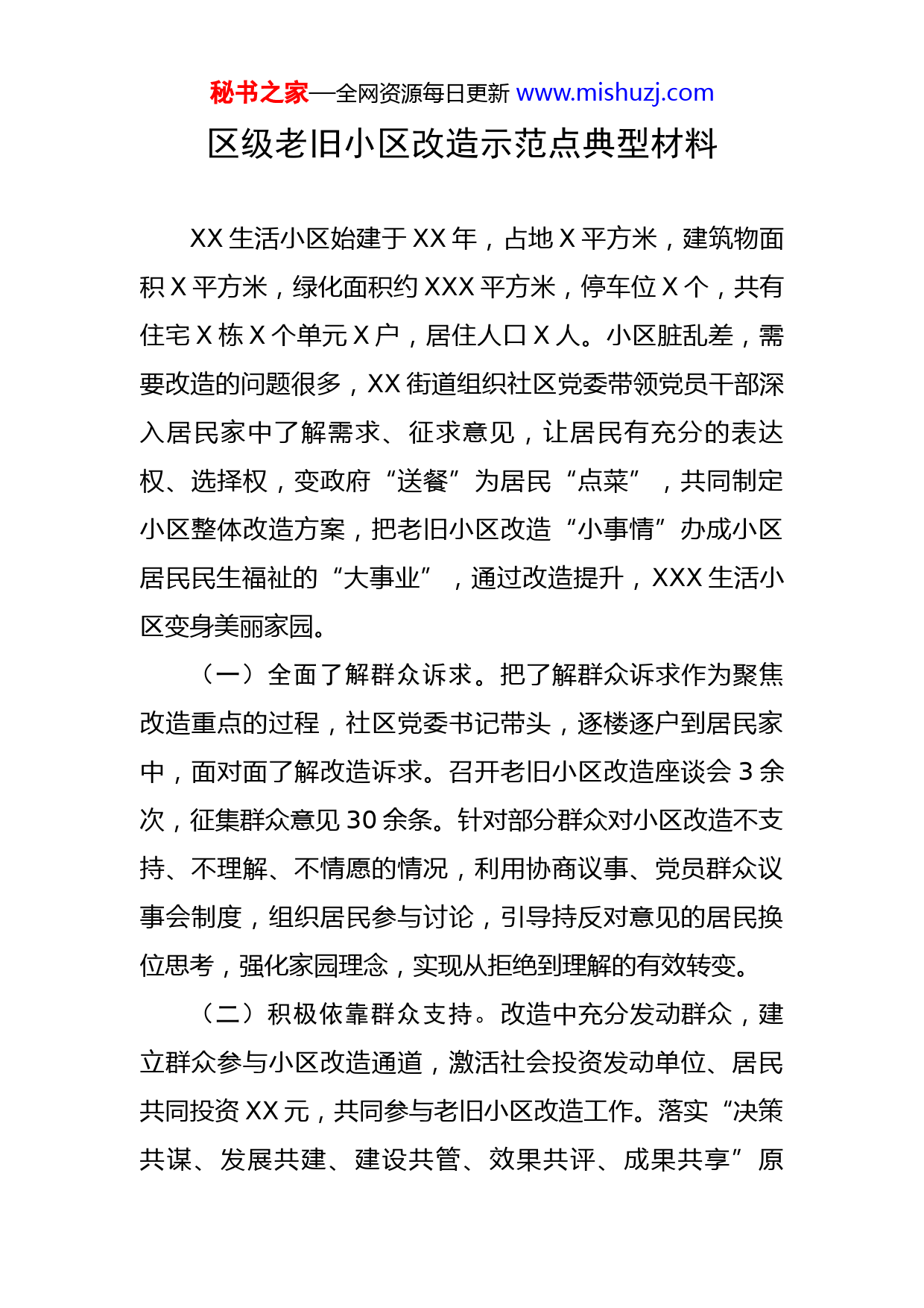 秘书之家—全网资源每日更新www.mishuzj.com区级老旧小区改造示范点典型材料XX生活小区始建于XX年,占地X平方米,建筑物面积X平方米,绿化面积约XXX平方米,停车位X个,共有住宅X栋X个单元X户,居住人口X人。小区脏乱差,需要改造的问题很多,XX街道组织社区党委带领党员干部深入居民家中了解需求、征求意见,让居民有充分的表达权、选择权,变政府“送餐”为居民“点菜”,共同制定小区整体改造方案,把老旧小区改造“小事情”办成小区居民民生福祉的“大事业”,通过改造提升,XXX生活小区变身美丽家园。(一)全面了解群众诉求。把了解群众诉求作为聚焦改造重点的过程,社区党委书记带头,逐楼逐户到居民家中,面对面了解改造诉求。召开老旧小区改造座谈会3余次,征集群众意见30余条。针对部分群众对小区改造不支持、不理解、不情愿的情况,利用协商议事、党员群众议事会制度,组织居民参与讨论,引导持反对意见的居民换位思考,强化家园理念,实现从拒绝到理解的有效转变。(二)积极依靠群众支持。改造中充分发动群众,建立群众参与小区改造通道,激活社会投资发动单位、居民共同投资XX元,共同参与老旧小区改造工作。落实“决策共谋、发展共建、建设共管、效果共评、成果共享”原秘书之家—全网资源每日更新www.mishuzj.com则,优化老旧小区改造发起、征集意见、公示、确认申报、组织实施5方面流程,切实保障小区改造工作顺利圆满完成。(三)改造信息公开透明。让群众参与改造的全过程,接受群众监督。及时公开小区改造的方案、工程内容及进展、工程质量、资金使用、政策兑现等内容,让小区改造全过程晒在阳光下,最在限度地取信于民。(四)主动接受群众监督。小区居住着很多熟悉建筑施工的专业老工人,在小区施工改造过程中,老同志们自发组成“工程监督队”,全程监督小区改造工程内容、工程进展、工程质量,对存在问题及时提出整改意见。(五)形成共建共治共享。社区坚持“居民自治”与“改造提升”双同步精细化管理的原则,通过成立小区党支部、物管委员会、红色物业等,大力推动业主自治、建立健全物业管理,创新“纵向到底、横向到边、协商共治”的治理体系,建立街道、社区、物业等多方联动机制,完善小区后续自治管理,实现从“只建不管”到“共建共管”的转变,解决改造后长效治理难题。一是成立居民管事会。广泛动员楼院中有群众威望高、办事公道的的老党员、退休干部等热心居民成立“居民管事会”,带动居民积极参与到小区的整治和管理中。二是制定“小区管理制度”。根据居民们反映的楼道门口乱停放非机动车、秘书之家—全网资源每日更新www.mishuzj.com外来人员随意进出小区、小区内部分居民乱堆杂物等现象,制定《小区管理制度》,由“居民管事会”的老党员、老干部们监督实施。三是不断完善服务功能。社区将不断对接居民需求清单,组织志愿者在小区内经常性地开展便民利民、扶贫帮困、敬老爱老、环境卫生清洁等志愿服务,共同协助小区居民开展小区自治工作。通过老旧小区改造项目的实施,小区基础设施全面提升,配套服务设施不断完善,环境得到了美化,居民主人翁意识不断增强统一的晾晒区规范便民,楼道粉刷一新、便民信息栏、大门人脸识别系统、休息区、小区凉亭、晾衣区焕然一新,小区居民满意度和幸福感显著提升。