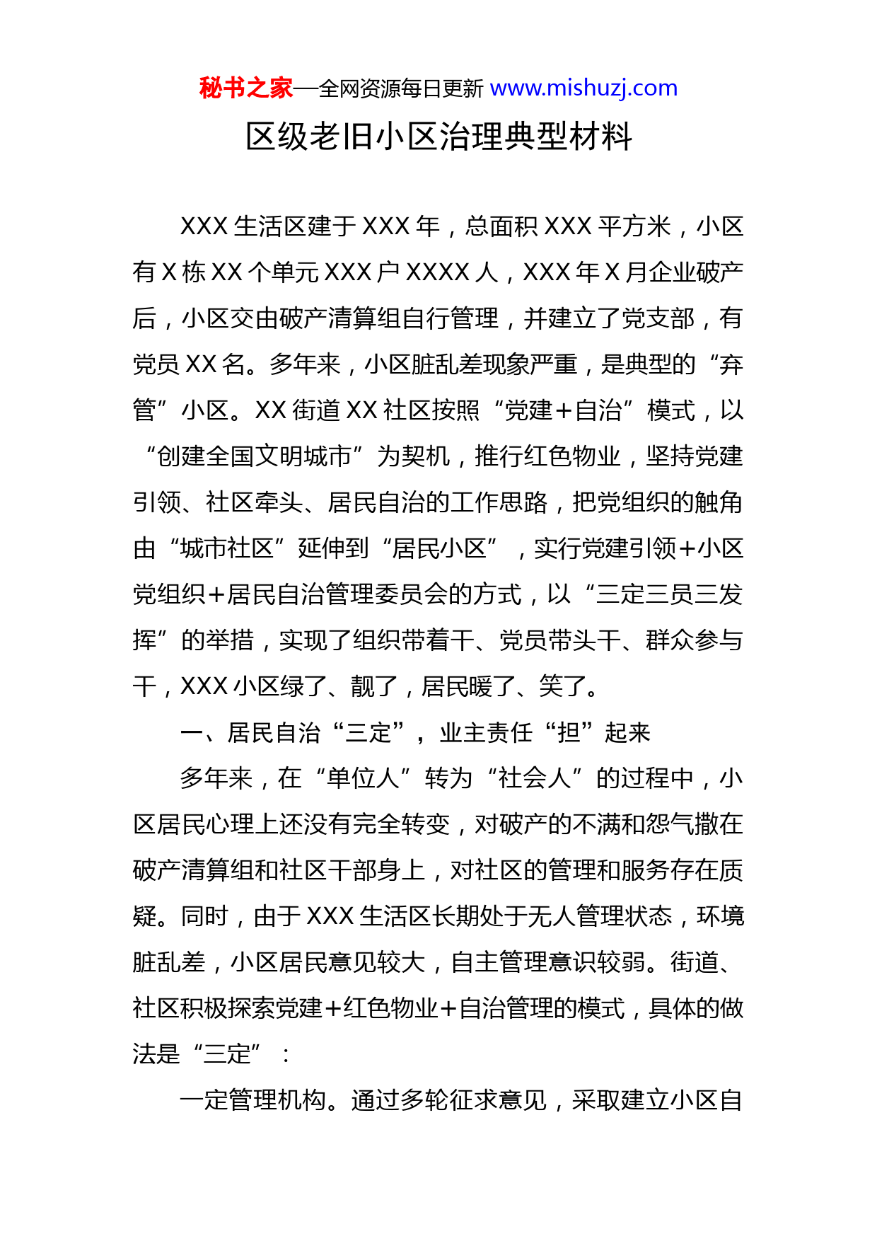 秘书之家—全网资源每日更新www.mishuzj.com区级老旧小区治理典型材料XXX生活区建于XXX年,总面积XXX平方米,小区有X栋XX个单元XXX户XXXX人,XXX年X月企业破产后,小区交由破产清算组自行管理,并建立了党支部,有党员XX名。多年来,小区脏乱差现象严重,是典型的“弃管”小区。XX街道XX社区按照“党建+自治”模式,以“创建全国文明城市”为契机,推行红色物业,坚持党建引领、社区牵头、居民自治的工作思路,把党组织的触角由“城市社区”延伸到“居民小区”,实行党建引领+小区党组织+居民自治管理委员会的方式,以“三定三员三发挥”的举措,实现了组织带着干、党员带头干、群众参与干,XXX小区绿了、靓了,居民暖了、笑了。一、居民自治“三定”,业主责任“担”起来多年来,在“单位人”转为“社会人”的过程中,小区居民心理上还没有完全转变,对破产的不满和怨气撒在破产清算组和社区干部身上,对社区的管理和服务存在质疑。同时,由于XXX生活区长期处于无人管理状态,环境脏乱差,小区居民意见较大,自主管理意识较弱。街道、社区积极探索党建+红色物业+自治管理的模式,具体的做法是“三定”:一定管理机构。通过多轮征求意见,采取建立小区自秘书之家—全网资源每日更新www.mishuzj.com治委员会的形式,吸纳小区有一定威望、能发挥示范带头作用的党员或群众,选举进入自治委员会。二定管理制度。为解决小区管理缺位,民主管理水平不高,党组织号召力不强等问题,XXX社区党总支带领居民制定了层级管理机制,小区共分为3个层级,小区党支部、党小组、楼栋单元长,明确各层级的责任。同时,制定了小区《议事章程》《居民公约》、楼栋单元长管理、环境卫生管理、车辆管理五项管理机制。党员带头,自治委员会成员参与,轮流对本单元的环境卫生情况进行监督和保洁。制定“九个有”标准规范管理小区:即有完善的小区管理制度、有完备的创文公益广告、有整洁的垃圾分类设备、有简便的单元门禁系统、有标准的消防安全设施、有规范的车辆停放泊位、有便民的居民晾晒区域、有利民的居民活动场所、有适用的信息发布专栏。三定网格责任。构建“四级网格模式”,社区党委负责人为一级网格长,离退休党支部书记为第二级网格长,原XXX厂破产遗留管理人员为第三级网格长,各楼栋单元长为第四级网格长,负责本单元居民宣传、业务联络,为居民办理一些力所能及的事,如电灯维修、代收水电费、物品搬运、入户宣传、疏通下水道等工作。通过网格化管理,畅通民心、倾听民声、问需于民、问计于民,逐步形成居民自我管理、自我服务的新机制。秘书之家—全网资源每日更新www.mishuzj.com二、社区牵头做“三员”,小区事务“管”起来为了让无人管小区有人管、规范管,XXX社区主动作为、主动担责,当好“三员”:一是当好环境卫生“治理员”。XXX厂生活区建设较早,基础设施薄弱,配套设施不健全,多年来无人管理,私搭乱建、乱堆乱放、占用绿化带、随意饲养家禽、楼道小广告铺天盖地等现象较为突出。社区积极组织市、区包保单位、社区、小组100余名志愿者经过XXX天的持续整治,拆除私搭乱建XX处,清运小垃圾XX余吨,清理小广告XXX平方米,疏通下水沟XX米,增绿补绿XXXX余平方米,硬化小区路面XXX平方米,施划停车位XXX个,安装休闲椅XX个,新建晾衣架X组,总投资了约XX余万元,有效改善了小区面貌,得到小区居民的称赞和好评。二是当好小区事务“代办员”。针对小区内困难老人、弱势群体多的现状,社区多次组织志愿者服务队伍开展“敲门行动”,主动登门入户,为困难人群开展义务服务,帮助居民办理缴纳医保、养老费用,领取低保金、救助金、老年人免费体检等业务,做到进百家门、解百家难、帮百家事、暖百家心”。XXX是XXX退休支部书记,自企业破产后,每天都有小区居民找他反映问题、办理事务,每次他都耐心办理,把小区居民的每一件小事都落到实处,踏踏实实当好小区事务的代办员、居民的办事员。秘书之家—全网资源每日更新www.mishuzj.com三是当好居民纠纷“调解员”。成立矛盾调解工作组,帮助调解居民纠纷,针对治理中要拆除大量违建、铲除小菜地和拆除不合理的花台、晾衣架,少数群众不理解、不支持,调解工作组利用中午、晚上和周末休息时间上门入户,认真倾听群众的需求并耐心解释,权衡利弊、化解矛盾,获得群众的理解和支持,助力小区整治稳步推进。三、党建引领“三发挥”,组织作用“强”起来一是发挥组织核心作用。XXX小区党支部党员结构复杂,XX名党员有XX名党员长期在外,难联系,在小区的X名党员,均年龄较大,组织活动呈瘫痪状态。社区党委以全国文明城市创建为契机,千方百计加强与居民住户之间的沟通,将社区人员包保到小区楼栋,每人负责一个单元入户做居民思想工作,面对面宣传文明城创建相关知识。抓住党支部做文章,通过配备党建指导员,整顿软弱涣散党支部,督促指导支部主题党日正常开展等形式,把党组织的核心引领作用发挥出来。二是发挥党员模范作用。以组织党员群众观看爱国影片,选举党员代表、户主代表,多次组织召开党员代表大会、户主代表会,凝聚了党心民心,最终赢得了居民的理解、信任和支持,使社区得以参与到小区管理、整治中来,部分党员由“事不关己、高高挂起”变为在小区内主秘书之家