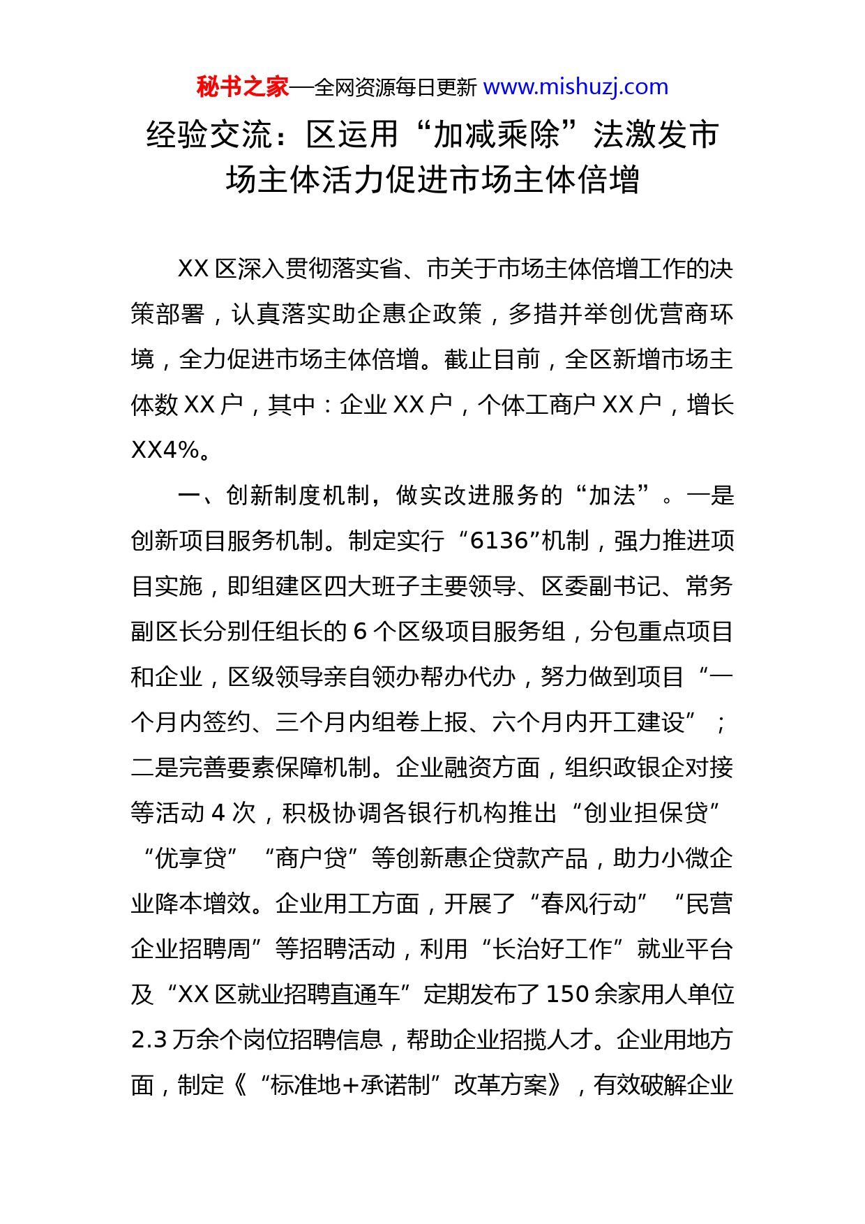 秘书之家—全网资源每日更新www.mishuzj.com经验交流:区运用“加减乘除”法激发市场主体活力促进市场主体倍增XX区深入贯彻落实省、市关于市场主体倍增工作的决策部署,认真落实助企惠企政策,多措并举创优营商环境,全力促进市场主体倍增。截止目前,全区新增市场主体数XX户,其中:企业XX户,个体工商户XX户,增长XX4%。一、创新制度机制,做实改进服务的“加法”。一是创新项目服务机制。制定实行“6136”机制,强力推进项目实施,即组建区四大班子主要领导、区委副书记、常务副区长分别任组长的6个区级项目服务组,分包重点项目和企业,区级领导亲自领办帮办代办,努力做到项目“一个月内签约、三个月内组卷上报、六个月内开工建设”;二是完善要素保障机制。企业融资方面,组织政银企对接等活动4次,积极协调各银行机构推出“创业担保贷”“优享贷”“商户贷”等创新惠企贷款产品,助力小微企业降本增效。企业用工方面,开展了“春风行动”“民营企业招聘周”等招聘活动,利用“长治好工作”就业平台及“XX区就业招聘直通车”定期发布了150余家用人单位2.3万余个岗位招聘信息,帮助企业招揽人才。企业用地方面,制定《“标准地+承诺制”改革方案》,有效破解企业秘书之家—全网资源每日更新www.mishuzj.com用地难题;三是建立激励奖惩机制。将市场主体倍增工作任务分解下达到各乡镇各部门,纳入年度考核内容,实行周通报、月调度、季讲评、年考核制度,由区委督查室牵头,每月对工作完成情况开展专题督导检查。二、突出便捷高效,做细优化流程的“减法”。一是压减办理时间。区政务服务大厅设置“企业开办综合受理窗口”,提供企业设立登记、公章刻制、税务申领、银行开户等事项一条龙服务,实现了政务事项由“多窗式”审批向“一窗式”服务转变,企业开办半天内(不超过4小时)办结。二是减少跑腿次数。抓实高频事项“最多跑一次”改革,对道路货物运输经营许可、食品经营备案等15项高频事项,设立了“快捷即办”窗口,即来即办、当场出证,避免群众二次往返。同时推出涉企“套餐”服务,饭店、理发店、商场超市等38项业态事项实现“一件事一次办”。三是答疑减忧解惑。设立“办不成事咨询窗口”,集中受理和解决企业、群众“想办却办不成的事”,专门解决在政策法规范围内,企业、群众办理政务服务事项遇到的“疑难杂症”。今年以来,“办不成事咨询窗口”和“值班局长服务台”共接受企业、群众咨询2000余人次,帮助解决难题近55件。三、聚焦惠企助企,做强政策落实的“乘法”。一是培育多元市场主体。鼓励城乡劳动者自主创业,鼓励广大秘书之家—全网资源每日更新www.mishuzj.com农民开拓创业,鼓励科技人员积极创业,鼓励返乡农民工、高校毕业生、下岗职工、转业退伍军人等主动创业,掀起全民创业热潮,靠市场主体的多元化,壮大总量和提升活力;二是深入开展“入企服务”活动。立足实际细化形成XX区150条市场主体倍增政策体系,成立了20个政策落实工作专班,向社会公布政策解读落实联系电话,安排行业管理部门及乡镇逐企上门送政策、送服务,扎实推动惠企政策举措应知尽知、应享快享;三是加大升规纳统培育力度。培育“专精特新”企业,梯次推进“个转企、小升规、规改股、股上市”,将16家企业纳入培育库重点跟踪服务,1家企业成为省级专精特新“小巨人”企业、1家企业成为专精特新企业,3家企业完成股改,全年力争培育“小升规”企业9户。四、围绕解难纾困,做好审批服务的“除法”。一是助力企业无忧创业。创新实行“委托代办”“勘验先行”等服务,变“坐等群众来咨询”为“主动联系做指导”,为市场主体提供“保姆式”服务,共为服务对象提供“勘验先行”服务近200次,现场勘验一次通过率达到98%;二是全力推动减税降费落实。认真落实好大规模、阶段性、组合式减税降费政策,特别是加大对小微企业、个体工商户、制造业企业的支持力度,确保税费政策红利充分释放,更好助力市场主体纾困解难。截至目前,全区共减秘书之家—全网资源每日更新www.mishuzj.com税各项降费1.7194亿元,为200余户纳税人留抵退税款约7亿元;三是保护企业轻松发展。设置免打扰“白名单”,将效益好、税收高、处于产业链引领位置的示范带动性企业纳入“白名单”,除安全、环保检查外,其它检查必须报备,加强“双随机、一公开”监管,完成抽查29次,参与部门抽查事项清单全覆盖,实现守法企业“无事不扰”,打击违法“无处不在”。