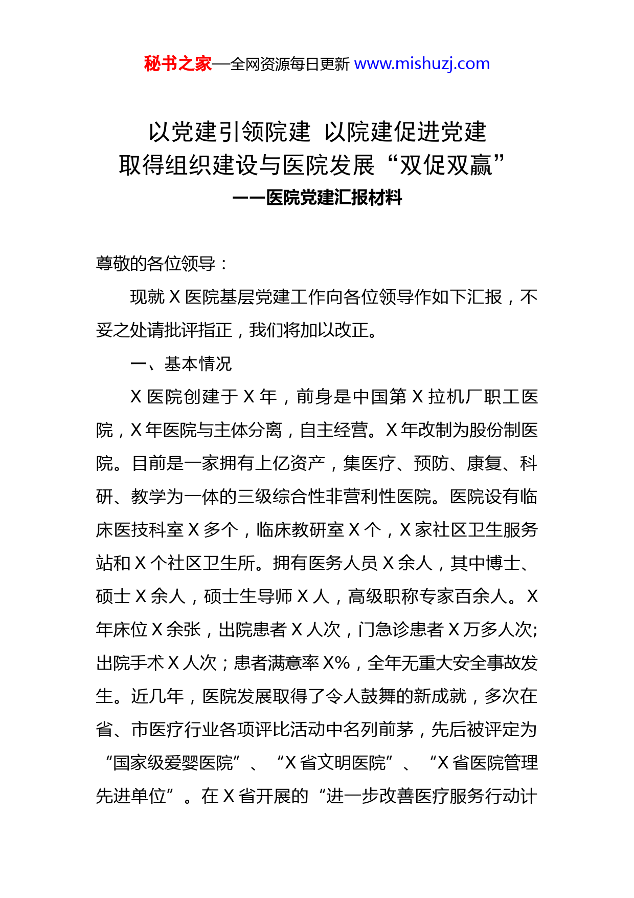 秘书之家—全网资源每日更新www.mishuzj.com以党建引领院建以院建促进党建取得组织建设与医院发展“双促双赢”——医院党建汇报材料尊敬的各位领导:现就X医院基层党建工作向各位领导作如下汇报,不妥之处请批评指正,我们将加以改正。一、基本情况X医院创建于X年,前身是中国第X拉机厂职工医院,X年医院与主体分离,自主经营。X年改制为股份制医院。目前是一家拥有上亿资产,集医疗、预防、康复、科研、教学为一体的三级综合性非营利性医院。医院设有临床医技科室X多个,临床教研室X个,X家社区卫生服务站和X个社区卫生所。拥有医务人员X余人,其中博士、硕士X余人,硕士生导师X人,高级职称专家百余人。X年床位X余张,出院患者X人次,门急诊患者X万多人次;出院手术X人次;患者满意率X%,全年无重大安全事故发生。近几年,医院发展取得了令人鼓舞的新成就,多次在省、市医疗行业各项评比活动中名列前茅,先后被评定为“国家级爱婴医院”、“X省文明医院”、“X省医院管理先进单位”。在X省开展的“进一步改善医疗服务行动计秘书之家—全网资源每日更新www.mishuzj.com划”、“大型医院巡查”活动中,我院都取得了优异的成绩。医院重视科研水平提升,“黑皮痣”治疗技术走进央视“百科探秘”栏目,吸引了来自全国各地的患者;神经内科、消化肝病科、骨关节外科、耳鼻喉科、普外腹壁疝和疝外科先后被列为“X市重点专科”;血液净化科、消化科分别被上级卫生部门认定为“X省血液净化质量控制中心X市分中心”、“X市人工肝培训中心”;肝病科被授予“全国肝胆病防治技术示范基地”;X院长等X人被聘为“全国肝胆病咨询专家”,进入肝胆病咨询服务“国家队”,进一步提升了医院的学术影响力。近年来,开展医学科研二十余项,其中十余项先后获省、市科技进步奖,每年在国内外专业医学杂志上发表学术论文百余篇,完成医学专著X余部。X年初,医院党组织正式由X集团公司党委划归为X区、X党委领导。目前医院党委有支部X个、党员X人,其中医护人员占X%以上。二、基层党建工作开展情况近年来,院党委紧紧围绕医院“中心工作”抓党建、带队伍,不断深化和探索党建工作,着力提升医院党组织的战斗堡垒作用和党员模范先锋作用。(一)抓基础强核心,不断健全医院党组织体系1、强化党委核心地位,为医院建设保驾护航。院党委始终根据医院实际,实时制定、调整医院发展战略和阶段秘书之家—全网资源每日更新www.mishuzj.com目标,为医院发展保驾护航。通过深化机制改革,加强内涵建设,优化整合资源,提升创新能力,使医院从举步维艰到步入良性运营,从负债经营到资产增值,从人心涣散、人才流失到人心凝聚、充满生机。近年来医院持续保持了健康、平稳、较快的发展势头,无论是在医院规模、医疗设施、经济总量方面,还是在资源开发、效能利用、运行质量方面,都取得了长足的进步。X年一季度,医院呈现投诉明显减少、满意率持续达到X%以上、各学科竞相发展的喜人局面。2、以组织建设为基础,着力发挥党委核心作用。一是配强配齐党工委领导班子,医院党委有X名同志组成,同时下属X各党支部,各个支部班子健全,分工明确;二是积极推进医院党组织阵地建设,不断完善党组织工作条件;三是坚持支部书记津贴待遇补助,每月X元不变;四是积极规范按程序做好发展党员工作,按照遵循“把人才培养成党员,把党员培养成骨干”的思路,今年上报了X名入党积极分子,已参加完培训;五是开展“做合格党员,足额按时补缴党费”专项工作,全体党员按要求完成了党费补缴。(二)抓重点强素质,不断优化干部职工队伍建设一是坚持党管干部制度。医院提拔中层干部,一律经过党委组织部门考察、民主评议、公示后无疑义,由医院秘书之家—全网资源每日更新www.mishuzj.com组织部门下发任命文件实施用人。二是围绕全面从严治党的要求,进一步强化全院党员干部的党性意识,抓好廉洁自律,强化班子内部权力运行程序的监督和制约,重大决策、决定都经过集体讨论后做出。坚持“四重一大”和“院务公开”制度,确保了重大项目、重要经济活动的公开、透明、畅通。三是强化责任担当,抓好工作落实。X年,院党委以“质量创优零缺陷”为目标,跟踪问效抓落实。进一步健全、完善了质控体系和质控机制,保证终末质量;持续强化重点部门、重点人员、重点环节、重点时段及重点技术管理的“五重管理”,保障了患者医疗安全;“三基三严”常抓不懈,全年医护人员各种培训约X余场次,X余人次,参培合格率达到X%以上,提升了医疗质量,保障了医疗安全,全年无医疗事故发生。(三)抓主体强管理,不断增强党员的先进性意识一是坚持“三会一课”制度,完善党员管理机制。既按时进行支部大会、支委会、党小组会、党课;二是结合创先争优活动,增强党员的先进性,今年医院党委制定了“筑强堡垒促发展、医院建设我争先”支部创先争优计划和“争做优秀共产党员”计划,旨在通过创建活动加强党组织战斗堡垒作用,提高党员模范先锋带头作用。三是提升党员先进性,强化教育学习。围绕党史学习教育,学习党的十九届六中全会精神、习总书记系列讲话、党章等,秘书之家—全网资源每日更新www.mishuzj.com党员干部政治敏锐性和政治鉴别力不断增强。X月X日,院党委举行了以“弘