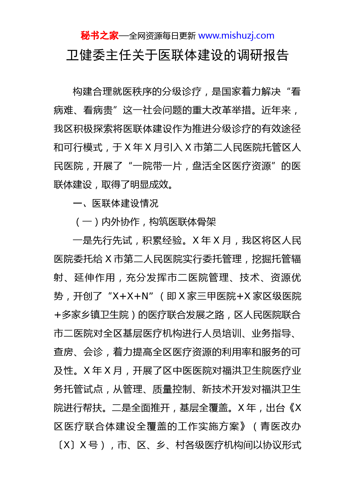 秘书之家—全网资源每日更新www.mishuzj.com卫健委主任关于医联体建设的调研报告构建合理就医秩序的分级诊疗,是国家着力解决“看病难、看病贵”这一社会问题的重大改革举措。近年来,我区积极探索将医联体建设作为推进分级诊疗的有效途径和可行模式,于X年X月引入X市第二人民医院托管区人民医院,开展了“一院带一片,盘活全区医疗资源”的医联体建设,取得了明显成效。一、医联体建设情况(一)内外协作,构筑医联体骨架一是先行先试,积累经验。X年X月,我区将区人民医院委托给X市第二人民医院实行委托管理,挖掘托管辐射、延伸作用,充分发挥市二医院管理、技术、资源优势,开创了“X+X+N”(即X家三甲医院+X家区级医院+多家乡镇卫生院)的医疗联合发展之路,区人民医院联合市二医院对全区基层医疗机构进行人员培训、业务指导、查房、会诊,着力提高全区医疗资源的利用率和服务的可及性。X年X月,开展了区中医医院对福洪卫生院医疗业务托管试点,从管理、质量控制、新技术开发对福洪卫生院进行帮扶。二是全面推开,基层全覆盖。X年,出台《X区医疗联合体建设全覆盖的工作实施方案》(青医改办〔X〕X号),市、区、乡、村各级医疗机构间以协议形式秘书之家—全网资源每日更新www.mishuzj.com形成了市二医院为龙头、区医院为枢纽,覆盖全区基层医疗机构“X+X+X+N”的纵向型、紧密型医联体,各级医疗机构间在业务发展、培训指导、诊疗技术规范、质量控制、病人转诊、信息联通共享等方面建立起有效联系,为实现区内服务技术同质化、服务质量均一化、病人就诊秩序有序化、信息资源共享化奠定了坚实的基础。三是拓展扩面,专业全覆盖。X年X月X省第二中医医院对区中医医院进行托管,区精神病防治院X年5月与X市第四人民医院、区妇幼保健院X年X月与X省妇幼保健院建立合作关系,推动了我区中医、妇幼、精神病防治X个专科医联体建设。在托管合作杠杆的撬动下,推动我区医联体建设,成功搭建起大小医院间有效联系的桥梁。(二)上下联动,优化医联体机制一是建立双向转诊机制。在各医疗机构内建立双向转诊绿色通道、双向转诊工作服务站,上级医院预留病床、挂号,确保转诊病员优先诊治、检查和住院,转院手续、费用由医院对接。截止今年X月,我区病人在医联体内累计逐级上转到区级医院X人次、上转到市级医院X人次,分别占病人上转总人次的X%和X%,累计下转病人X人次。二是建立信息化为支撑的纵贯医疗机制。投入X万元,搭建区域卫生信息平台和区域卫生信息专网,建立全员人口基础信息、电子健康档案、电子病历三大基础数据秘书之家—全网资源每日更新www.mishuzj.com库,实现区、乡、村资源信息互联共享,逐步打通与市级医院互联互通的障碍。借助信息化手段,筹建区域影像、心电、检验、病理、疑难病例会诊五大远程诊疗中心,以数据跑路代替病人跑路,以省市区医疗资源弥补基层资源不足,方便群众就近享受到优质医疗服务。三是建立人才柔性流动机制。各级医疗机构间协议明确资源下沉、人才培养等工作任务和要求,建立医师多点执业和人才培养机制,推动人才双向流动,实现上级专家下沉帮扶、区乡人员上挂学习。截止今年X月,城市三级医院累计下派专家X人次到我区开展业务指导、查房、坐诊、培训、带教。区人民医院下派X名业务骨干到城厢、祥福、清泉、弥牟X家中心卫生院长期驻点挂职帮扶,下派专家X人次到基层坐诊、查房、会诊、指导、培训。区级医院累计上挂学习培训X人次,基层医疗机构累计上挂学习培训X人次。医联体内下沉帮扶、上挂学习,有效促进了基层服务能力的提升,为更多病人首诊到基层提供了能力保障。四是建立对基层病人的延伸服务机制。一方面,医联体内病人下转到基层,上级医院专家针对下转病人制定了后续治疗方案和康复方案,全程参与和指导病人在基层的治疗和康复。一方面,区级医院挑选X名医疗骨干参与全区基层医疗机构X个家庭医生团队的组建,指导和参与糖尿病、高血压等慢性病管理为主的家庭医生团队服务。医联体运行机制秘书之家—全网资源每日更新www.mishuzj.com的建立,初步奠定了“基层首诊、双向转诊、上下联动、急慢分治”的分级诊疗制度基础。(三)管治结合,激发医联体活力以实现医联体内“医通、人通、财通”“三通”为目标,明确各医疗机构在医联体建设中的职责、任务、工作目标和量化指标,对医联体进行规范管理和科学治理,使医联体焕发强劲动力。一是建立医联体多层级联席会议制度。推动医联体建设过程中,建立了区委、区政府层面,主管部门和医疗机构层面,医疗机构间以及医疗机构内X个层级的医联体联席会议制度,加强医联体的领导和管理,各个层级以调研、座谈等方式,适时问诊、把脉建设中存在的问题,召开联席会议X余次,协调研究了X余项体制机制方面的问题。二是建立绩效考核机制。制定了医联体绩效考核办法,定期开展医联体工作督导和考评,及时通报督导考评中发现的问题,坚决把考评结果与绩效挂钩,奖优罚劣。三是建立内部竞争机制。设立四个医联体建设工作小组,分属清泉、城厢、祥福、弥牟四个工作片区,四个片区的组长、副组长分别由市二医院、区人民医院分管领导担任,负责组织、协调、推动,对四个医联体建设工作小组的工作成