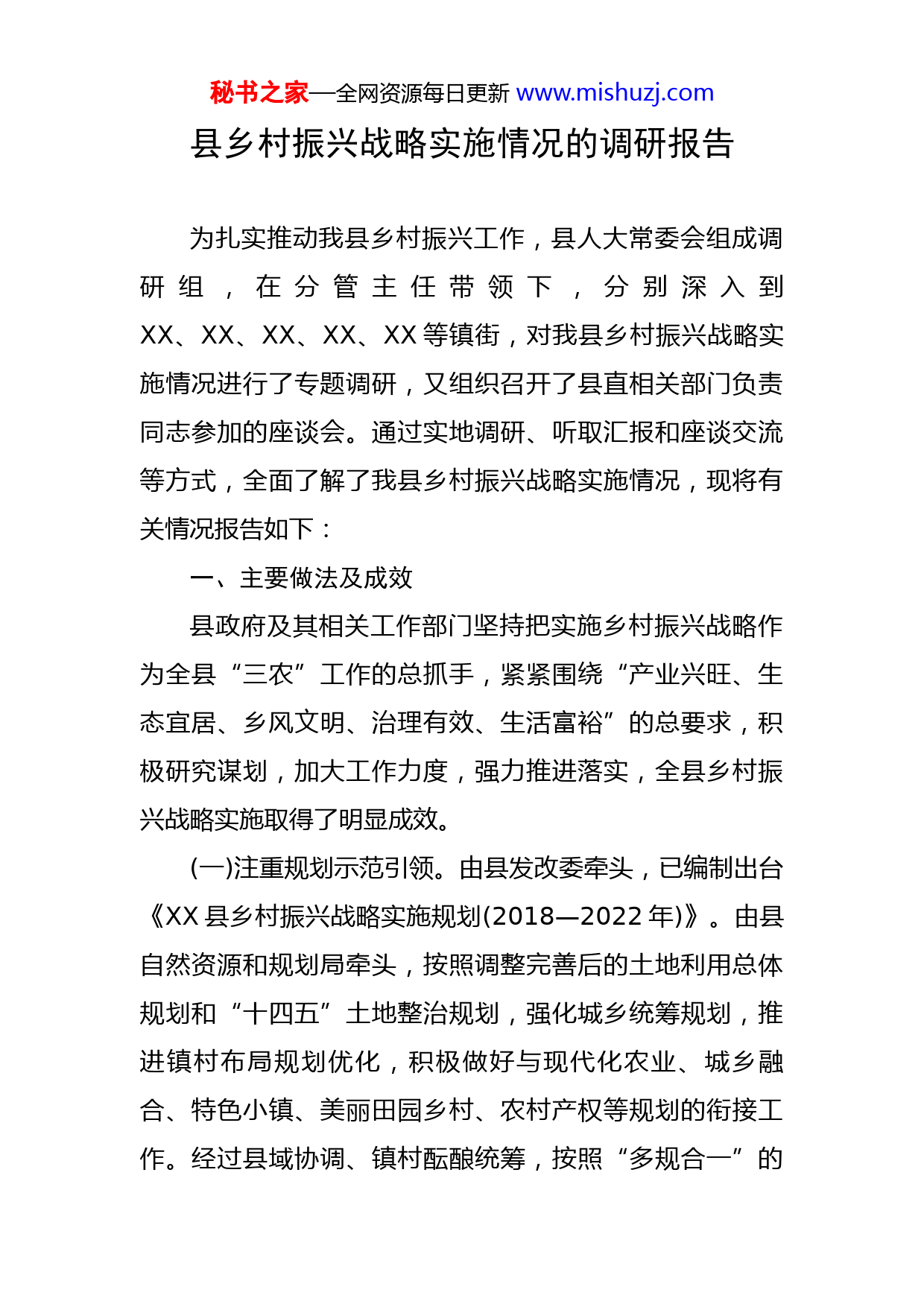 秘书之家—全网资源每日更新www.mishuzj.com县乡村振兴战略实施情况的调研报告为扎实推动我县乡村振兴工作,县人大常委会组成调研组,在分管主任带领下,分别深入到XX、XX、XX、XX、XX等镇街,对我县乡村振兴战略实施情况进行了专题调研,又组织召开了县直相关部门负责同志参加的座谈会。通过实地调研、听取汇报和座谈交流等方式,全面了解了我县乡村振兴战略实施情况,现将有关情况报告如下:一、主要做法及成效县政府及其相关工作部门坚持把实施乡村振兴战略作为全县“三农”工作的总抓手,紧紧围绕“产业兴旺、生态宜居、乡风文明、治理有效、生活富裕”的总要求,积极研究谋划,加大工作力度,强力推进落实,全县乡村振兴战略实施取得了明显成效。(一)注重规划示范引领。由县发改委牵头,已编制出台《XX县乡村振兴战略实施规划(2018—2022年)》。由县自然资源和规划局牵头,按照调整完善后的土地利用总体规划和“十四五”土地整治规划,强化城乡统筹规划,推进镇村布局规划优化,积极做好与现代化农业、城乡融合、特色小镇、美丽田园乡村、农村产权等规划的衔接工作。经过县域协调、镇村酝酿统筹,按照“多规合一”的秘书之家—全网资源每日更新www.mishuzj.com要求和因地制宜、实事求是的原则,选择了XX镇的XX村、XX村、XX村作为试点村庄开展我县实用性村庄规划编制试点工作。(二)优化乡村生活空间。XX镇和XX镇分别被确定为全国国土空间全域土地综合整治试点和省国土空间全域综合整治试点工作,XX镇全域土地综合整治试点已列入部级名录,省级首批补助资金近XX亿元。坚持“山水林田湖草生命共同体”,扎实开展国土空间生态保护修复工作,已完成造林XX亩,农田林网XX万亩,四旁植树XX万株、森林抚育XX万亩,另有XX绿美村庄建设正在快速进行。全域综合整治工作有效改善了生产、生活、生态条件,为建设“颜值”与“内涵”并重的美丽XX打下了坚实的基础。(三)培优农业产业结构。充分发挥我县“农”字招牌作用、积极挖掘“特”字带动潜力、不断打造“商”字专属品牌。坚持高质量发展,构建了生态虾稻、高效园艺和休闲农业、数字农业“2+2”农业主导产业结构。全县虾稻共生总面积达XX万亩,高效园艺种植面积XX万亩,XX镇XX村获批省级休闲农业精品村,XX镇XX村获批中国美丽休闲乡村。全县XX个农产品获得绿色食品认证,建成XX万亩国家级绿色食品原料(水稻)标准化生产基地,XX万亩省级绿色优质农产品生产基地。秘书之家—全网资源每日更新www.mishuzj.com(四)扎实推进农旅融合发展。近年来,政府高度重视农旅融合工作,并在全县科学发展目标考核加分中予以体现。编制了《XX休闲农业与乡村旅游发展规划》。以全域旅游为引领,坚持以“3221”品牌创建为目标,以“一南一北”两个区域为重点,推动乡村旅游建设。XX社区、XX村、XX社区创成省级乡村旅游重点村。聘任旅游发展顾问,建立旅游专家智库;实施“牛师傅耕耘计划”,聘请高校、第三方专家团队作为“牛师傅”,指导我县乡村旅游区建设和发展。XX镇共整治土地XX万余亩,用于发展农旅融合项目,并出台支持特色农家乐、精品民宿等乡村旅游业态相关政策;XX镇XX村与县平台公司共同对土地进行综合治理后,高标准打造田园综合体。(五)深入开展宜居乡村建设。深入实施农村人居环境整治三年行动,接续开展农村人居环境整治提升五年行动。积极推进特色田园乡村建设。在原有已建成XX个美丽宜居乡村的基础上,再打造XX个左右的美丽宜居乡村,美丽宜居乡村建成率达XX%以上。实施县域污水一体化工程,目前XX、XX污水处理厂以及XX、XX一体化污水处理设施已经建设完成。合计建设污水管网超XX公里。XX水处理厂XX万吨/日项目正在进行设备安装,配套污水管网已经完成约XX公里,计划XX月底前建成并通水运行。(六)不断改善农村生态环境。截止XXXX年底已有XX秘书之家—全网资源每日更新www.mishuzj.com个行政村的生活污水得到有效收集处理,行政村覆盖率XX%,自然村覆盖率达到XX%,农户覆盖率达XX%。XXXX年拟新建XX座污水处理设施,配套建设污水管网XX公里,预计投入XX万元,覆盖新的行政村XX个,项目建成后,农村生活污水治理行政村覆盖率达XX%。XXXX年农村黑臭水体治理有XXXX和XXXX,目前这XX条黑臭水体已基本完成治理工作。XX县XXXX年计划建设农村生态河道XX条,涉及XX、XX等镇街,整治长度XX公里,计划投资XX万元。XXXX年实施XX小流域综合治理项目,工程投资XX万元,涉及XX镇XX村、XX村。小流域面积共计XX平方公里,综合防治水土流失面积XX平方公里,水土保持目标完成率达XX%。健全三级河长制体系,县委书记,县长为盱眙县总河长,县委、县政府XX位领导分别担任全县XX条(个)重要河湖河长,全县镇(街道)河长XX名、村级河长XX名。(七)持续改善农民住房条件。按照“进城、入镇、留村”原则,坚持把危房户、砖泥房户、丘陵高岗饮用水困难户和“三道两区”周边矮旧房户作为优先改善对象。对四类重点对象户,按照“一户一策”原则,通过危房改造、政府托底安置等方式改善其住房条件。根据镇村布局规划,建设XX镇XX小区、XX社区等一批新型农村社区;对规划发展村庄进行新建翻建或改造提升,用于搬迁秘书之家—全网资源每日更新www.mishuzj.com群众“留村”安置。XX年来共改善农户XX余户,XX个农房改善项目竣