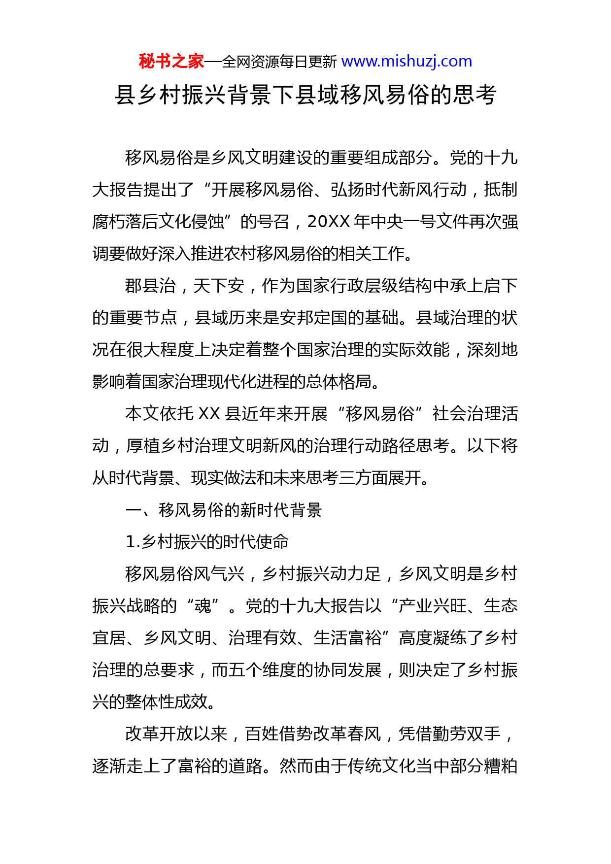 秘书之家—全网资源每日更新www.mishuzj.com县乡村振兴背景下县域移风易俗的思考移风易俗是乡风文明建设的重要组成部分。党的十九大报告提出了“开展移风易俗、弘扬时代新风行动,抵制腐朽落后文化侵蚀”的号召,20XX年中央一号文件再次强调要做好深入推进农村移风易俗的相关工作。郡县治,天下安,作为国家行政层级结构中承上启下的重要节点,县域历来是安邦定国的基础。县域治理的状况在很大程度上决定着整个国家治理的实际效能,深刻地影响着国家治理现代化进程的总体格局。本文依托XX县近年来开展“移风易俗”社会治理活动,厚植乡村治理文明新风的治理行动路径思考。以下将从时代背景、现实做法和未来思考三方面展开。一、移风易俗的新时代背景1.乡村振兴的时代使命移风易俗风气兴,乡村振兴动力足,乡风文明是乡村振兴战略的“魂”。党的十九大报告以“产业兴旺、生态宜居、乡风文明、治理有效、生活富裕”高度凝练了乡村治理的总要求,而五个维度的协同发展,则决定了乡村振兴的整体性成效。改革开放以来,百姓借势改革春风,凭借勤劳双手,逐渐走上了富裕的道路。然而由于传统文化当中部分糟粕秘书之家—全网资源每日更新www.mishuzj.com的影响,农村的乡风建设还面临着紧迫的问题,掣肘着乡村振兴的整体协同发展。“人情勿算债,尺四镬挈去卖”,正常人情往来被道德绑架,随份子、拼彩礼等现象在农村仍然在一定程度上盛行,令一些农村家庭陷入入不敷出,加剧了农村家庭的贫困现象。风成于上,俗形于下。促进农村移风易俗建设,书写出一幅文明、和谐、幸福的新画卷,是新时代美丽乡村建设的时代使命。2.习近平新时代中国特色社会主义思想的理论指示“风俗之变,迁染民志,关之盛衰”,党的十九大报告提出:“发展中国特色社会主义文化,就是以马克思主义为指导,坚守中华文化立场,立足当代中国现实,结合当今时代条件,发展面向现代化、面向世界、面向未来的,民族的科学的大众的社会主义文化,推动社会主义精神文明和物质文明协调发展。”辩证唯物主义虽然强调世界的统一性在于它的物质性,但并不否认意识对物质的反作用,而是认为这种反作用有时是十分巨大的。良风美俗能够改变群众的生活方式,规范社会生活,促进社会的进步与发展。习近平总书记在《求是》发表文章指出,移风易俗是乡风文明建设的组成部分,是乡村治理的重要内容。为坚决贯彻落实习近平总书记重要指示精神,深入推进新时代秘书之家—全网资源每日更新www.mishuzj.com文明实践,破旧习、开新风、固机制,疏堵并举力戒“舌尖剩宴”是贯彻习近平新时代中国特色社会主义思想的理论命题。二、XX县推进移风易俗工作的主要做法XX县坚持把移风易俗作为推进新时代文明实践中心建设的切入点,在对基层进行充分调研的基础上,通过宣传教化、全面整治、细化机制、守正出新等四维发力,持续推进乡村文化振兴,提升乡村治理水平,取得阶段性成效。从20XX年X月开展试点以来,全县共简办丧事XXXX余场、新办婚事XXXX场,少办或简办各类一般喜事XXXX场。20XX年X-X月,节约办酒开支XXXX余万元。全县餐厨垃圾同比减少XXXX吨。总体成效上,村内脏、乱、差的状况得到有效治理,劳动力、金钱和劳动力得到有效节约,县内呈现婚事新办、喜事省办、葬事简办、捐助公益等新风尚。勤俭朴素的乡风民风在全县逐步形成,社会秩序明显改善。1.加强宣传教化,立好良风美俗“风向标”一是媒体大张旗鼓“宣”。通过掌心XX、文明XX公众号、XX发布等网络媒体,曝光一批婚丧嫁娶大操大办反面典型,旗帜鲜明地反对和批评高价彩礼、厚葬薄养等陈规陋习。秘书之家—全网资源每日更新www.mishuzj.com二是文体活动潜移默化“宣”。创编一批体现移风易俗主题的文艺节目,通过文化下乡和乡村村晚送到广大农村,如原创歌曲《文明新风尚》、相声《今年过年不一样》、小品《取经》等,受到了普遍欢迎。三是村规民约名正言顺“宣”。各村通过户主大会将移风易俗、酒席餐标、摆酒报备和治理事会纳入本村的村规民约,并纳入一户一档的文明诚信档案建设工作。各村在村文化广场、村民聚集地等显著位置设立移风易俗宣传栏,张贴、发放移风易俗倡议书;镇村干部一对一的入户宣传移风易俗,形成了浓厚氛围。四是宣讲队伍有的放矢“宣”。以餐厅酒店、单位食堂为重点,通过组建文明餐桌宣传员队伍,发挥“老施来了”宣讲团及市民督导团等作用,开展“适量点餐、健康饮食”宣传和督导。将违规吃喝纳入巡察范围,同时借助“两代表一委员”等社会力量开展监督。五是公职人员率先垂范“宣”。倡导党员干部签订移风易俗承诺书,做到带头引领。规范党员干部、公职人员操办婚丧喜庆事宜,提倡党员干部、公职人员一生只办X场酒宴,取消生育、升学、入伍、购车、购房等传统摆酒习俗。在公务接待中倡导和推行“分餐制、公勺公筷制”,确需在包厢就餐的,推行“N-X”点餐模式。并把人员主体扩展至“两代表一委员”和村后备干部。秘书之家—全网资源每日更新www.mishuzj.com2.化全面整治,管好协同治理“责任田一是面上牵头抓总。县文明办对外公布移风易俗监督举报电话XXXXXXX,县委组织部抽调X名退二线的老同志组成移风易俗督导组,分三组对乡镇(街道、园区)