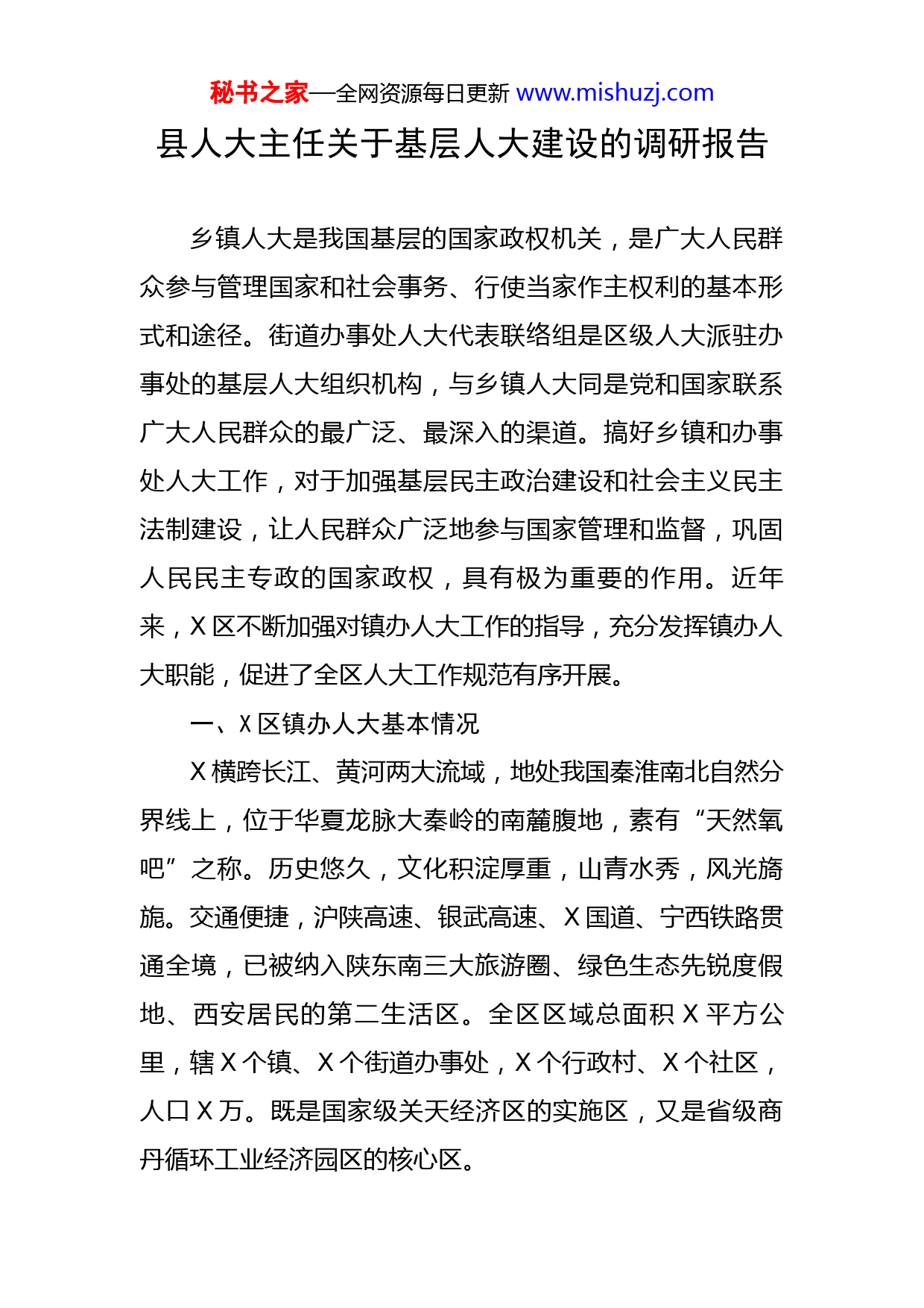 秘书之家—全网资源每日更新www.mishuzj.com县人大主任关于基层人大建设的调研报告乡镇人大是我国基层的国家政权机关,是广大人民群众参与管理国家和社会事务、行使当家作主权利的基本形式和途径。街道办事处人大代表联络组是区级人大派驻办事处的基层人大组织机构,与乡镇人大同是党和国家联系广大人民群众的最广泛、最深入的渠道。搞好乡镇和办事处人大工作,对于加强基层民主政治建设和社会主义民主法制建设,让人民群众广泛地参与国家管理和监督,巩固人民民主专政的国家政权,具有极为重要的作用。近年来,X区不断加强对镇办人大工作的指导,充分发挥镇办人大职能,促进了全区人大工作规范有序开展。一、X区镇办人大基本情况X横跨长江、黄河两大流域,地处我国秦淮南北自然分界线上,位于华夏龙脉大秦岭的南麓腹地,素有“天然氧吧”之称。历史悠久,文化积淀厚重,山青水秀,风光旖旎。交通便捷,沪陕高速、银武高速、X国道、宁西铁路贯通全境,已被纳入陕东南三大旅游圈、绿色生态先锐度假地、西安居民的第二生活区。全区区域总面积X平方公里,辖X个镇、X个街道办事处,X个行政村、X个社区,人口X万。既是国家级关天经济区的实施区,又是省级商丹循环工业经济园区的核心区。秘书之家—全网资源每日更新www.mishuzj.comX年撤乡并镇以来,X所辖镇办数由原X个减少为X个,镇办人大工作机构包括X个镇人大主任团和X个街道办事处人大联络组。全区共有各级人大代表X名,其中省人大代表X名,市人大代表X名,区人大代表X名,镇人大代表X名。近年来,镇办人大工作在区人大常委会的悉心指导下,在同级党委的坚强领导下,在全区各级各部门和X万人民群众的大力支持下,各项工作开展得丰富多彩,富有成效。一是人大意识不断增强。近几年来,随着我国基层民主法制建设的深入发展,通过普法宣传、换届选举和依法治理工作的开展,干部群众心目中,已把镇办人大看成我国地方国家机关的重要权力机关,在日常生活中,群众有困难找人大,监督政府寻人大的思想已基本形成,镇办人大的地位和作用得到充分显现。二是干部队伍坚强有力。目前,全区镇办共配备专职镇人大主任、办事处人大联络组X人(刘湾街道办事处人大联络组组长因工作需要调至商洛市城建局工作)。X名基层专职人大负责同志,年龄最大的X岁,最小的X岁,平均年龄X岁,具有本科以上学历X人,大专学历X人,中专学历X人,镇办人大干部队伍呈梯次搭配,大部分都是多年担任科级领导职务而转任的干部,具有比较丰富的工作经验和扎实的理论素养,有利于全区镇办人大工作的平秘书之家—全网资源每日更新www.mishuzj.com稳、可持续发展。三是阵地建设取得实效。镇办人大代表活动室和代表活动小组是我区各级人大代表开展代表活动、依法履行职责的重要依托。全区以镇办人大为单位,将省、市、区、镇四级人大代表交叉编组,组建了人大代表活动小组X个,其中中心活动小组X个,并按照“六有”标准,建设了X个代表活动室和固定活动场所,促进了代表各项活动正常开展。四是代表活动丰富多彩。在上届人大任期内,我们组织在全区人大代表中开展了“六个一”主题活动,本届人大自今年任职以来,区人大常委会作出了在代表中开展X主题活动,通过代表主题活动的开展,为代表依法履职搭建了较好的履职平台,代表活动形式多样,内容具体生动,深受人民群众好评。五是镇办人大的职能得到发挥。各镇能够依照法定程序,认真组织代表开好镇人民代表大会,听取主任团、镇人民政府等各项工作报告,选举产生镇人大、政府领导班子,作出关于镇域经济、精神文明、实施法律法规的决议决定,向镇政府及其工作部门提出合理化的议案、建议和批评意见,认真执行好人代会的法定职权。能够认真组织各级代表学习培训、视察调研、执法检查,参加镇办组织的各类民主测评会、工作评议会、汇报座谈会、法庭庭审秘书之家—全网资源每日更新www.mishuzj.com会等,依法行使监督职权,促进了镇办各项工作。二、全区镇办人大工作的具体做法近年来,X区各镇和办事处人大坚持以习近平新时代中国特色社会主义思想为指导,紧紧围绕上级和同级党委的重大决策、经济建设中心,依法履行各项法定职权,为促进全区民主法制建设和经济社会发展做出了积极贡献。(一)各级高度重视,全力保障镇办人大工作。一是区委高度重视人大常委会关于基层人大工作人员人事安排建议,根据工作需要,及时配备镇人大主任和办事处人大联络组长,为基层人大工作提供组织保证。二是全区各镇、办事处党委将人大工作列入了重要议事日程,每年每季度至少听取或专题研究一次镇办人大工作,及时解决镇办人大工作中急需解决的困难和问题。镇办人大在行使职权过程中,涉及有关重大问题时能及时向同级党委报告,需要党委统筹协调的,也得到了党委的支持,保障了人大工作的顺利开展。三是在区人大常委会的指导下,全区镇人大主任团、办事处人大联络组均设置了办公室,建立健全了各类工作制度。四是镇政府、街道办事处对镇办人大行使职权所需的各项经费基本予以保障,全区各镇已把人代会、主任团会议、人大代表闭会期间的活动经费列入了财政预算,办事处也将代表闭会期间的活动经费予以优先保障,为镇办人大工作的顺利开展提