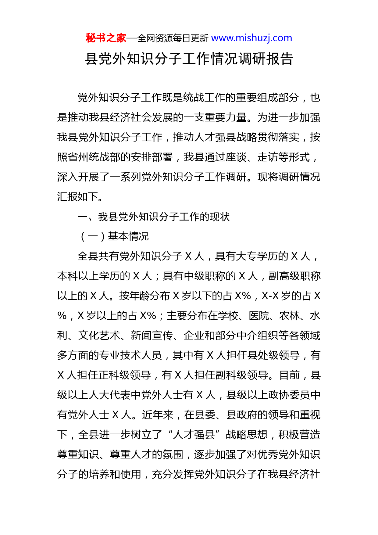 秘书之家—全网资源每日更新www.mishuzj.com县党外知识分子工作情况调研报告党外知识分子工作既是统战工作的重要组成部分,也是推动我县经济社会发展的一支重要力量。为进一步加强我县党外知识分子工作,推动人才强县战略贯彻落实,按照省州统战部的安排部署,我县通过座谈、走访等形式,深入开展了一系列党外知识分子工作调研。现将调研情况汇报如下。一、我县党外知识分子工作的现状(一)基本情况全县共有党外知识分子X人,具有大专学历的X人,本科以上学历的X人;具有中级职称的X人,副高级职称以上的X人。按年龄分布X岁以下的占X%,X-X岁的占X%,X岁以上的占X%;主要分布在学校、医院、农林、水利、文化艺术、新闻宣传、企业和部分中介组织等各领域多方面的专业技术人员,其中有X人担任县处级领导,有X人担任正科级领导,有X人担任副科级领导。目前,县级以上人大代表中党外人士有X人,县级以上政协委员中有党外人士X人。近年来,在县委、县政府的领导和重视下,全县进一步树立了“人才强县”战略思想,积极营造尊重知识、尊重人才的氛围,逐步加强了对优秀党外知识分子的培养和使用,充分发挥党外知识分子在我县经济社秘书之家—全网资源每日更新www.mishuzj.com会发展中的重要作用。为调动和发挥好这一群体的积极作用,我县于X年下半年成立了X县党外知识分子和社会新阶层人士联谊会,并争取每年X万元工作经费列入财政预算。(二)党外知识分子队伍发展特征随着县域经济社会的快速发展,我县党外知识分子队伍也发生很大的变化,主要表现为:1、党外知识分子数量迅速增加,分布范围逐步扩大。随着社会进步和科教事业的发展,知识分子在全县总人口的比例越来越高,总量越来越大,队伍在不断壮大。同时学历层次越来越高,整体素质不断提高,而且年轻化趋势明显。过去,党外知识分子主要集中在科、教、文、卫等几家单位,随着市场经济的发展,党外知识分子进入了非公有制经济领域、各种中介组织等新社会阶层,出现了一大批以党外知识分子为主体的民营企业主。2、党外知识分子队伍流动加剧,内部构成发生变化,社会影响力不断增加。随着改革的深化,相当数量的党外知识分子已经从单一的国家干部队伍中分离出来,逐步向专业化、多样化的方向转变。有的成为经济界名人、有的成为社会名流,对民众的影响力日益增加。3、社会地位提高、政治诉求增强。党外知识分子一般文化水平较高、在所处行业或领域中具有较高造诣和影响秘书之家—全网资源每日更新www.mishuzj.com力,因此有较广泛的社会联系和活动能力,有较为强烈的参政议政意愿和能力,是我县一支不可忽视的政治和社会力量,他们在当地经济社会发展中扮演着越来越重要的角色。二、工作主要做法(一)加强领导、健全机制、形成合力。我们把党外知识分子工作作为搞好多党合作的重要内容,摆在重中之重。先后健全完善了联系会议制度、情况定期通报制度、县级领导干部联系党外知识分子制度以及抓党外知识分子工作责任制等机制,逐步形成了工作合力。(二)搭建平台、发挥作用。一是要求各政府部门要主动加强与党外知识分子的联系,每年邀请党外人士参与单位的工作评议和民主监督。县纪委每年聘请部分党外知识分子担任行风评议员和特约监督员,对职能部门进行工作和行风监督,效果明显。二是通过人大、政协平台,每年以建议案和提案的形式,充分发挥党外知识分子参政议作用。(三)培养和任用党外知识分子的力度不断增强。首先是在人大政协换届中,按照界别结构,共有名党外知识分子当选县人大代表和县政协委员(其中县人大代表人,县政协委员人),极大的调动了党外知识分子的工作积极性,激发了党外知识分子要求进步的热情。二是拓宽视野秘书之家—全网资源每日更新www.mishuzj.com选人。党外知识分子大多数处在业务工作岗位,担任单位中层领导人数很少,对此,我们不拘一格,放宽选人渠道。结合年度领导班子和领导干部考核,把推荐党外后备干部作为一项内容,实行民主推荐。三是严格标准荐人。向组织部门举荐人选是党外知识分子实职安排工作的最重要一环,举荐人选的使用情况反映出了我们的工作效果。所以我们在这一环上,严格参照《党政领导干部选拔任用工作条例》,做到规范化举荐。一是重实绩。对每位党外知识分子,结合所在单位党组织,每年都制订出岗位目标任务,年底考核,记入档案,切实做到以实绩论人,凭政绩取人。二是严格程序。对已经培养成熟的后备干部,由部长办公会议研究决定后,举荐给组织部门,组织部门依据全县干部使用计划研究定为考核对象,由组织部和统战部共同进行定向考核,考核实行公示制度,考核方式有民主测评、座谈了解和组织推荐。三、工作中存在的问题面对党外知识分子队伍发生的新变化,不仅党外知识分子工作任务日益繁重,而且也暴露出许多不适应形势发展的问题。(一)思想认识不够到位。全社会尚未真正形成尊重知识、尊重人才的良好风尚,缺乏有利于各类优秀人才脱颖而出的社会环境;对党外知识分子先进事迹的报道较秘书之家—全网资源每日更新www.mishuzj.com少,党外知识分子不易引起社会的关注;同党外同志思想交流少,生活困难过问少,工作委以重任少;爱才惜才意识比较淡薄,缺乏感情留人、环境