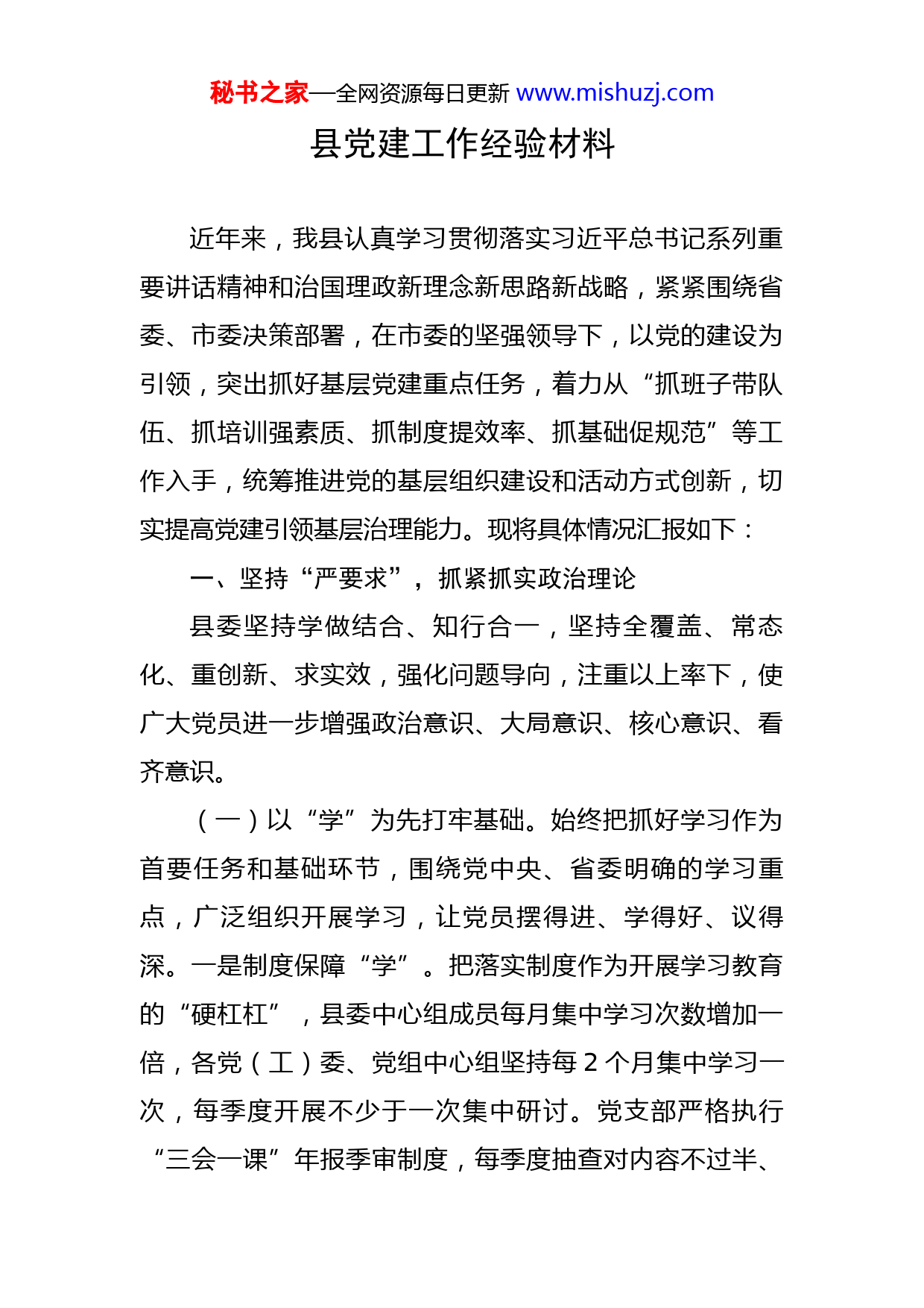 秘书之家—全网资源每日更新www.mishuzj.com县党建工作经验材料近年来,我县认真学习贯彻落实习近平总书记系列重要讲话精神和治国理政新理念新思路新战略,紧紧围绕省委、市委决策部署,在市委的坚强领导下,以党的建设为引领,突出抓好基层党建重点任务,着力从“抓班子带队伍、抓培训强素质、抓制度提效率、抓基础促规范”等工作入手,统筹推进党的基层组织建设和活动方式创新,切实提高党建引领基层治理能力。现将具体情况汇报如下:一、坚持“严要求”,抓紧抓实政治理论县委坚持学做结合、知行合一,坚持全覆盖、常态化、重创新、求实效,强化问题导向,注重以上率下,使广大党员进一步增强政治意识、大局意识、核心意识、看齐意识。(一)以“学”为先打牢基础。始终把抓好学习作为首要任务和基础环节,围绕党中央、省委明确的学习重点,广泛组织开展学习,让党员摆得进、学得好、议得深。一是制度保障“学”。把落实制度作为开展学习教育的“硬杠杠”,县委中心组成员每月集中学习次数增加一倍,各党(工)委、党组中心组坚持每2个月集中学习一次,每季度开展不少于一次集中研讨。党支部严格执行“三会一课”年报季审制度,每季度抽查对内容不过半、秘书之家—全网资源每日更新www.mishuzj.com组织生活走形式的支部及时补课,使组织制度成为党员政治学习的阵地、思想交流的平台、党性锻炼的熔炉。二是领导带动“学”。县四套班子领导每周到分管部门组织学习、参加会议、指导工作不少于1次,把握不同党员群体学习需求和思想认识的困惑点,制定《学习任务推进表》,确保学习内容丰富、重点突出、常抓不懈。各级领导带动广大党员干部对十九大和十九届历次全会精神进行了充分学习,并把学习和宣传有机结合,做到学深学透、深入人心。三是平台特色“学”。定期向“一网三平台”推送优秀党课讲稿、研讨纪实和学习视频等,实时更新微信平台课程,引导党员开展“缝隙化学习”,党员参加在线教育学习达xx万余人次。(二)以“做”为本抓住关键。坚持做的严要求,抓在点滴、落在细微,推动基层组织和党员当好表率、立起标杆。一是层层压实责任。坚持把推进学习教育纳入各级党组织管党治党的责任清单,作为党组织书记抓党建述职述责重要内容,一级抓一级,层层抓落实,建立起任务明确、措施具体、目标清晰、考核严格的责任体系。今年以来,机关部门“一把手”带头到联系点讲党课、作辅导、搞调研xx次,牵头解决了一大批群众关心的实际问题。二是分类精准指导。县级层面和直管党(工)委设立协调小组31个,通过抽查互查“三会一课”、“5+X”和七项集秘书之家—全网资源每日更新www.mishuzj.com中整治等工作落实情况xx余次,现场督查xx余次,发现及整改问题xx余条,印发县《组织工作常用文件汇编》xx册,供全县基层党组织学习使用,确保学习教育常态化制度化落到实处。三是搭建平台发挥作用。建立完善在职党员“一岗双责”、无职党员“设岗定责”机制,让每个党员知责明责、履责尽责。今年以来,各基层党组织开展服务群众1700余次,不断搭建党员实践平台,模范践行“四个合格”标准。(三)以“改”为重突出实效。坚持问题导向,时刻检视存在的差距和不足,把学习教育各项工作抓紧、抓牢、抓实、抓细。一是严肃党性体检。各级党组织查找分析在组织生活、党员教育管理、服务群众等方面问题xx条,引导广大党员对照“四风”“四气”、“七个不讲”、“六坚持、六表率”,查摆问题xx万余条,制定整改措施xx万余条,销号整改、学做互进、知行合一。二是狠抓问题整改。各级党组织把督查组反馈和举一反三发现的xx个问题漏洞,开展销号式整改,把整改成效作为衡量自身作风转变成果的标尺,为维护我县社会大局安定祥和做出贡献。三是督办整治问责。建立问题整改督办机制,开展专项督查和“回头看”,对整改问题不力、时间进度缓慢的党组织下发督办函xx份,组织处理xx人次,层层传导压力、层层责任压紧。秘书之家—全网资源每日更新www.mishuzj.com二、找准“着力点”,筑实筑牢基层基础县委牢固树立“重视基层、加强基础、服务基层”工作理念,始终把强基层强基础作为重中之重,以基层党组织重点工作集中整治为契机,不断夯实基层党建工作基础。(一)聚焦党员有效管理,规范做好组织关系集中排查。进一步落实党员管理制度,从规范党员组织关系有效管理着手,从源头上治理党员组织关系“空挂”“失联”等现象,解决“口袋党员”“隐身党员”等问题。一是抓住“关键”环节,明确排查工作标准。出台全县工作方案,明确各步骤、各阶段时间节点和工作要求。分别在排查工作前、失联党员查找过程中、开展组织处置前3个关键环节对各基层党组织书记、党务专干开展专题培训班,教会基层怎样去排查,进一步明确工作标准。二是开展“双找”活动,多方查找失联党员。在全县范围广泛开展以“组织找党员、党员找组织”为主要内容的“双找”活动,着力将每名党员纳入党组织有效管理,对排查发现的xx名失联党员,各级党组织通过走访亲属、查询社保等方式重新联系上xx名失联党员。三是坚持“三审”把关,帮助失联党员归队。分析“失联”客观和主观原因,通过分解责任,实行“一对一”帮扶教育,帮助xx名失