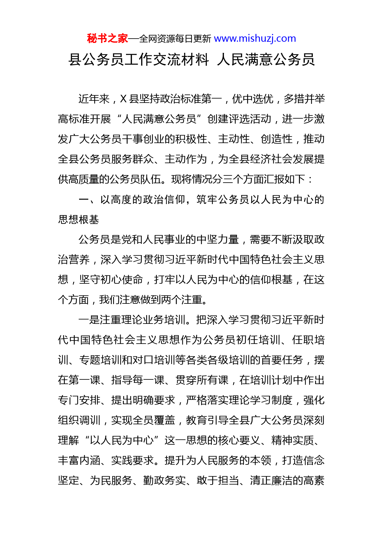秘书之家—全网资源每日更新www.mishuzj.com县公务员工作交流材料人民满意公务员近年来,X县坚持政治标准第一,优中选优,多措并举高标准开展“人民满意公务员”创建评选活动,进一步激发广大公务员干事创业的积极性、主动性、创造性,推动全县公务员服务群众、主动作为,为全县经济社会发展提供高质量的公务员队伍。现将情况分三个方面汇报如下:一、以高度的政治信仰,筑牢公务员以人民为中心的思想根基公务员是党和人民事业的中坚力量,需要不断汲取政治营养,深入学习贯彻习近平新时代中国特色社会主义思想,坚守初心使命,打牢以人民为中心的信仰根基,在这个方面,我们注意做到两个注重。一是注重理论业务培训。把深入学习贯彻习近平新时代中国特色社会主义思想作为公务员初任培训、任职培训、专题培训和对口培训等各类各级培训的首要任务,摆在第一课、指导每一课、贯穿所有课,在培训计划中作出专门安排、提出明确要求,严格落实理论学习制度,强化组织调训,实现全员覆盖,教育引导全县广大公务员深刻理解“以人民为中心”这一思想的核心要义、精神实质、丰富内涵、实践要求。提升为人民服务的本领,打造信念坚定、为民服务、勤政务实、敢于担当、清正廉洁的高素秘书之家—全网资源每日更新www.mishuzj.com质专业化公务员队伍。X年度,共分X期对全县X余名乡科级干部和科级以下公务员进行集中培训。二是注重先进教育。按照工作要求,按照公务员工作业务要求,岗位职责要求、职业道德要求,同时结合主题党日、讲党课等党内政治生活,不断强化宗旨意识,对照入党誓词,对标时代要求,树牢群众观念,做到心中有党,心中有民,组织公务员观看先进典型人物影片,引导公务员自觉以先进典型为标杆,对照先进找差距、明方向、添措施,让公务员树立以“勤政爱民为荣,以懒政怠政为耻;以造福百姓为荣,以碌碌无为为耻”的正确的人生观和价值观,打造信念坚定、为民服务、勤政务实、敢于担当、清正廉洁的高素质专业化公务员队伍,营造人人争当“人民满意公务员”的良好氛围。二、以务实的制度建设,强化人民满意公务员的长效机制一是创新工作机制,增强服务群众满意的制度建设。积极做好机构改革及人员配备工作。按照中央、省、市机构改革工作要求,X年X月,按照“三定方案”结合X实际,在全市率先完成党政机关、事业机构、乡镇机关改革,在工作中我们结合实际设置了全县党建指导服务中心、综治中心、行政服务中心、农村经济发展指导服务中心、小微权力规范运行X大中心,强化行政服务中心建秘书之家—全网资源每日更新www.mishuzj.com设,为全县公务员服务群众提供坚强的组织保证,全县公务员立足工作本职,提升机关工作效能,找准本职工作定位,把完成工作任务与实现群众利益统一起来。紧扣本部门主责主业,在推进简政放权、提高服务效能、优化营商环境攻坚克难,争先创优,从根本上切断“中梗阻”等问题,着力打通服务“最后一公里”,进一步梳理行政许可和公共服务事项,简化服务流程,压缩办理时限,提高办事效率。加快“互联网+”建设,让数据多跑路、群众少跑腿,实现群众办事“在家办、自助办、就近办、方便办”。组织开展“一进二帮三提升”活动(公务员进基层,帮基层谋发展、帮群众解难题,提升基层工作水平、提升群众工作能力、提升党群干群关系),下基层服务群众X万余人次,推动了基层发展,促进了社会和谐,受到基层群众的普遍认可和欢迎。二是突出一线倾斜,注入担当作为的“强心剂”。坚持向乡镇基层倾斜、向经济发展主战场倾斜、向服务重点工作的工作导向,印发《关于加强乡镇干部队伍建设的实施意见》,我们称之为乡镇干部队伍建设X个起来,即让进人路径明起来,让干部交流活起来,让晋升渠道畅起来,让工资待遇涨起来,让能力素质强起来,让工作环境好起来,让执法职能硬起来,让舆论导向树起来,让问责机制准起来。坚持机构和编制资源向乡镇倾斜,鼓励县直秘书之家—全网资源每日更新www.mishuzj.com干部到乡镇工作。有计划逐步提高乡镇人员的工资待遇,力争五年内乡镇人员整体工作待遇高于县直单位X。借助乡镇机构改革和事业单位改革,积极落实“减县补乡”政策,坚持县直“瘦身”、乡镇“强身”原则,最大限度推进人员编制下沉,充实乡镇队伍力量,着力解决乡镇编制少、人员少、装备差、力量弱的难题。共向各乡镇下沉干部X名,其中X名用于乡镇综合行政执法队伍,结合乡镇基本职权事项目录,对各乡镇职权事项目录进行补充完善,印发《关于公布乡镇权责清单目录(X)的决定》,公布乡镇职权事项目录X项,最大限度向乡镇赋权赋能X项,始终秉持以人为本、执法为民理念,立足于为群众办好事、办实事,以服务型行政执法建设为抓手,推行“第一次提醒,第二次警示,第三次警告,第四次严格依法处理”的柔性执法四步工作法,以规范劝导为主“提倡有温度的执法”,使基层执法既有力度又有温度,实现了综合执法与为民服务有机融合,切实提高群众满意度,该先进做法得到X的充分肯定和高度评价,多次组织专题调研组深入我县进行实地观摩调研,市委、市政府在我县召开全市现场推进会,将X的先进经验作为典型在全市范围进行推广,全省各相关县区都前来进行经验学习,新华网、大河网、《