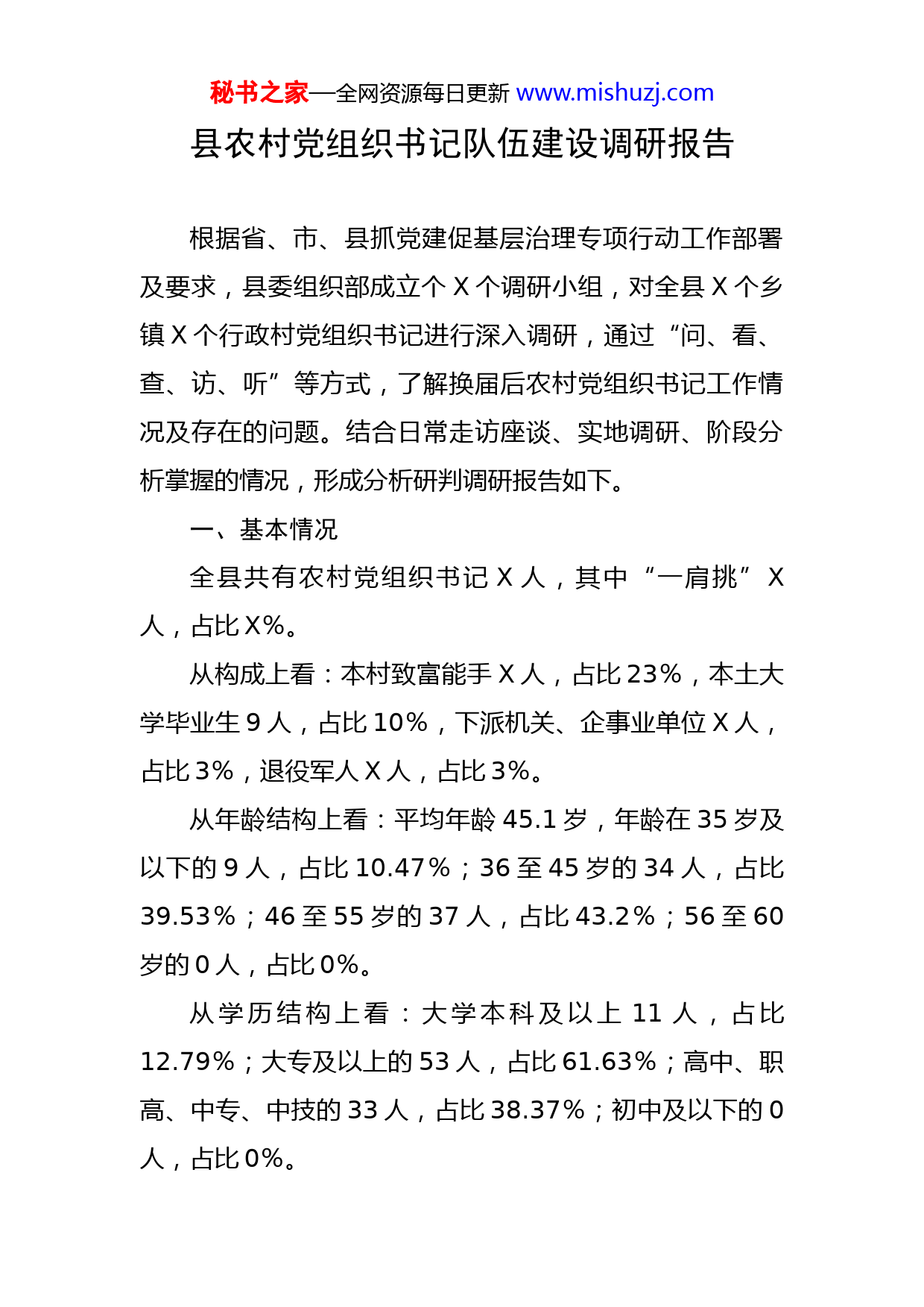 秘书之家—全网资源每日更新www.mishuzj.com县农村党组织书记队伍建设调研报告根据省、市、县抓党建促基层治理专项行动工作部署及要求,县委组织部成立个X个调研小组,对全县X个乡镇X个行政村党组织书记进行深入调研,通过“问、看、查、访、听”等方式,了解换届后农村党组织书记工作情况及存在的问题。结合日常走访座谈、实地调研、阶段分析掌握的情况,形成分析研判调研报告如下。一、基本情况全县共有农村党组织书记X人,其中“一肩挑”X人,占比X%。从构成上看:本村致富能手X人,占比23%,本土大学毕业生9人,占比10%,下派机关、企事业单位X人,占比3%,退役军人X人,占比3%。从年龄结构上看:平均年龄45.1岁,年龄在35岁及以下的9人,占比10.47%;36至45岁的34人,占比39.53%;46至55岁的37人,占比43.2%;56至60岁的0人,占比0%。从学历结构上看:大学本科及以上11人,占比12.79%;大专及以上的53人,占比61.63%;高中、职高、中专、中技的33人,占比38.37%;初中及以下的0人,占比0%。秘书之家—全网资源每日更新www.mishuzj.com奖惩情况:受到省、市、县奖励的8人,占比9.3%;受到处分的2人,占比2%二、工作开展情况(一)思想政治方面政治站位较高,能够学习、宣传和贯彻执行党的路线方针政策和党中央、上级党组织及本村党员大会(党员代表大会)的决议。(二)村党组织建设方面能够教规范组织开展党的组织生活,加强党员主体意识。督促党员履行义务,抓好入党积极分子的教育和培养。带头执行党风廉政建设各项规定,抓好对村“两委”班子成员的教育管理和监督。(三)联系群众方面了解群众所思所想,听取群众对村党支部工作的意见建议,做好思想政治工作。组织党员干部为群众办实事做好事,及时解决涉及群众切身利益的实际问题,做好困难群众帮扶工作。坚持服务群众、依靠群众,组织村民群众有序参与村经济民主选举、民主决策、民主管理、民主监督实践,支持和保障村民依法开展自治活动。(四)维护农村稳定方面加强村民群众教育,提高群众的法律意识、道德素质和集体观念。抓好社会治安综合治理、平安创建、人民调秘书之家—全网资源每日更新www.mishuzj.com解、计划生育等工作。疏导和化解矛盾纠纷,促进社会和谐稳定。。三、存在的问题(一)整体素质不高,无能力干事。从构成上看,新任党组织书记X人,占比54.6%;从年龄结构上看,年龄在35岁及以下的X人,占比10.47%,46至55岁的X人,占比43.2%;从学历上看,大专及以上的X人,占比X%,且多为函授。村党组织书记队伍整体年龄结构偏大、学历偏低,能力素质不高,致富带富能力不强,与当前推进乡村振兴战略、巩固脱贫成果的工作的需求不相适应。突出表现在三个方面:一是致富带富能力与群众盼望致富、过上幸福生活的要求不适应;二是工作方式方法与创新农村社会治理的要求不适应,不少党组织书记还没有从旧的工作方式中解脱出来,存在着“老办法不适用,新办法不会用,软办法不管用,硬办法不敢用”的问题,不知道该如何开展工作,遇事经常束手无策;三是服务意识与群众需求不适应。当前,村民在生产、信贷、销售、劳务输出等经济领域,在居住、文教、养老等社会领域,期盼着能够得到越来越多的优质高效的服务,而不少村组织书记的工作仅限于传达会议精神、宣传政策、帮助争取贷款、组织发放补贴等浅层次服务工作上,群众不认可、不买账。秘书之家—全网资源每日更新www.mishuzj.com(二)工作任务重,疲于应付。现在农村的工作越来越多,党建、乡村振兴、防返贫监测、美丽乡村、综治为慰问、疫情防控等等,各种工作让村“两委”干部应接不暇,村党组织书记作为各项工作的领导者、推动者,任务更加重。为满足各项工作任务要求及检查,很多时候不得不疲于应付。(三)任务推动人数不足,无人想干事。一是随着城镇化进程的加快,农村人口流动日趋活跃,大批有文化的青年、有能力先富起来的人员流向城市、城镇安家落户;大量的优秀人才通过考取大中专院校输送出去,回到农村的几乎为零,既使有些回到农村,也不愿长期呆在村里当村干部。本土发展基础薄弱“难留人”,能力强、素质高的人才“不愿留”,村干部来源受限。二是部分“两委”班子成员由于工资报酬较低,不能养家糊口,不得不外出打工,造成村“两委”干部有效工作力量不足。四、对策建议(一)多措并举,激发村党组织书记工作主动性、积极性。一是按照《XX县村党组织书记星级化管理实施方案》和《XX县村党组织书记星级化管理实施细则》对村党组织书记进行星级化管理。对于业绩突出、星级较高的X周岁及以下,具有大专及以上学历,表现优秀、群众公认的党组织书记采取业绩考核、组织考察等方式,通过专项秘书之家—全网资源每日更新www.mishuzj.com招聘纳入乡镇事业编制,并继续在村工作;对于因年龄、学历等因数不宜纳入乡镇事业编制的,但业绩突出、星级较高的村党组织书记可通过业绩考核、组织考察等方式,经县委批准,参照同等事业编村党组织书记核定报酬待遇。二是从严从紧对党组织进行考核。每年乡镇党委对村党组织书记进行年度考核,对于连续两年评为“不合格”的党组织书记进行约谈,撤职更换。(二)多管其下,提升村党组织书记整体素质,综合能力。一是外出参观学习。疫情过后,分批分期组织外出考察学习,帮助拓宽视野、开阔眼界、