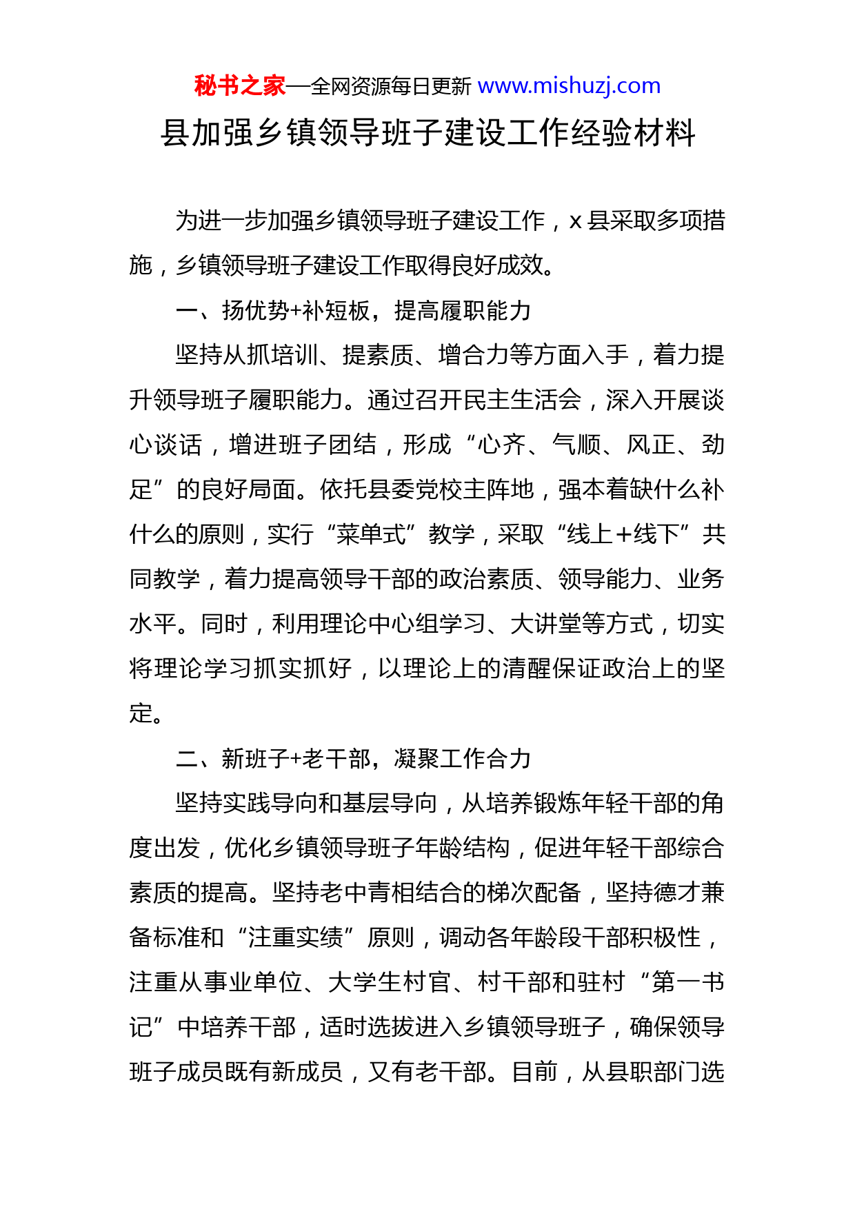 秘书之家—全网资源每日更新www.mishuzj.com县加强乡镇领导班子建设工作经验材料为进一步加强乡镇领导班子建设工作,x县采取多项措施,乡镇领导班子建设工作取得良好成效。一、扬优势+补短板,提高履职能力坚持从抓培训、提素质、增合力等方面入手,着力提升领导班子履职能力。通过召开民主生活会,深入开展谈心谈话,增进班子团结,形成“心齐、气顺、风正、劲足”的良好局面。依托县委党校主阵地,强本着缺什么补什么的原则,实行“菜单式”教学,采取“线上+线下”共同教学,着力提高领导干部的政治素质、领导能力、业务水平。同时,利用理论中心组学习、大讲堂等方式,切实将理论学习抓实抓好,以理论上的清醒保证政治上的坚定。二、新班子+老干部,凝聚工作合力坚持实践导向和基层导向,从培养锻炼年轻干部的角度出发,优化乡镇领导班子年龄结构,促进年轻干部综合素质的提高。坚持老中青相结合的梯次配备,坚持德才兼备标准和“注重实绩”原则,调动各年龄段干部积极性,注重从事业单位、大学生村官、村干部和驻村“第一书记”中培养干部,适时选拔进入乡镇领导班子,确保领导班子成员既有新成员,又有老干部。目前,从县职部门选秘书之家—全网资源每日更新www.mishuzj.com拔x名优秀年轻干部到乡镇领导岗位任职,全县x个乡镇领导班子成员中,从事业单位选拔x人,从村干部中选拔x人(其中:有村干部工作经历x人,x人担任过大学生村官,x人担任过驻村第一书记或驻村工作队员)。同时,结合边境实际,x个边境乡镇,沿边小康村工作队长和边境派出所所长挂任、兼任乡镇党委副书记。目前,x个乡镇领导班子中,配备了x名35岁以下乡镇党政正职,x名女党政正职,每个乡镇领导班子中至少配备了一名女干部和一定比例少数民族干部。乡镇领导力量得到有效加强,班子结构进一步优化,整体综合素质进一步提升。三、强保障+重培养,激发干事激情认真贯彻落实上级有关乡镇干部待遇文件通知要求,加大乡镇基础设施投入,确保乡镇补贴落实到位工作、生活条件得到改善。关注乡镇干部心理和身体健康,适时开展乡镇干部谈心谈话,并选派乡镇干部外出培训、挂职锻炼,近三年来,选派乡镇干部参加外出培训x人次,挂职锻炼x人次。同时,将乡镇作为培养干部的主阵地、作为干部干事创业的主战场,并在干部选拔、职级晋升中向基层一线倾斜。近三年来,乡镇主要领导提拔为处级领导x名,乡镇副职提拔为乡镇党政正职x名,从县直部门选拔x名优秀干部担任乡镇党委书记,x名副科级干部担任乡镇党委副书记,x名班子成员在符合条件下优先得到职级晋升。秘书之家—全网资源每日更新www.mishuzj.com四、强监督+重考核,增强班子活力坚持把干部监督作为增强班子活力的有力措施,健全完善领导班子成员选任档案任前审核和征求公检法系统、纪检、审计、信访等部门意见制度,有效防止干部“带病提拔”“带病上岗”。同时,建立乡镇领导班子和干部考核结果综合研判机制,充分运用各类考核、考察、督查审计等方面结果,定期对乡镇领导班子整体结构、运行状况、优化方向等方面进行分析研判,注重发挥综合研判在干部调整、选拔和日常管理中的基础作用,激励全县各级领导班子和干部干事创业。