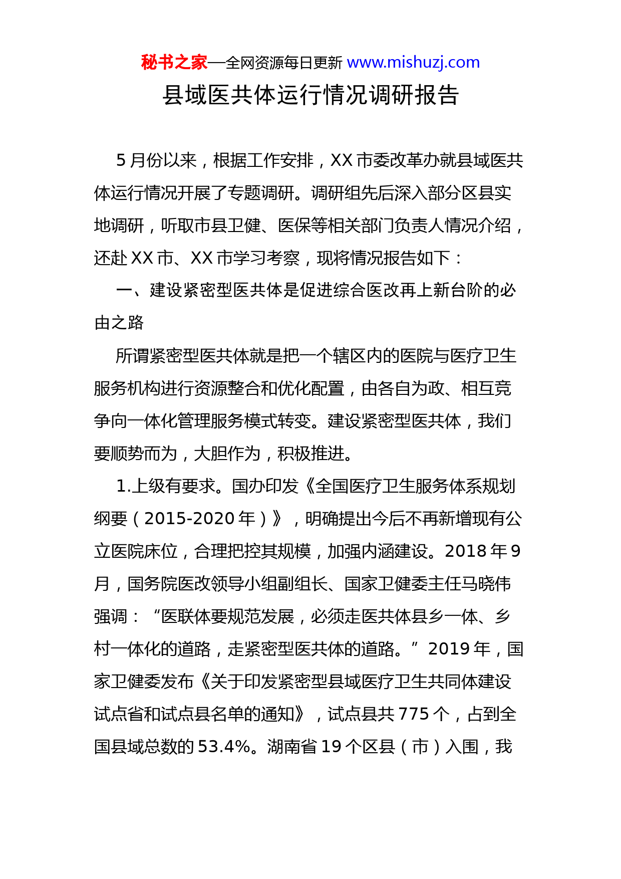 秘书之家—全网资源每日更新www.mishuzj.com县域医共体运行情况调研报告5月份以来,根据工作安排,XX市委改革办就县域医共体运行情况开展了专题调研。调研组先后深入部分区县实地调研,听取市县卫健、医保等相关部门负责人情况介绍,还赴XX市、XX市学习考察,现将情况报告如下:一、建设紧密型医共体是促进综合医改再上新台阶的必由之路所谓紧密型医共体就是把一个辖区内的医院与医疗卫生服务机构进行资源整合和优化配置,由各自为政、相互竞争向一体化管理服务模式转变。建设紧密型医共体,我们要顺势而为,大胆作为,积极推进。1.上级有要求。国办印发《全国医疗卫生服务体系规划纲要(2015-2020年)》,明确提出今后不再新增现有公立医院床位,合理把控其规模,加强内涵建设。2018年9月,国务院医改领导小组副组长、国家卫健委主任马晓伟强调:“医联体要规范发展,必须走医共体县乡一体、乡村一体化的道路,走紧密型医共体的道路。”2019年,国家卫健委发布《关于印发紧密型县域医疗卫生共同体建设试点省和试点县名单的通知》,试点县共775个,占到全国县域总数的53.4%。湖南省19个区县(市)入围,我秘书之家—全网资源每日更新www.mishuzj.com市有临澧县、澧县、津市市。这已吹响国家强基层、建紧密医供体的号角。2.发展有需要。建设紧密型医共体,能有效整合资源,重构服务网络,有效破解县域综合医改难题。山西运城市、安徽铜陵市综合医改成功,主要得益于建设紧密型医共体,其特点是“四共”:共“管”。医共体成员单位联合组建医共体管理委员会,共享先进管理经验,提升管理水平。制定共同章程和制度,界定各组成单位责权利,在诊疗服务、技术规范、事业发展等方面形成区域医疗合力。共“人”。实行人员自主招录和备案制管理,人才上下贯通。结合医共体区域特性,制定合理用人机制,建立能进能出、能上能下的用人机制,打通人员流通难题。共“财”。建立财务管理中心,统一负责医共体内财政预算、财务管理、审计监督。统一核算、统一分配,有效调剂区域内资金的使用,把资金用在“刀刃上”。共“信”。实现信息互联互通,保障各项诊疗信息互认,推进“互联网+医疗”服务模式,建立区域心电、影像、检验等中心,实现区域诊疗信息闭环效应。3.群众有期盼。现在,我国社会的主要矛盾已经转化为人民日益增长的美好生活需要和不平衡不充分的发展之间的矛盾。建设紧密型医共体,能让患者就近就廉享受高质量诊疗服务,有效解决群众看病难看病贵问题。运城市盐秘书之家—全网资源每日更新www.mishuzj.com湖区人民医院通过实施县乡一体化医疗改革,2019年县外就诊人次占比降低8个百分点,群众住院实际补偿比提高6个百分点;门急诊费用、自费比例、间接成本实现“三下降”,群众就医实现了少花钱、少跑路、看好病,满意度明显上升。铜陵市市立医院牵头组建“1+2+26”医共体,通过在专家库“点单”,预约副主任以上医师来社区坐诊;设立医共体中心药房,药品由中心药房统一集中采购;通过帮扶坐诊、手术示教等,有效提升卫生院服务能力。两市还探索“医疗和公共卫生融合”,组织公共卫生人员下沉,开展慢病精细化管理和疾病预防,让群众少生病和晚生病。二、XX市县域医共体现状分析近年来,特别是去年以来,市委政府坚持高位推进,加强工作调度,全市县域医共体建设取得了阶段性成果,截止目前,全市共13家县域医共体正式挂牌,其中,鼎城区、汉寿县各1家,桃源县、临澧县、石门县、澧县、津市市各2家,安乡县有县人民医院医疗集团挂牌。1.改革框架逐步搭建。制定下发《关于全面推行县域医共体建设的指导意见》,明确县域医共体试点工作的总体思路、工作目标和工作内容。落实县医改领导小组、县域医共体管理委员会的管理职责,县卫健部门负责监督管理医共体建设和运行。医共体内部由牵头单位与各成员单位秘书之家—全网资源每日更新www.mishuzj.com签订合作协议,成立医共体管理委员会,制定章程和相关制度。2.改革措施逐步推出。一是加强考核。实行季度考核与通报,对年底考核排名成效突出的,予以表彰奖励;对年终考核排名靠后的,在年度绩效考核中予以扣分。二是加强协作。不断加大投入,临澧县对基层医疗机构的财政投入按每年以8%的幅度增加,石门县对乡镇卫生院的补助经费全口径预算,两年内全部到位。下发《XX市县域医共体医疗保险费支付管理办法(试行)》,实行“总额预付、结余留用、合理超支分担”。三是加强帮扶。部门牵头医院与乡镇卫生院签订协议,免费接收乡村医生进修,组织乡镇卫生院开展常见病诊断培训,实战指导基层医生病例分析。3.改革成效逐步显现。一是分级诊疗在推进。2019年,县域内住院103.65万人次,同比增长5.8%,县级医院下转住院患者1010人次,同比增长88.4%。基层医疗卫生机构诊疗量1435.98人次;上转患者7712例次,同比增长22%。二是病种管理在实施。按病种、按人头、按床日等复合支付方式有序推进,有223种病纳入单病种付费目录,职工医保在二级、三级医疗机构住院报销实际补偿比例分别达80%、70%,居民医保在二级、三级医疗机构住院报销实际补偿比例达70%、60%。三是监测指标在好秘书之家—全网资源每日更新www.mishuzj.com转。像临澧县2019年县域医疗单位药占比为27.6%,百元医疗收入