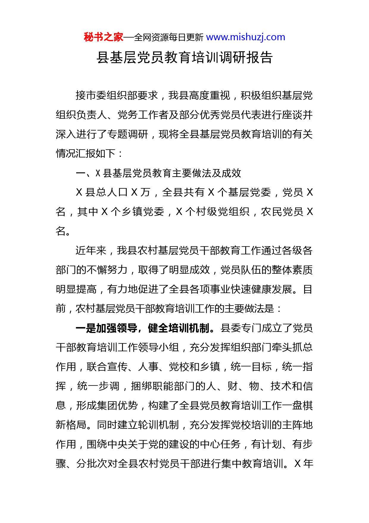 秘书之家—全网资源每日更新www.mishuzj.com县基层党员教育培训调研报告接市委组织部要求,我县高度重视,积极组织基层党组织负责人、党务工作者及部分优秀党员代表进行座谈并深入进行了专题调研,现将全县基层党员教育培训的有关情况汇报如下:一、X县基层党员教育主要做法及成效X县总人口X万,全县共有X个基层党委,党员X名,其中X个乡镇党委,X个村级党组织,农民党员X名。近年来,我县农村基层党员干部教育工作通过各级各部门的不懈努力,取得了明显成效,党员队伍的整体素质明显提高,有力地促进了全县各项事业快速健康发展。目前,农村基层党员干部教育培训工作的主要做法是:一是加强领导,健全培训机制。县委专门成立了党员干部教育培训工作领导小组,充分发挥组织部门牵头抓总作用,联合宣传、人事、党校和乡镇,统一目标,统一指挥,统一步调,捆绑职能部门的人、财、物、技术和信息,形成集团优势,构建了全县党员教育培训工作一盘棋新格局。同时建立轮训机制,充分发挥党校培训的主阵地作用,围绕中央关于党的建设的中心任务,有计划、有步骤、分批次对全县农村党员干部进行集中教育培训。X年秘书之家—全网资源每日更新www.mishuzj.com来,县委培训农村基层“三委”负责人X人次,乡镇党委培训农村党员干部X万人次。二是整合资源,构建培训网络。利用各级党校进行普及型培训;依托大专院校、职业技术学校进行正规化学历培训;依托各系统各部门进行系统化专业化培训。通过上下联动、点面结合,持之以恒地抓好集中教育培训工作,大力营造组织集中学、个人自觉学的浓厚学习氛围。近年来,上级组织各类党组织书记培训班X批次,培训X余名优秀农村党组织书记,培训大学生村干部X批次,X人次。三是创新载体,增强工作实效。利用农村党员干部现代远程教育平台,突出培训内容的多样性和针对性。打破传统教学方法,通过丰富的典型事迹和专题课件,激发学习兴趣和热情,由被动转为主动。开展实用技术教育培训。X年X月利用一个月时间,集中开展了露地反季节蔬菜种植技术电视专题讲座、从XX聘请蔬菜生产管理技术专家进村入户、举办实用技术培训班等活动,培训农村党员干部技术骨干X人次,帮助群众解决各种技术难题、问题X余个。组织农业技术人才深入农村指导培训。我县农业系统中现有农业专业技术人员X人。农业局从人才库中抽调有实践经验和专业技能的实用人才组成宣讲团,不定期举办“田间博览”、“科技致富报告会”等活动,广泛传授秘书之家—全网资源每日更新www.mishuzj.com经验和先进技术,解决生产实践难题,培训农村基层党员干部X人次。通过近几年来的教育培训,成效明显。目前,全县“双强”党支部书记占X%,双强型党员占农村基层党员的X%。全县共有大学生村干部X名,目前已有X名通过公务员、招警招教考试、考研等已经走上了新的工作岗位,实现了二次就业;有X名大学生村干部领办或合伙上项目X个,建成大学生村官创业示范基地X个。基层党员干部教育工作取得了新进展。一是党员理论水平有了新提升。通过广泛深入的学习教育,使广大基层党员对党的大政方针政策有了更加深入的掌握,能够严格按照党章和相关政策办事,宗旨意识、责任意识进一步增强,分析问题,研究问题,解决问题的能力得到空前提高。二是党员思想观念有了新转变。广大基层党员在形式多样的教育培训过程中,增长了见识,开阔了眼界,受到了新理念的启发,形成了人心思进,人心思变的良好氛围,创新工作思路、工作方法,促进了整体工作的全面深入,因循守旧、固步自封的旧思想、旧观念得到彻底转变。三是党员服务能力有了新提高。基层广大党员在学习过程中,注重把学习教育与具体实践结合起来,结合近年来开展的各项重点工作,坚持用学到的知识引导指导工作,服务能力不断提高,在带领群众脱贫致富奔小康过程中发挥了积极作用。四是党秘书之家—全网资源每日更新www.mishuzj.com员协作意识有了新加强。整个教育培训过程中,广大党员经常在一起学习,在共同讨论中加深了了解,增进了感情,思想得到了统一,互相协作、紧密配合的意识得到了进一步增强,工作过程中心往一处想,劲往一处使,有力地推进了基层各项工作开展。二、基层党员干部培训工作存在的问题虽然,目前我县的农村党员干部培训工作取得了一些成绩,但还存在一些需要进一步改进的问题:一是思想认识不到位。部分基层党组织和党员领导干部对党员培训教育工作重视不够,培训工作目标要求不具体;有的党组织安排学习不够经常;长远规划不够完整,缺乏系统性和计划性;有的培训资金投入不足,一定程度上影响了教育培训效果。二是内容安排不科学。在教育培训内容安排上还存在统筹兼顾不够,缺乏系统性、科学性、针对性。三是培训方式不新颖。在教育培训方式上,课堂教学多、现场示范少;书本学习多、实践操作少,同时受经费的限制,“走出去”到先进地区取经学习的机会少。三、加强农村党员干部培训工作的对策新时期农村党员教育既有新情况,又有新要求;既有新特点,又有新任务,在这个愈来愈开放的信息化社会里,党员的价值取向日益多元化,党员教育培训工作要注秘书之家—全网资源每日更新www.mishuzj.com重把深刻的道理与时代特征、农村实际和党员特点紧密