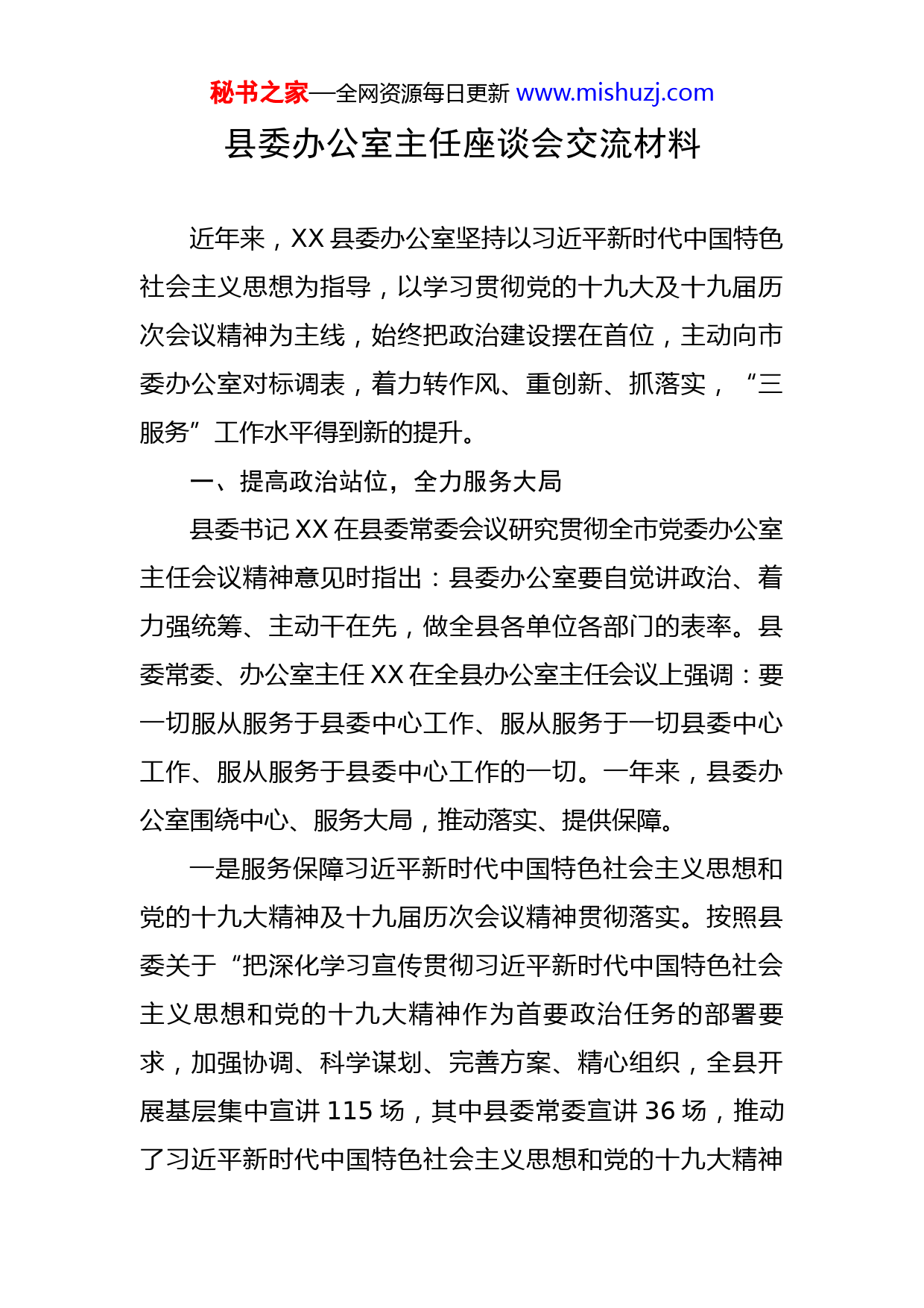 秘书之家—全网资源每日更新www.mishuzj.com县委办公室主任座谈会交流材料近年来,XX县委办公室坚持以习近平新时代中国特色社会主义思想为指导,以学习贯彻党的十九大及十九届历次会议精神为主线,始终把政治建设摆在首位,主动向市委办公室对标调表,着力转作风、重创新、抓落实,“三服务”工作水平得到新的提升。一、提高政治站位,全力服务大局县委书记XX在县委常委会议研究贯彻全市党委办公室主任会议精神意见时指出:县委办公室要自觉讲政治、着力强统筹、主动干在先,做全县各单位各部门的表率。县委常委、办公室主任XX在全县办公室主任会议上强调:要一切服从服务于县委中心工作、服从服务于一切县委中心工作、服从服务于县委中心工作的一切。一年来,县委办公室围绕中心、服务大局,推动落实、提供保障。一是服务保障习近平新时代中国特色社会主义思想和党的十九大精神及十九届历次会议精神贯彻落实。按照县委关于“把深化学习宣传贯彻习近平新时代中国特色社会主义思想和党的十九大精神作为首要政治任务的部署要求,加强协调、科学谋划、完善方案、精心组织,全县开展基层集中宣讲115场,其中县委常委宣讲36场,推动了习近平新时代中国特色社会主义思想和党的十九大精神秘书之家—全网资源每日更新www.mishuzj.com在XX落地生根、形成生动实践。二是服务保障打好污染防治攻坚战。按照县委关于“打响清山、清水、清湖、清城四大战役”工作部署,县委办公室围绕推进“四河同治”工程、截污泵站和新建改建城区污水管网、省级生态县创建、破坏自然资源违法行为、开展国土绿化提速提质行动等重点工作开展督查暗访,全年下发督查通报11期,约谈矿山企业14家,促进了全县生态环境持续改善。三是服务保障全面深化改革。按照县委“以改革的精神推动改革落实”工作要求,制定《县委全面深化改革领导小组2022年工作要点》,梳理出6大类23项具体改革任务,建立工作台帐、完善推进机制,推动中央、省委、市委重大改革举措在我县具体化、实践化。全年共组织召开县委全面深改工作领导小组会议4次。二、创新制度机制,保障运转高效县委书记XX批示要求:办公室工作要突破定式,敢于创新,确保工作更周密、更高效。县委常委、办公室主任李彩民要求:靠制度办事、以机制创新,促进县委机关运转顺畅。一年来,县委办公室围绕机制创新,不断寻求新途径、探索新办法、解决新问题。一是建立县四大班子办公室通联机制和领导干部微信群,促进上下步调一致。由县委常委、办公室主任XX牵头秘书之家—全网资源每日更新www.mishuzj.com负责,建立县四大班子办公室主任联席会议制度和县委各部门协调工作机制,每月一次碰头会,沟通交流情况、统筹安排工作,避免打乱仗。由县委办一名副主任担任总群主,分别建立了由46名县领导、32名乡镇党政主要领导、118名委局长、146名基层办公室主任加入的县级领导、乡镇、县直、办公室系统四个微信群,方便了活动组织、提升了工作效能。二是建立文字联络员制度,促进各乡镇、县直各单位工作衔接有序。按照“作风建设年”要求,在全县办公室系统实行文字工作联络员制度,从各乡镇、县直重点委局筛选出有较高政治素质、文字功底扎实、责任心强的132名文字工作联络员,建立微信专群,定期进行以会代训,加强了上下沟通联系,促进了工作衔接有序,提高了基层以文辅政能力。三是建立县委法律顾问工作制度,促进法律顾问作用发挥和县委依法行政水平提高。由县委办法规科组织,建立县委法律顾问工作微信群,小问题微信说、大问题书面说,提升日常交流沟通频次,促进法律顾问作用发挥。组织法律顾问撰写了《XX依法治县工作情况报告》《XX环境执法工作调研报告》等有指导性的调研文章,法律顾问全年参与典型信访案件化解3起,对提高县委依法行政水平起到了促进作用。秘书之家—全网资源每日更新www.mishuzj.com四是建立县委办公室学习小组制度,促进年轻干部成长进步和素质能力提升。把18名40岁以下的年轻同志分成两个学习小组,分别由综合科科长、政研室副主任任组长。文字主任与两个小组组长定期商议确定题目,学习小组所有人员围绕题目要求起草文稿,两个小组长负责督促。之后,由文字主任召集学习交流会,每人分别宣读文稿,各位副主任和其他成员进行点评,最后评出三篇优秀文稿。围绕“如何做一名合格的党办人”“我要做一名出彩的党办人”,开展了2次集中交流学习。三、坚持常做常新,提高工作水平县委书记XX指出:办公室工作只有做不到的、没有做“过头”的,只有更好、没有最好。县委常委、办公室主任XX强调:县委办全体同志要做坐下能写、站起能讲、蹲下能抓、比武能胜的“四能”干部,胜任新时代“三服务”工作要求。一年来,县委办公室坚持常做常新,不断提高工作水平。一是文字服务谋“精”。站位全局、把握大势,在立意新、角度准、接地气上下功夫,努力提升文稿的思想性、针对性、实效性。全年共完成省委书记、省长莅临XX调研工作汇报,县委全会、县三级干部会等各类文稿310余份次。二是法规工作谋“严”。严格按照党内法规章程,着秘书之家—全网资源每日更新www.mishuzj.com力精简文件,改进文风,不该发的文件坚决不发,维护党内法规的严