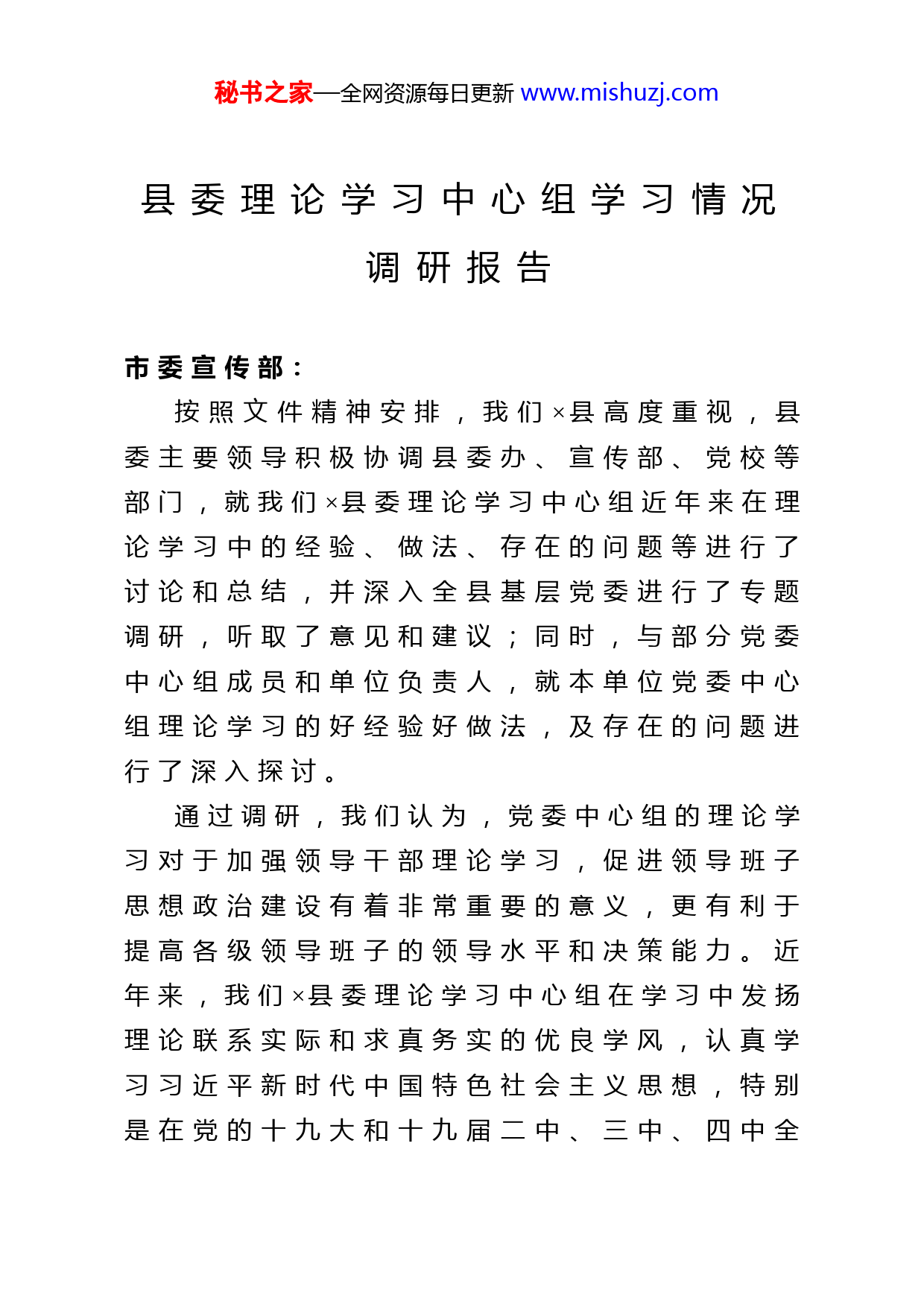秘书之家—全网资源每日更新www.mishuzj.com县委理论学习中心组学习情况调研报告市委宣传部:按照文件精神安排,我们×县高度重视,县委主要领导积极协调县委办、宣传部、党校等部门,就我们×县委理论学习中心组近年来在理论学习中的经验、做法、存在的问题等进行了讨论和总结,并深入全县基层党委进行了专题调研,听取了意见和建议;同时,与部分党委中心组成员和单位负责人,就本单位党委中心组理论学习的好经验好做法,及存在的问题进行了深入探讨。通过调研,我们认为,党委中心组的理论学习对于加强领导干部理论学习,促进领导班子思想政治建设有着非常重要的意义,更有利于提高各级领导班子的领导水平和决策能力。近年来,我们×县委理论学习中心组在学习中发扬理论联系实际和求真务实的优良学风,认真学习习近平新时代中国特色社会主义思想,特别是在党的十九大和十九届二中、三中、四中全秘书之家—全网资源每日更新www.mishuzj.com会精神的学习贯彻中,紧密联系全县经济社会实际,不断创新学习载体,拓宽学习思路,使理论学习的氛围更加浓厚,理论联系实际的学风得到进一步弘扬,取得了一定的成效,为全县广大党员干部的理论学习树立了榜样。一、基本经验及取得的成效(一)坚持示范带动作用,切实把理论学习摆在首要位置加强理论学习是搞好领导干部自身建设的关键,是形势发展对党员领导干部提出的迫切要求。近年来,在加快经济社会发展的过程中,新农村建设、城市建设等方面存在的不少新情况、新问题,摆在了县委县政府的面前。解决县域经济社会发展中存在的问题,实现新的发展目标和任务,迫切要求县委理论学习中心组加强学习,不断提高领导干部的素质和能力。为此,县委理论学习中心组在理论学习中大力开展“2144”工程,即:县委理论学习中心组各成员每年记学习笔记不得少于2万字,每年缺勤次数最多1次,每年撰写心得体会不得少于4篇,每年结合分管工作深入基层搞调查研究不得少于4次。为了确保县委理论学习中心组成员能进秘书之家—全网资源每日更新www.mishuzj.com行专项学习,我们统一为中心组成员印发了学习笔记本,并从2017年×月开始,编印了旨在引导全县领导干部学习的理论刊物《××××》,开设了“领导论坛、时政指南、学习心得、他山之石”等多个栏目,在新的政治形势和新的理论动态中,灵活地编印专刊,及时帮助和指导中心组成员及全县广大党员干部学习和了解我们党的最新声音。《×××》一季一期,至今共编印了×××期,今年已编印×期。严格的要求使县委理论学习中心组全体成员坚持从自身做起,带头学习,推动了党员干部形成注重学习的良好风气。具体体现为“六个带头”:一是带头自学。县委理论学习中心组各成员无论工作多忙,时间多紧,都能带头认真学习,先学一步,努力做到学懂学深学透。二是带头坚持学习制度。县委书记认真履行组长职责,严格审定中心组学习年度计划,每次集中学习都亲自确定专题,安排学习时间,主持学习讨论,并带头作学习发言。三是带头主持和参加专题学习会。近年来,我们除了举办重大政治理论学习的宣讲报告会外,还针对改革发展中的重大理论和实践问题,先后邀请省秘书之家—全网资源每日更新www.mishuzj.com委党校×××教授、省军区×××教授、市委党校×××教授等10多位专家学者举办知识讲座,具体内容有当前形势报告、旅游产业论坛等,每场报告会和讲座都由县委主要领导亲自主持。四是带头作学习辅导。围绕提高党员干部决策水平服务经济社会发展,先后举办了党务干部知识公务员礼仪知识等培训班,并多次邀请专家和县委领导作学习辅导报告。另外,各中心组成员每年都坚持到自己分管的镇区、部门作学习辅导。五是带头写心得体会。一直以来,县委理论学习中心组成员都坚持撰写学习心得体会文章。其中县委书记×××和县委理论学习中心组其他成员所撰写的理论文章近百篇分别被《人民日报》《×日报》《当代×》等报刊杂志发表。六是带头调查研究。坚持经常带着问题走出去沉下去调查研究,听取群众的意见和建议。在深入贯彻落实科学发展观的活动中,将所有县级领导分成×个组,围绕党的建设、农业产业化、工业化、民生事业、财政保障、文化旅游等×个课题,深入到全县×个镇区×个村,走访近万名干部群众,形成了一系列符合实际、具有针对性的调研报告。在“不忘初心、牢记使命”主秘书之家—全网资源每日更新www.mishuzj.com题教育中,我们又集中开展了“民情大调查民生大走访”活动,县委理论学习中心组成员带领千名干部下基层,深入调查研究,广泛听取和收集各方面意见和建议,掌握大量第一手材料,形成了×多篇调研文章。(二)加强和健全制度建设,不断促进理论学习规范化一是坚持集中学习制度。县委理论学习中心组原则上每月安排一次集中学习,自2017年以来,共开展×次集中学习讨论,先后学习了十九大和十九届二中、三中、四中全会精神、“十三五”规划和省市主要领导分别在×和×考察时的重要讲话精神等重要内容。由于主要领导高度重视,亲自部署,带头做重点发言,中心组成员出勤率高,发言准备充分,有理论深度,联系实际密切,集中学习效果良好,有效地提高了大家的决策执政能力。二是坚持学习指导制度。在抓好自身学习的同