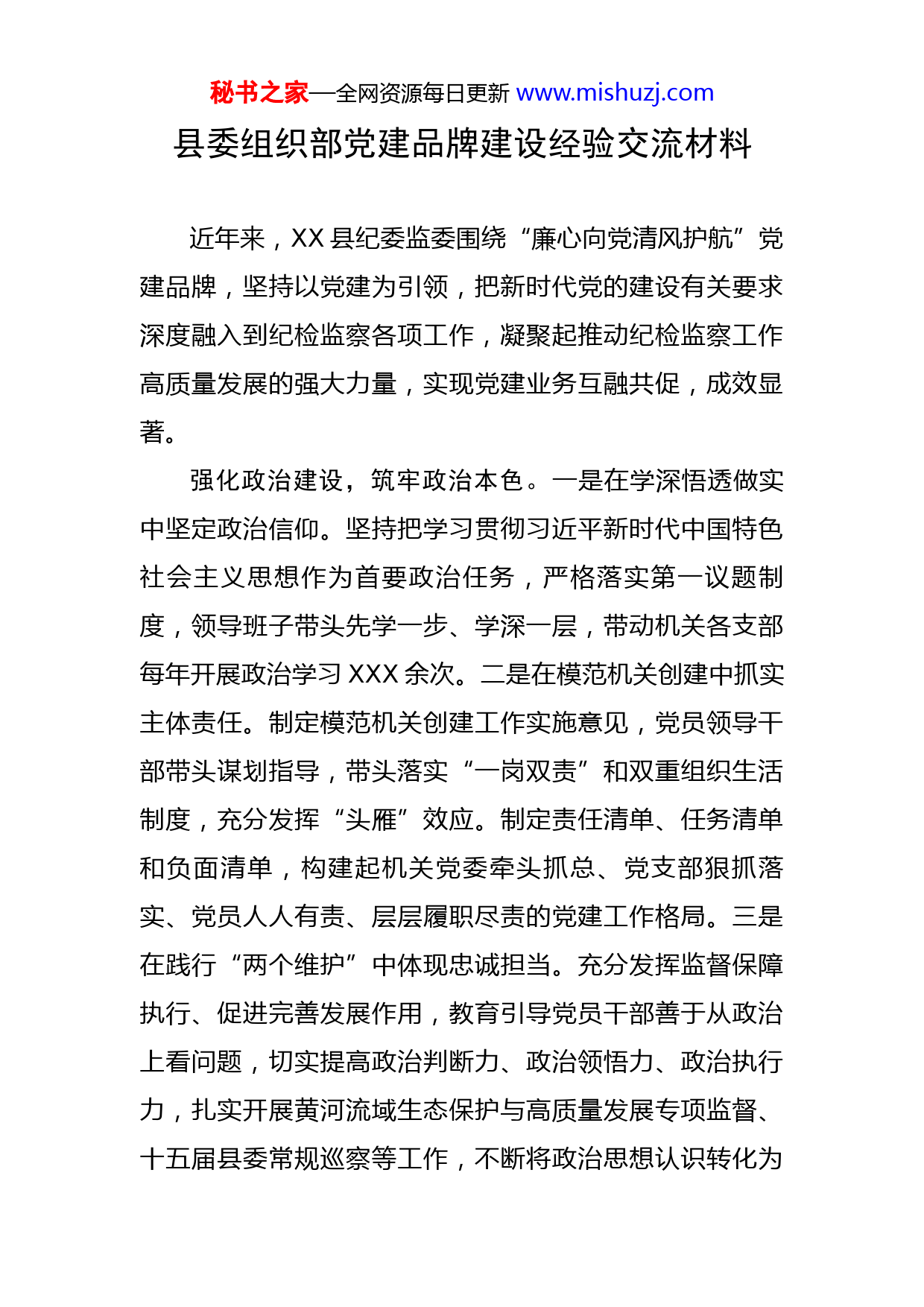 秘书之家—全网资源每日更新www.mishuzj.com县委组织部党建品牌建设经验交流材料近年来,XX县纪委监委围绕“廉心向党清风护航”党建品牌,坚持以党建为引领,把新时代党的建设有关要求深度融入到纪检监察各项工作,凝聚起推动纪检监察工作高质量发展的强大力量,实现党建业务互融共促,成效显著。强化政治建设,筑牢政治本色。一是在学深悟透做实中坚定政治信仰。坚持把学习贯彻习近平新时代中国特色社会主义思想作为首要政治任务,严格落实第一议题制度,领导班子带头先学一步、学深一层,带动机关各支部每年开展政治学习XXX余次。二是在模范机关创建中抓实主体责任。制定模范机关创建工作实施意见,党员领导干部带头谋划指导,带头落实“一岗双责”和双重组织生活制度,充分发挥“头雁”效应。制定责任清单、任务清单和负面清单,构建起机关党委牵头抓总、党支部狠抓落实、党员人人有责、层层履职尽责的党建工作格局。三是在践行“两个维护”中体现忠诚担当。充分发挥监督保障执行、促进完善发展作用,教育引导党员干部善于从政治上看问题,切实提高政治判断力、政治领悟力、政治执行力,扎实开展黄河流域生态保护与高质量发展专项监督、十五届县委常规巡察等工作,不断将政治思想认识转化为秘书之家—全网资源每日更新www.mishuzj.com落实工作任务的行动自觉。强化思想建设,抓实学习教育。一是推动思想教育入脑入心。扎实开展“X党员先锋”行动、“我来讲党课”、“季度读好书·建书香机关”等活动,充分利用“学习强国”“灯塔—党建在线”“XX清风”等平台,引导党员干部在学习宣传贯彻习近平新时代中国特色社会主义思想上下功夫,累计讲党课XX余场,撰写心得体会XXX余篇。《我是纪检监察人》微党课,在全市纪检监察机关“喜迎二十大奋进新征程”演讲比赛中受到党员干部一致好评,荣获第二名。二是推动专题学习教育走深走实。按照“学理论、悟思想、见行动、创一流”活动要求,各党支部依托“三会一课”、主题党日等组织开展“讲故事学理论”“思想解放大讨论”等特色活动,推动党员学习教育往深里走往实里走。三是推动业务学习见行见效。以“两堂一班一赛”为载体,加强党员干部政策策略、纪法规定、专业知识培训,举办全县纪检监察系统庆祝建党XXX周年暨“喜迎二十大奋进新征程”知识竞赛,打造“学思践悟”培训品牌。强化组织建设,夯实组织基础。一是创新开展“提标准、打擂台、创品牌”活动,提升组织力。细化制定组织建设、党员教育、阵地建设、档案资料等X个方面的标准化要求,将亮点工作、业务成效作为加分项,机关党委实秘书之家—全网资源每日更新www.mishuzj.com行季度督导、半年晾晒、年度总结,督促各党支部对标学习,加强过硬支部建设。二是支部建在“点”上,提升战斗力。坚持工作开展到哪里,党组织就覆盖到哪里,留置案件审查调查组、交叉巡察的县委巡察组规范成立临时党支部。在深化派驻机构改革中,以派驻党支部人员组成架构为基础,组建成立派驻办,支部成员、派驻办工作人员交叉任职,推动党建与业务深度融合,为监督执纪、审查调查提供了有力保障。三是厚植机关文化,增强向心力。精心打造“廉心向党·清风护航”党建品牌,以品牌凝聚人心、汇聚力量。建立关怀帮扶党员长效机制,实行谈心谈话、家访制度,对长期外出办案的党员干部,以党支部为单位开展“家访慰问暖人心、凝心聚力创佳绩”活动,帮助解决实际困难。注重加强党建对工会、妇联等群团组织的领导,组织开展廉洁家风专题宣讲、中华经典诵读、学雷锋志愿服务以及剪纸、书法、摄影展等活动,为党员干部营造健康舒心的工作环境。加强与第一书记帮扶村、联系社区的共驻共建,组织开展廉洁主题簸箕画手绘、亲子团扇等主题活动XX场次,让党员干部深入一线服务基层、服务群众。强化作风建设,打造铁军队伍。一是开展“提境界、勇担当、促跨越”作风建设活动。制定《县纪委监委提境界、勇担当、促跨越”作风建设活动实施方案》,全体党秘书之家—全网资源每日更新www.mishuzj.com员干部对照“九纠九树”、“四查”等内容,剖析查摆问题XXX条,制定整改措施XXXX条,切实加强自身理论学习,不断提升思想境界。引导党员干部在“深度参与XXXXX热线办理提效监督”“加强作风建设最后一公里”等七项专题行动中勇于担当,争创佳绩。围绕争创“廉心向党清风护航”党建品牌、同级监督XX试点品牌、“XX清风”廉洁文化品牌明确对标赶超目标,实现跨越提升。二是严密日常管理监督,防止“灯下黑”。深入开展廉政风险隐患排查,瞄准岗位职责、业务流程等方面,查找梳理廉政风险点,制定防控措施;完善制定《纪检监察干部涉案违规事项报备规定》《纪检监察干部个人有关事项报告制度》等制度,健全内控机制;坚持刀刃向内,以零容忍的态度严肃查处纪检监察干部违纪违法问题,牢固树立“监督别人的人首先要监管好自己,执纪者要做遵守纪律的标杆”的意识。三是严格督查考核,拧紧“责任链”。坚持目标导向、问题导向和考核导向,完善制定机关部室、乡镇街区考核办法,将全年重点工作任务细化分解,下发年度任务清单,并根据上级纪委监委和县委工作重点,按时派发阶段性任务清单,强化