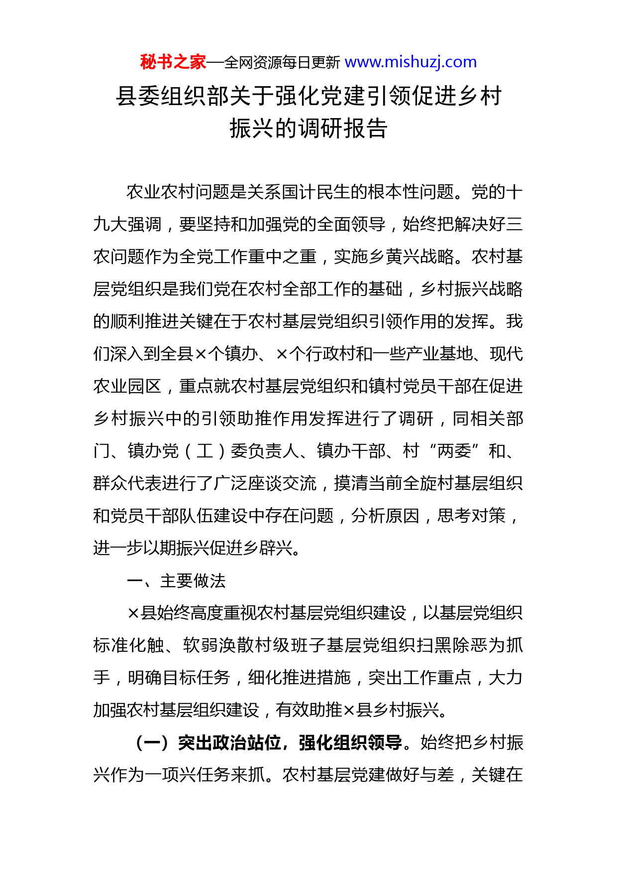 秘书之家—全网资源每日更新www.mishuzj.com县委组织部关于强化党建引领促进乡村振兴的调研报告农业农村问题是关系国计民生的根本性问题。党的十九大强调,要坚持和加强党的全面领导,始终把解决好三农问题作为全党工作重中之重,实施乡黄兴战略。农村基层党组织是我们党在农村全部工作的基础,乡村振兴战略的顺利推进关键在于农村基层党组织引领作用的发挥。我们深入到全县×个镇办、×个行政村和一些产业基地、现代农业园区,重点就农村基层党组织和镇村党员干部在促进乡村振兴中的引领助推作用发挥进行了调研,同相关部门、镇办党(工)委负责人、镇办干部、村“两委”和、群众代表进行了广泛座谈交流,摸清当前全旋村基层组织和党员干部队伍建设中存在问题,分析原因,思考对策,进一步以期振兴促逬乡辟兴。一、主要做法×县始终高度重视农村基层党组织建设,以基层党组织标准化触、软弱涣散村级班子基层党组织扫黑除恶为抓手,明确目标任务,细化推进措施,突出工作重点,大力加强农村基层组织建设,有效助推×县乡村振兴。(一)突出政治站位,强化组织领导。始终把乡村振兴作为一项兴任务来抓。农村基层党建做好与差,关键在秘书之家—全网资源每日更新www.mishuzj.com镇办党委,核心是引导镇办党委把主体责任扛起来、“最大政绩”树起来。一是制定书记抓基层党建工作神书。县委书记和镇办党委书记把年度工作重点和需要整改的突出问题,以承诺书的形式公示出来,自觉接受党员群众监督,作为年度考核的主要依据。二是抓牢镇办组织委员。每月坚持召开基层党建重点工作调度会,组织委员汇报本月工作完成情况,对完成不认真、不及时的,当场提出批评,督促组织委员用全部精力专职抓党建。三是加大暗访督查力度。县委组织部成立×个督查组,对农村基层党建情况,进行常态化、不定期暗访督查,对发现的问题及时通报全县,并要求对照整改要求,立改立行。(二)突出核心支撑,加强支部建设。抓好农村党支部建设是实现乡村振兴的重要支点。一个支部就是一个战斗堡垒,一个党员就是_面旗帜。农村党支部是乡村振兴工作的直接组织者、推动者和实践者。建强农村党支部,是筑牢基层堡垒、提升组织力和农村基层组织建设的重点。要高质量完成乡村振兴的历史使命,就必须抓好农村党支部建设,建强基层党组织,推动全面从严治党向基层延伸,激活农村基层党组织的组织力、凝聚力、战斗力和农村党员的先锋模范带头作用。一是注重党组织设置优化。对农村基层党组织设置中存在的问题进行全面整改,突出整治合并村超大党支部,合理划分党小组,确保每个党组秘书之家—全网资源每日更新www.mishuzj.com织运转顺畅,每名党员管理有效。×县现有×个镇、×个街道办事处、×个行政村。农村党员×人。现任村干部×人,党员村干部×人。设立基层党委×个、党支部×个。二是注重特色品牌创建。探索开展基层党建一镇一亮点、一村一特色品牌创建活动,引导各镇办结合实际,进行差异化品牌创建,以镇办为单位,每个镇办至少打造×个品牌创建项目,各村(社区)在本镇办创建品牌的基础上,根据每个村的实际情况,打造特色亮点。通过强化典型引路、推动示范引领,促进农村基层党建全面过硬、整体提升。三是注重村级班子整建。坚持问题导向,对农村基层党组织建设存在的薄弱环节,每年按村(社区)党组织数不低于×%的比例倒排,确定软弱涣散基层党组织进行集中整顿;扎实开展扶贫领域基层党组织弱化虚化问题专项治理,在全县范围内建立“一镇一册,一村一表”工作台账,集中力量进行攻坚拔寨式的整改。(三)聚焦关键少数,配强支部书记。在科学规划、实施乡村振兴战略的过程中,领导干部作为关键少数重要角色,以强烈的责任心去担当、敢担当。村干部主动担起担子、履行职责,带领群众形成思想统一有凝聚力的战斗群体,心往一处想、劲往一处使,形成乡村振兴的强劲力量。着力选好合适的领导干部人才下基层。着力在农村党组织书记的选育管用上下功夫,建设一支有思想、懂农秘书之家—全网资源每日更新www.mishuzj.com业、带富能力强的农村带头人队伍。一是精准选配。实施头雁工程,以村(社区)两委换届为契机,加大在致富带头人、退伍军人、大学生村官、回乡创业能人中进行选拔的力度,注重把书记培养成能人,把能人培养成书记。大力实施蹲苗育苗工程,全县村(社区)择优储备培育后备干部×名。二是精心培养。根据农村工作的特点,组建以优秀支部书记、专家学者等为主要师资队伍,精心设计党性教育、“三农”政策、社会治理、基层党建等方面课程,进行精准培训,每年对村党组织书记至少轮训一遍。选派×名农业科技人才下乡培训指导,把农业课堂搬到田间地头。三是精细管理。制定出台×县村党组织书记管理办法,重点围绕班子建设、队伍建设、制度落实、工作业绩、群众评价等指标进行评定,强化结果运用。把村干部绩效工资和脱贫攻坚等工作实绩挂钩,酸村干部工作热情动力。结合扫黑除恶专项斗争,采取过筛子式排查村干部涉黑涉恶线索×条,共侦破涉恶九类案件×起,抓获涉黑涉恶犯罪人员××人。做到坚决把村霸、涉黑涉恶等问题人员挡在门外。(四)注重作用发挥,联系服务群众。农村各项工作和事业的发展,只有落