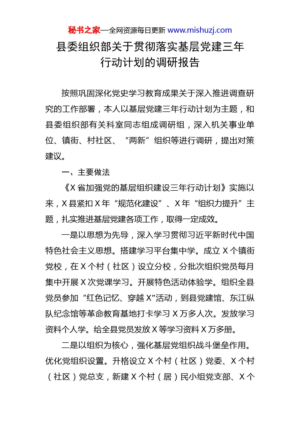 秘书之家—全网资源每日更新www.mishuzj.com县委组织部关于贯彻落实基层党建三年行动计划的调研报告按照巩固深化党史学习教育成果关于深入推进调查研究的工作部署,本人以基层党建三年行动计划为主题,和县委组织部有关科室同志组成调研组,深入机关事业单位、镇街、村社区、“两新”组织等进行调研,提出对策建议。一、主要做法《X省加强党的基层组织建设三年行动计划》实施以来,X县紧扣X年“规范化建设”、X年“组织力提升”主题,扎实推进基层党建各项工作,取得一定成效。一是以思想为先导,深入学习贯彻习近平新时代中国特色社会主义思想。搭建学习平台集中学。成立X个镇街党校,在X个村(社区)设立分校,分批次组织党员每月集中开展X次党课学习。开展特色活动体验学。组织全县党员参加“红色记忆、穿越X”活动,到县党建馆、东江纵队纪念馆等革命教育基地打卡学习X万多人次。发放学习资料个人学。给全县党员发放X等学习资料X万多册。二是以组织为核心,强化基层党组织战斗堡垒作用。优化党组织设置。升格设立X个村(社区)党委、X个村(社区)党总支,新建X个村(居)民小组党支部、X个秘书之家—全网资源每日更新www.mishuzj.com“两新”组织党支部,结合机构改革撤销X个并新设X个机关事业单位党组,优化调整X个机关事业单位和X个国有企业党组织隶属关系,设立县委教工委统筹全县教育行业党建工作。强化党组织领导。出台《关于深化“强村固组”工程充分发挥村组党组织领导核心作用的实施意见》《农村党组织、村民委员会、村民小组、村集体经济组织、村务监督委员会小微权力清单》,探索实施《农村重大事项“X+X”全程纪实工作法》,以制度形式强化村党组织领导核心地位。转化软弱涣散基层党组织。持续整顿“六对接六查找”确定的X个软弱涣散基层党组织,主题教育期间集中排查整顿X个软弱涣散基层党组织。三是以干部为关键,全面加强基层组工干部队伍建设。配强党务领导干部。为X个乡镇(街道)、X个县直机关党委配强专职抓党建的副书记,提拔X名优秀乡镇年轻干部担任乡镇组织委员。提高村(社区)党组织书记待遇。面向全县村(社区)党组织书记招聘X名事业编制人员,从X年起设立村(社区)党组织书记年度绩效奖励金。补选村(社区)党组织委员、储备干部。利用省市核定村干部财政补贴职数补选X名村(社区)党组织委员、X名村(社区)“两委”储备干部,实现X%的村(社区)党组织委员不少于村(居)委会委员。四是以经费为保障,加大基层党建工作的资金支持力秘书之家—全网资源每日更新www.mishuzj.com度。加大县管党费支持力度。拨付X万元建设党群服务中心、修缮党小组活动场所和党员活动室等。加大县级财政支持力度。每村每年安排X万元党组织服务群众专项经费,给X多名X岁以上老党员每月发放X元关怀补贴。提高工作补贴标准。将村(居)民小组长工作补贴提高至每月X元,进一步提高“两新”组织专兼职党组织书记、党建指导员补贴标准。五是以城市基层党建为重点,积极探索城市基层党建示范县建设。探索实施“红色领航”工程,推动试点工作取得突破性开局。构建“红色纽带”。建立县、街道、社区三级联动体系和“党工+社工+义工”联动体系,实行党组织和党员到社区“双报到”制度和党建工作联席会议制度。打造“红色引擎”。把党支部建在居民小区,在商贸城、产业园建立区域性园区党组织,在园洲纺织服装行业协会成立行业党组织。建设“红色阵地”。建成X个县级、X个街道级、X个园区、X个社区级和X个新兴领域的党群服务中心,形成党群服务中心矩阵。开展“红色服务”。搭建“党建榕平台”“党建项目认领平台”,统筹辖区各领域党组织服务资源和群众需求,实现“群众点菜,党来买单”。二、存在问题从调研情况来看,还存在一些问题。一是“三会一秘书之家—全网资源每日更新www.mishuzj.com课”组织生活质量参差不齐。一些基层党组织开展“三会一课”不严不实,形式内容单一,没有按照规定时间和次数开展,台账管理不够规范完善。二是村(居)民小组党支部建设比较薄弱。一些村(居)民小组党支部运作不够顺畅有序,规范化建设水平较低,支委会建设、发展党员工作、办公场所建设等有待加强。三是社区基础保障跟不上城市化步伐。社区基础保障较为薄弱,服务超负荷,办公用房不达标,与管理需求不能完全匹配。三、对策建议对发现的主要问题,瞄准“病灶”,因情施策,下苦功夫、实功夫、细功夫予以解决。一是在党员教育管理上再抓实。推动全县党员守初心、担使命、找差距、抓落实。开展“六个一”主题活动。组织各级党委举办一次主题征文、演讲比赛和知识竞赛,编印一本主题教育应知应会“口袋书”,党员领导干部讲一堂专题党课,基层党组织举办一场读书交流会,开展一次主题组织生活会,重温一次入党誓词。推行党员分类管理、星级评定管理模式。制定全县实施指导意见,提高在职党员、离退休老党员、流动党员、困难党员教育管理的针对性、实效性。开发“智慧党务”管理平台。开发符合X县实际,包含“三会一课”、主题党日和统计分析等功能的“智慧党务”管理平台,利用大数据抓实党建基秘书之家—全网资源每日更新www.mishuzj.com础工作。实行领导干部“一岗双责”