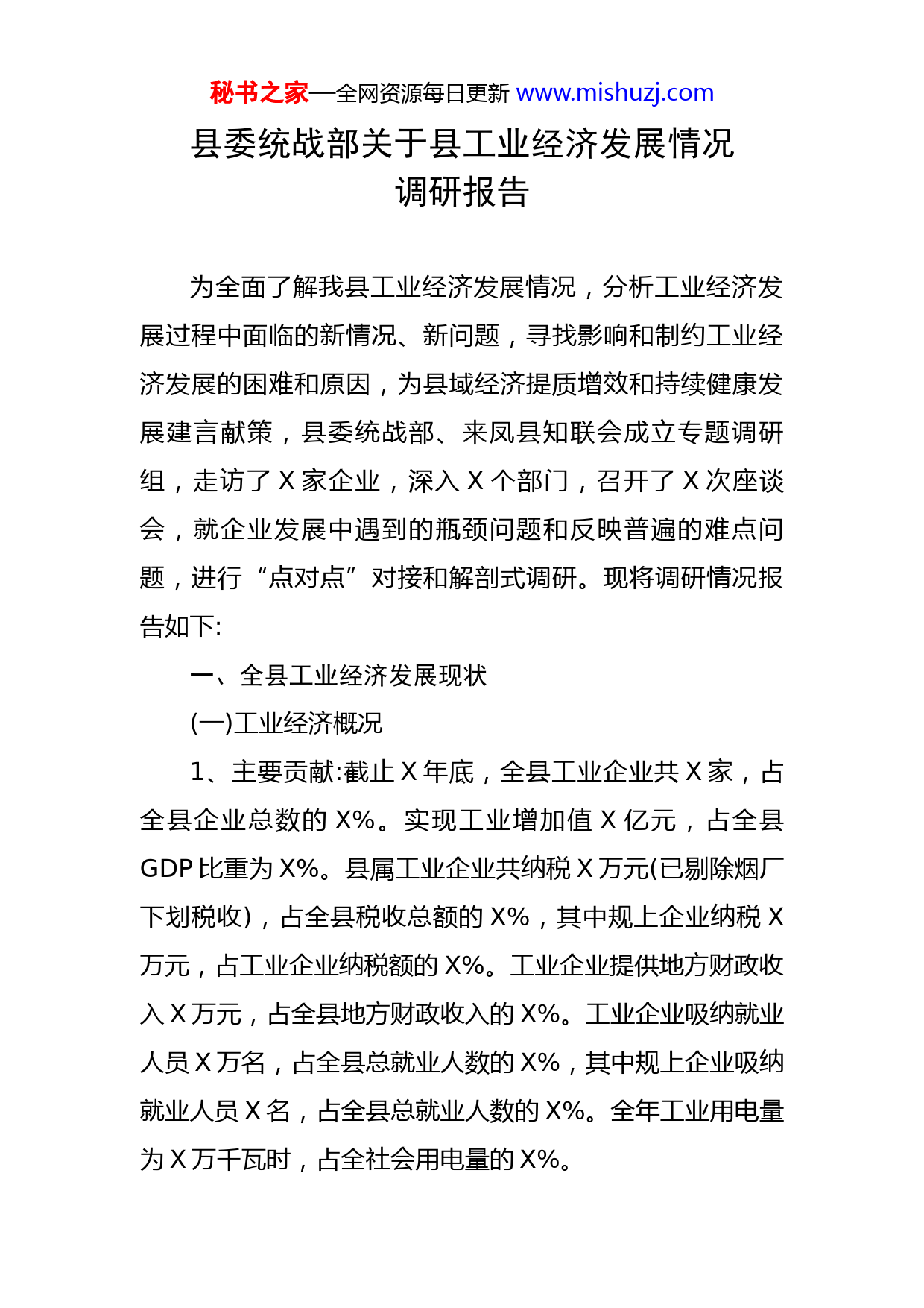 秘书之家—全网资源每日更新www.mishuzj.com县委统战部关于县工业经济发展情况调研报告为全面了解我县工业经济发展情况,分析工业经济发展过程中面临的新情况、新问题,寻找影响和制约工业经济发展的困难和原因,为县域经济提质增效和持续健康发展建言献策,县委统战部、来凤县知联会成立专题调研组,走访了X家企业,深入X个部门,召开了X次座谈会,就企业发展中遇到的瓶颈问题和反映普遍的难点问题,进行“点对点”对接和解剖式调研。现将调研情况报告如下:一、全县工业经济发展现状(一)工业经济概况1、主要贡献:截止X年底,全县工业企业共X家,占全县企业总数的X%。实现工业增加值X亿元,占全县GDP比重为X%。县属工业企业共纳税X万元(已剔除烟厂下划税收),占全县税收总额的X%,其中规上企业纳税X万元,占工业企业纳税额的X%。工业企业提供地方财政收入X万元,占全县地方财政收入的X%。工业企业吸纳就业人员X万名,占全县总就业人数的X%,其中规上企业吸纳就业人员X名,占全县总就业人数的X%。全年工业用电量为X万千瓦时,占全社会用电量的X%。秘书之家—全网资源每日更新www.mishuzj.com2、行业及产品情况:X年工业行业增加值“三升三降”电机设备制造业增加值同比增长X%,家具制造业增加值同比增长X%,电力、热力、燃气生产供应业增加值同比增长X%.非金属矿物制品业增加值同比下降X%,主要原因是矿产资源枯竭及环保政策限制。化学原料和化学制品制造业增加值同比下降X%,主要原因是宏观经济增长放缓、需求下降。电线、电缆、光缆及电工器材制造业增加值同比下降X%,主要原因是市场需求量减少。主要产品产量“四增二减”。水泥产量同比增长X%,钢化玻璃产量同比增长X%,石灰石产量同比增长X%,人造板产量同比增长X%。硅酸盐水泥熟料产量同比下降X%,碳化钙产量同比下降X%。3、项目与投资情况:X年全年计划开工工业项目X个,占全年计划项目(X个)总数的X%,年计划投资X亿元。截至年底,已开工项目X个,占项目数的X%,完成投资X亿元;未开工X个,其中完成招商X个,存在用地问题X个,办理手续推进缓慢X个。X年完成工业投资X亿元,同比减少X%,其中:完成采矿业投资X万元,同比减少X%;完成制造业投资X亿元,同比减少X%;完成电力、燃气及水的供应投资X亿元,同比减少X%;完成工业技改投资X亿元,同比减少X%。民问资本完成投资X亿元,同比减少X%。秘书之家—全网资源每日更新www.mishuzj.com(二)规上企业概况1、行业分布:X年底全县规模以上工业企业X家,其中食品加工企业X家,家居建材X家,清洁能源X家,电子信息X家,民族工艺品X家,其他X家,其中五大支柱产业企业占比X%。2、区域分布:规上企业主要分布在桂花树工业园区X家,四合工业园区X家,翔凤镇辖区X家,其他乡镇X家。3、运行情况:X年规上企业处于正常生产的X家,停产的X家,半停产的X家,正常运行率为X%。X家规上企业中有X家X年退出规模工业企业序列。所调研的X个行业(产品)中,有X个行业(产品)效益良好,其它X个行业(产品)效益出现下滑或亏损。4、产值情况:X年规上企业工业总产值X亿元,工业销售产值X亿元,工业产品销售率X%。产值过亿的企业X家、过X万的X家、不足X万的X家(这X家已确定X年退出规上企业库),且X年我县无一家新增规上企业。5、纳税情况:税收过千万的只有金凤建材工业有限公司X家,过X万的X家,过百万的X家,过X万的X家,税收大户主要集中在能源、建材产业企业约占工业税收的X%以上,有X家规上企业X年纳税几乎为零。6、企业获标认证情况:截止目前,全县获得地理标志秘书之家—全网资源每日更新www.mishuzj.com商标X件、湖北名牌产品X个、获得“绿色食品”标志X件、“无公害产品”X个。“有机食品”X个,“三品一标”认证在全州排名靠后。恒茂茶油、腾升香料X家公司获批国家高新技术企业。(三)要素配置情况1、融资情况:截止X年底,全县共有X家国有投资公司、X家担保公司、X家参股融资担保公司,多家民间小额贷款和担保机构。全县存款余额为X亿元,贷款余额为X亿元,其中规模以上工业企业贷款余额X亿元,占贷款总额的X%。2、财政资金使用情况:X年县域调度资金共X亿元,通过县财政国库借给X家县属企业。截止X年底,按规定全部如期归还到位的企业只X家,占借贷企业总数的X%,金额为X万元,占总额的X%;归还了部分借款的企业X家,金额为X万元。总还款为X万元,还款比为X%。X年按照《来凤县域经济调度资金使用实施办法》,对X亿元县域调度资金使用进行改革,采取委托银行借贷方式,先后给X家企业进行资金借贷,金额为X万元,占总金额的X%。X家企业中规上工业企业X家,借贷资金合计X万元,占放贷资金的X%。重大产业发展基金额度为X亿元,除安排X万元用于过桥资金外,余下X万元用于支持X家企业,但至今无一家企业还款。省财政厅中小实体经济发展资金X秘书之家—全网资源每日更新www.mishuzj.com万元拨付到国有控股中小企业贷款担保公司增加股本。3、土地资源利用情况:我县历年来共报批工业用地总量为X亩,目前已供应工业用地X亩,未供应面积为X亩,未供地主要集中在经济开发区管理区域。4、不动产证办理情况:截止X年底,全县共有X家工业企业涉及到办证,其中有X家没有申请办证,已办理不动产证的X家,办理土地使用证X家,在办理土地使用证的工业企业中,因无房屋规划建设许可证、环评许可等而不能办理不动