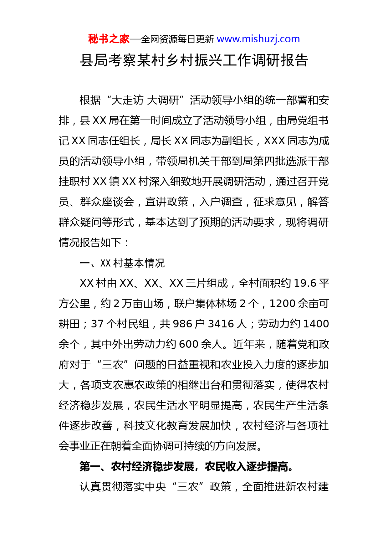 秘书之家—全网资源每日更新www.mishuzj.com县局考察某村乡村振兴工作调研报告根据“大走访大调研”活动领导小组的统一部署和安排,县XX局在第一时间成立了活动领导小组,由局党组书记XX同志任组长,局长XX同志为副组长,XXX同志为成员的活动领导小组,带领局机关干部到局第四批选派干部挂职村XX镇XX村深入细致地开展调研活动,通过召开党员、群众座谈会,宣讲政策,入户调查,征求意见,解答群众疑问等形式,基本达到了预期的活动要求,现将调研情况报告如下:一、XX村基本情况XX村由XX、XX、XX三片组成,全村面积约19.6平方公里,约2万亩山场,联户集体林场2个,1200余亩可耕田;37个村民组,共986户3416人;劳动力约1400余个,其中外出劳动力约600余人。近年来,随着党和政府对于“三农”问题的日益重视和农业投入力度的逐步加大,各项支农惠农政策的相继出台和贯彻落实,使得农村经济稳步发展,农民生活水平明显提高,农民生产生活条件逐步改善,科技文化教育发展加快,农村经济与各项社会事业正在朝着全面协调可持续的方向发展。第一、农村经济稳步发展,农民收入逐步提高。认真贯彻落实中央“三农”政策,全面推进新农村建秘书之家—全网资源每日更新www.mishuzj.com设。目前,全村有95%的人参加了新型农村合作医疗,各项惠农补贴划入各户“一卡-通”中,农民的生活得到了逐年提高,家庭收入逐年递增,家庭财产不断增长,推动乡村发展的物质基础得到不断的加强和巩固。全村现有私家小轿车26辆,有线电话600多部,户户都安装了有线电视,有20%的家庭购置了电脑。尤其是随着惠农政策的不断深入,使农民群众得到了实实在在的好处,生活水平逐年提高,有一半的农户建起了楼房,很多盖新房投入的资金都超过15万以上,处处呈现出生活富裕、生产发展的繁荣局面。第二、基础设施逐步改善,生活环境不断优化。积极争取国家政策支持,充分发挥村民自治作用,组织实施了精整水田、道路通达工程、退耕还林、农网改造、人畜饮水改造、卫生室建设等一批基础设施项目建设,农村基础条件进一步改善。全村37个村民组实现了道路畅通;农村电网逐步改造,供电质量有所提高。科教文卫等各项社会事业发展迅速,建立了突发公共卫生事件应急机制、医疗救治和疾病预防控制机制。有线电视和电话、移动通讯覆盖全村,宽带网络逐步延伸,扩大了农户接受外界信息的能力和渠道。第三、科技教育加快发展,农民素质不断提高。随着教育体制改革和教育投入渠道的变化,基础教育秘书之家—全网资源每日更新www.mishuzj.com投入得到了有效保障,中小学教育、农业信息网络、远程电化教育设施建设发展较快。不断加大对农民科技培训力度,组织实施了农民工培训、扶贫培训等科教工程,培养一大批农村科技能人,农用新科技在农村得到了有效推广。第四、民主法制不断健全,基层组织进一步加强。在国家加强民主法制建设的大环境下,广大干部群众法律意识、法制观念普遍增强,以宪法为核心,农业法、村民委员会组织法为重点的与农民生产生活密切相关的法律法规广泛普及,依法治村、民主管村的工作格局逐步形成。近五年未发生群体性事件、重大治安刑事案件和重大安全事故。一批懂科技、会经营、善管理、讲奉献、有知识的农村能人、致富能手被选为村民小组长和村民代表。按照民-主选举、民主决策、民主管理、民主监督全面建立了民-主管村的工作机制。综上所述,可见XX村新农村建设取得了可喜成绩,与过去相比有了很大变化,但是距新农村“二十字”方针的要求还存在一定的差距,制约农村经济繁荣、社会稳定发展的因素依然存在,新农村建设任重道远。二、主要困难和突出问题调研发现,当前整个XX村还存在的制约经济发展、基础建设等方面的一些不利因素,有的是一直以来长期存在的难点问题,有的是近年来出现的新情况、新问题。主要秘书之家—全网资源每日更新www.mishuzj.com表现以下四个方面:第一、村民委员会选举难。XX村是由原XX村和XX村合并而成,由于历史原因,合村后积累了不少的社会矛盾,合村后村民尚未真正合心,而从地理位置上,全村又分成了XX、XX和XX三片,在村委选举中,地区思想严重,往往各自为政,没有全局观念,导致村委会主任连续多届未能选出。第二、农村投入严重不足。随着农村集资搞建设政策的进一步规范和得失利益的驱使,村民“一事一议”举步为艰。加之前些年村公益事业负债未消化,村集体经济无力加大投入。现阶段涉农所需的道路、水利、土质改造等基础投入,主要靠争取国家支农项目,而这些项目在实施的区域和资金分配上又十分有限,造成农村的多数区域是没有投入的。调查显示,由于受农村基础设施投入不足瓶颈制约,部分农田水利建设和道路改造无法进行,导致农业抗风险能力薄弱。特别是近几年来旱涝灾害不断,农民增产增收遭受严重影响。第三、农村劳动力素质偏低。当前,绝大多数农民的素质不容乐观。突出表现在:农民思想还比较保守,传统的小农意识根深蒂固,生产、生活和行为方式都与现代社会生活的要求差距较大。在思想素质方面,普遍存在“小富即安”心理,缺乏干大事创大业的开拓进取精神。在文秘书之家—全网资源每日更新www.mishuzj.com化素质方面,村民受教育程度偏低,受市场经济影响,出现了读书无用论,