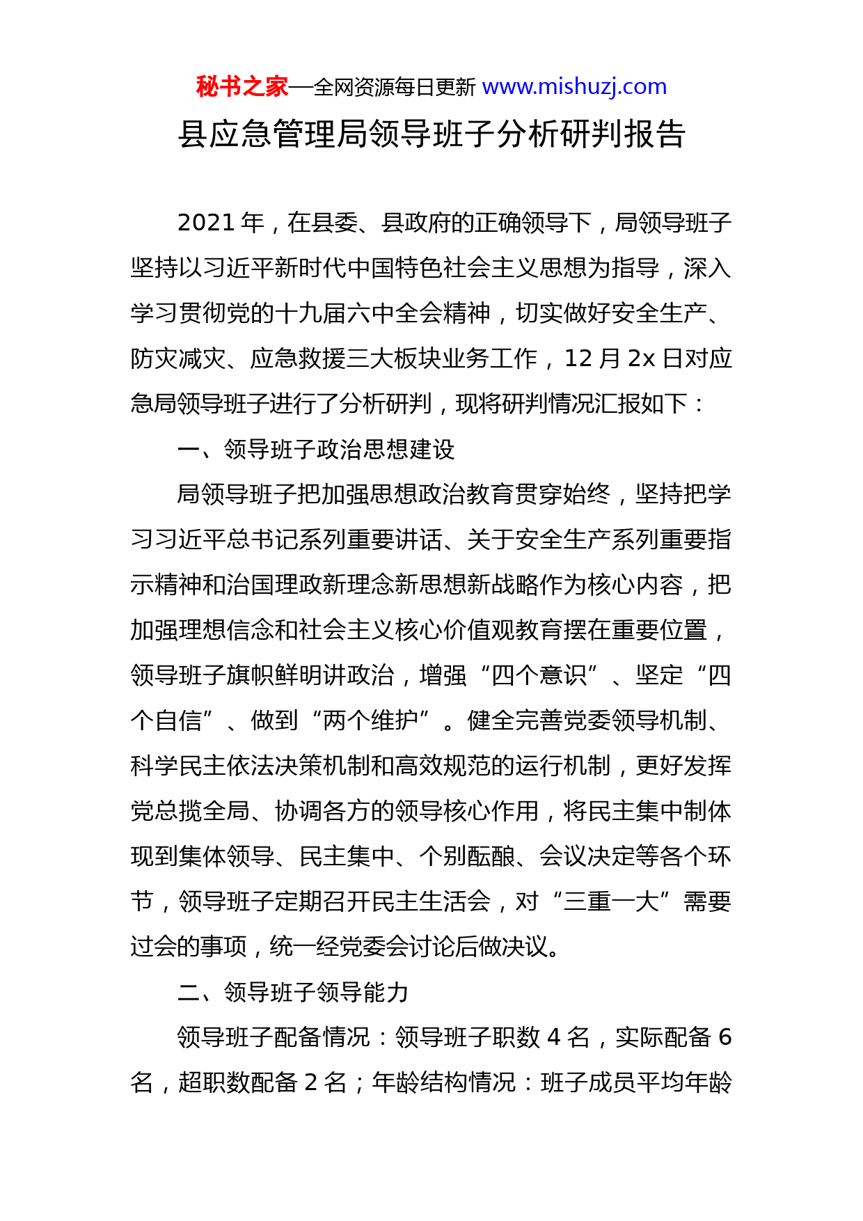 秘书之家—全网资源每日更新www.mishuzj.com县应急管理局领导班子分析研判报告2021年,在县委、县政府的正确领导下,局领导班子坚持以习近平新时代中国特色社会主义思想为指导,深入学习贯彻党的十九届六中全会精神,切实做好安全生产、防灾减灾、应急救援三大板块业务工作,12月2x日对应急局领导班子进行了分析研判,现将研判情况汇报如下:一、领导班子政治思想建设局领导班子把加强思想政治教育贯穿始终,坚持把学习习近平总书记系列重要讲话、关于安全生产系列重要指示精神和治国理政新理念新思想新战略作为核心内容,把加强理想信念和社会主义核心价值观教育摆在重要位置,领导班子旗帜鲜明讲政治,增强“四个意识”、坚定“四个自信”、做到“两个维护”。健全完善党委领导机制、科学民主依法决策机制和高效规范的运行机制,更好发挥党总揽全局、协调各方的领导核心作用,将民主集中制体现到集体领导、民主集中、个别酝酿、会议决定等各个环节,领导班子定期召开民主生活会,对“三重一大”需要过会的事项,统一经党委会讨论后做决议。二、领导班子领导能力领导班子配备情况:领导班子职数4名,实际配备6名,超职数配备2名;年龄结构情况:班子成员平均年龄秘书之家—全网资源每日更新www.mishuzj.com47.5岁,最大的53岁(xxx),最小的35岁(xxx),其中,35岁1名,占17%;46-50岁3名,占50%;51-55岁2名,占33%;学历、专业结构情况:班子成员中,研究生学历1名,占17%;大学学历4名,占66%;大专学历1名,占17%;任职和工作经历情况:班子成员中,担任过乡镇党政正职2人(xxx、xxx),均具有3年及以上县镇工作经历。三、领导班子运行情况一是科学分工,责任明晰,落实了集体领导与个人分工相结合的制度。及时明确每成员的分工,坚持分工负责制,按照“不交叉、不重叠、全覆盖”的原则,职责更明确。二是扩大民主,科学决策。建立健全了党政领导班子联席会议,始终坚持集体领导、民主集中、个别酝酿,对班子成员“三放”,即放心、放手、放权,班子成员对负责或分管的工作更加凸显出驾驭全局、把握方向、推进实施、检查指导的主角职能。三是强化督办,提高效率。进一步巩固机关效能建设成果,加强制度建设,加强督查督办,工作运行节奏明显加快。领导班子运行具体分工如下:局长xxx主持县应急管理局全面工作。副局长xxx负责安全生产执法监督、法治建设、普法、诚信建设、扫黑除恶专项斗争、事故现场处置、调查秘书之家—全网资源每日更新www.mishuzj.com评估和统计、风险监测和综合减灾方面工作,具体分管安全生产执法股、事故调查和数据统计股。副局长xxx负责危险化学品安全监管、地震防御、地质灾害、火灾防治管理、消防、禁毒、机关党建、纪检、综合协调、各行业安全生产协调、应急救援和安全生产宣传教育、工会、共青团、妇联方面工作,具体分管灾害防治管理股、危险化学品安全监管股、综合应急服务中心、综合协调股、工会。副局长xxx负责人民防空、汛旱风和冰冻防御、国防武装、统战方面工作,分管人民防空和汛旱风管理股。副局长xxx负责行政审批、政务公开、政策法规和新闻宣传、网信安全、意识形态、创文、卫生、环保、安全生产基础方面工作,具体分管安全生产基础股、行政审批股。党委委员xxx,负责机关办公、财务、后勤、信息技术化、人事、综治维稳、信访、行政复议和行政诉讼、教育培训、应急指挥、扶贫、综合性救援队伍建设、应急救援和预案管理、救灾和物资保障方面工作,具体分管办公室、应急保障股。四、领导班子工作实绩(一)坚持落实管党治党主体责任,推进全面从严治党。一是牢固树立“不抓党建是失职,抓不好党建是不称秘书之家—全网资源每日更新www.mishuzj.com职”的理念,严格履行抓基层党建第一责任人责任,做到重大问题亲自研究、重要工作亲自部署、重要事项亲自督促落实。定期听取党建工作情况汇报,抓班子、带队伍,不断提高执政能力和领导水平。二是高度重视,严格落实党组织“三会一课”制度、主题党日制度等,全年召开党委会议12次、支部委员会12次,开展党员大会8次、主题党日活动15次、讲专题党课6次,确保三会一课制度扎实有效地坚持下去。三是党的十九届六中全会胜利召开以后,充分认识学习宣传贯彻党的十九届六中全会精神的重大意义,并积极落实到行动中,进一步增强了全体党员的政治意识、大局意识、核心意识、看齐意识。四是坚持党建引领,正确处理党建工作和业务工作的关系,以习近平新时代中国特色社会主义思想为指导,以党的政治建设为统领,贯彻新时代党的建设总要求,始终把党建工作列入重要议事日程,做到党建工作和业务工作紧密结合,对党建工作和行政业务工作同部署、同检查、同考核。聚焦党建工作能力提升,继续深化党组织和干部队伍建设,加强领导干部思想教育,深化党史学习教育,切实把党史学习教育成果转化为推动应急管理发展的强大动力和显著成效。进一步加强干部作风建设,提高领导班子和干部队伍的应急管理能力、依法行政能力和公共服务能力。(二)严格落实意识形态责任。局党组认真落实局党秘书之家—全网资源每日更新www.mishuzj.com委意识形态工作责任制,加强组织领导和统筹指导,把意识形态工作同应急管理工作同安排、同部署。成立了