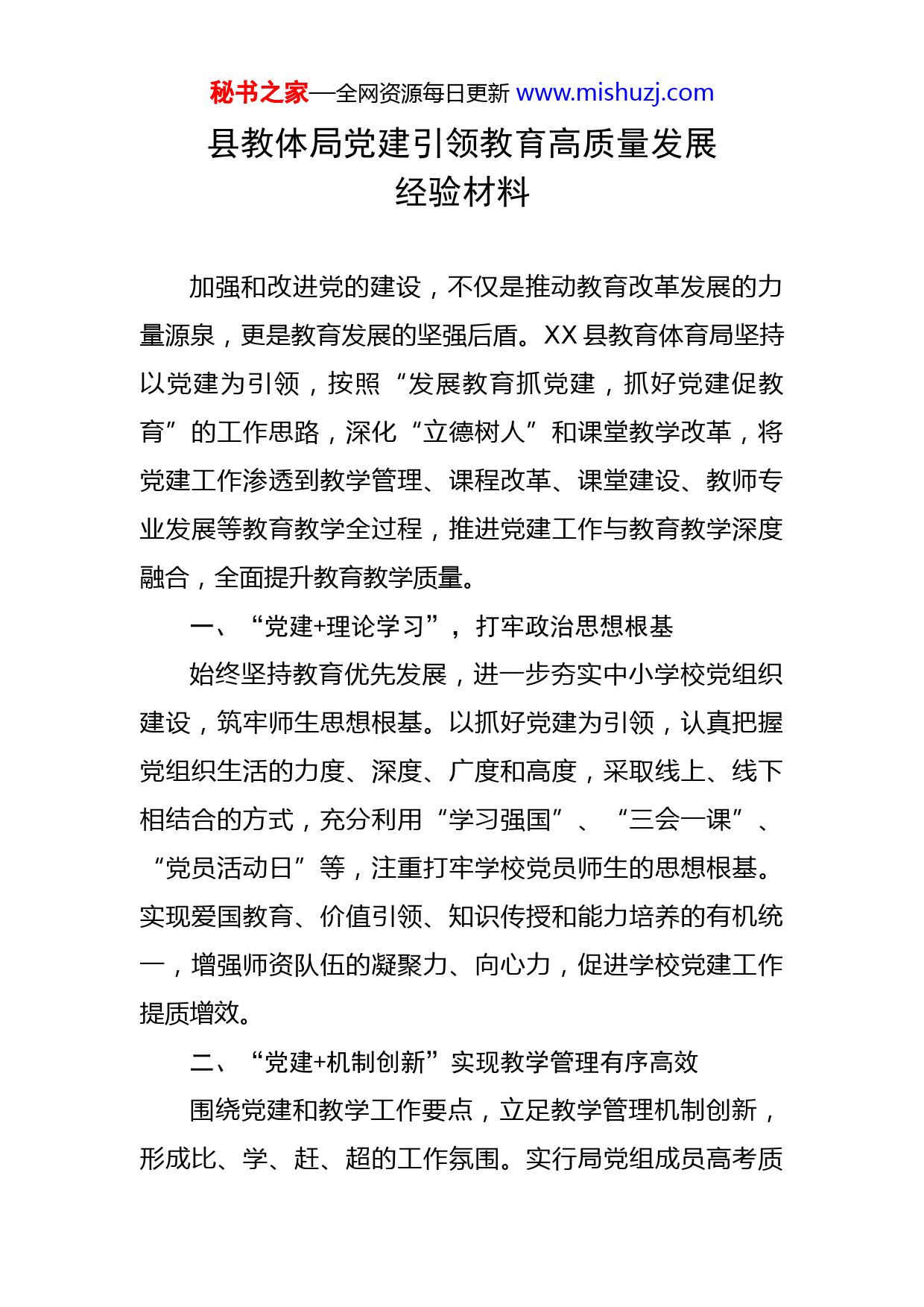 秘书之家—全网资源每日更新www.mishuzj.com县教体局党建引领教育高质量发展经验材料加强和改进党的建设,不仅是推动教育改革发展的力量源泉,更是教育发展的坚强后盾。XX县教育体育局坚持以党建为引领,按照“发展教育抓党建,抓好党建促教育”的工作思路,深化“立德树人”和课堂教学改革,将党建工作渗透到教学管理、课程改革、课堂建设、教师专业发展等教育教学全过程,推进党建工作与教育教学深度融合,全面提升教育教学质量。一、“党建+理论学习”,打牢政治思想根基始终坚持教育优先发展,进一步夯实中小学校党组织建设,筑牢师生思想根基。以抓好党建为引领,认真把握党组织生活的力度、深度、广度和高度,采取线上、线下相结合的方式,充分利用“学习强国”、“三会一课”、“党员活动日”等,注重打牢学校党员师生的思想根基。实现爱国教育、价值引领、知识传授和能力培养的有机统一,增强师资队伍的凝聚力、向心力,促进学校党建工作提质增效。二、“党建+机制创新”实现教学管理有序高效围绕党建和教学工作要点,立足教学管理机制创新,形成比、学、赶、超的工作氛围。实行局党组成员高考质秘书之家—全网资源每日更新www.mishuzj.com量提升“挂包帮”制度,切实加强对备考工作的组织、协调与指导,定期调查教学进度执行情况,确保学科备考稳步推进。各党总(支)部组织优秀党员教师开展师生结对帮学活动,通过“一对一”或“一对多”的形式,对高三学子进行精准的全面指导。通过“先锋导师”系列活动的开展,随时了解学生思想动态,及时帮助化解矛盾顾虑,给予精神上的动力,增强学习的信心。三、“党建+队伍建设”充分发挥先锋模范带头作用学校实施党员教师发展规划与自我提升相结合的方式,提出“教师—骨干,骨干——党员,党员—名师”的三阶培养思路。在党员队伍中设立“党员先锋岗”、组建“青蓝工程”小组,形成“以老带新、以新促老、师徒结对、共同提高”的良好氛围,学校优秀党员率领学科组针对出现的教育教学问题,组织开展中青年教师研讨、评课会、读书交流会等活动,促使教师专业素养和教学水平不断提升,扎实有效地提高教师课堂教学水平,提高教学质量。四、“党建+学校管理”对标对表精准施策一是树牢目标导向。坚持把抓好教育质量提升、办人民满意教育作为学校党建的出发点和归宿点,千方百计在优质资源配给和激发办学活力上下功夫,目前正在实施黄龙山小学建设项目已取得突破性进展,预计今年9月实现秘书之家—全网资源每日更新www.mishuzj.com正常招生,将有效解决城区内流动人口子女就学难问题。二是强化精准指导。聚焦教育发展痛点、难点、堵点,组织三所高中教师轮流进行交叉听评课及教学业务检查并组织全县高三教师120人次参加昆一中高三备考线上教研交流活动。党员教师带头严格落实“师生同考”,坚持“以考促教”,促进教师树立“终身学习、学习终生”的思想,不断更新教育观念与教学方法。五、“党建+教育改革”推动教育向高质量发展持续深入实施“三名”工程和集团化办学,以昆一中XX学校集团化办学为引领,规范办学,计划于今年推动完成县一中晋升为XX省一级三等学校,已于2022年4月13日通过县级评审工作,切实改变高中入口问题,全力提升全县基础教育质量。持续巩固“县管校聘”改革成果,深化教师队伍建设,强化校长核心素质提升培养培训,进一步推进校长职级制落地落实。落实已经制定出台的《XX县教师培训办法》《XX县教师学时管理办法》《XX县教育系统事业单位中小学高级教师管理办法(试行)》《XX县2022年教育教学质量提升考核评价方案》等教育改革制度性措施,不断深化学校、教师考核激励工作,目标到校、责任到人,全过程跟踪指导,切实将教育质量提升的制度基础转化为治理效能。秘书之家—全网资源每日更新www.mishuzj.com六、“党建+特色品牌建设”扎实立德树人育人方向以党建为引领,健全立德树人系统化落实机制,坚持以“办好人民满意教育”为目标,以立德树人作为教育的根本任务,强化基层党组织的“保垒”意识,党员的“先锋”意识,不断深化党建品牌,XX县教育体育系统积极打造具有地方特色的党建品牌,使党建工作呈现新格局。高质量打造了党建活动室、党建长廊校史馆、红色研学基地等特色党建阵地,创建多个特色党建品牌,引领教育教学育人方向。七、“党建+红色引擎”让红色基因融入育人全过程积极发扬革命先辈信念坚定,团结奋进,坚韧不拔的精神,筑牢信仰之基,补足精神之钙。释放红色资源的凝聚力、感召力和生命力,点燃红色引擎,让红色基因入脑入心。深入推进了红色教育“进教室、进教案、进课堂”的“三进”育人计划。学校党支部班子抓好学校的顶层设计,在深化课程、课堂改革中,发挥党组织政治核心作用,将课改与学校长远规划相结合,以课程为抓手,以目标为导向,所有任课教师结合日常课堂教学,上好每一节“学科德育浸润课程”,激活学校百年红色基因种子,种下革命传承的种子,使红色基因绽放时代光彩。八、“党建+智慧教育”持续拓宽教育高质量发展路径创新教育质量提升路径,实施质量提升信息化、智能秘书之家—全网资源每日更新www.mishuzj.com化工程。制定《教育质量提升三年行动计划(2021-2023
