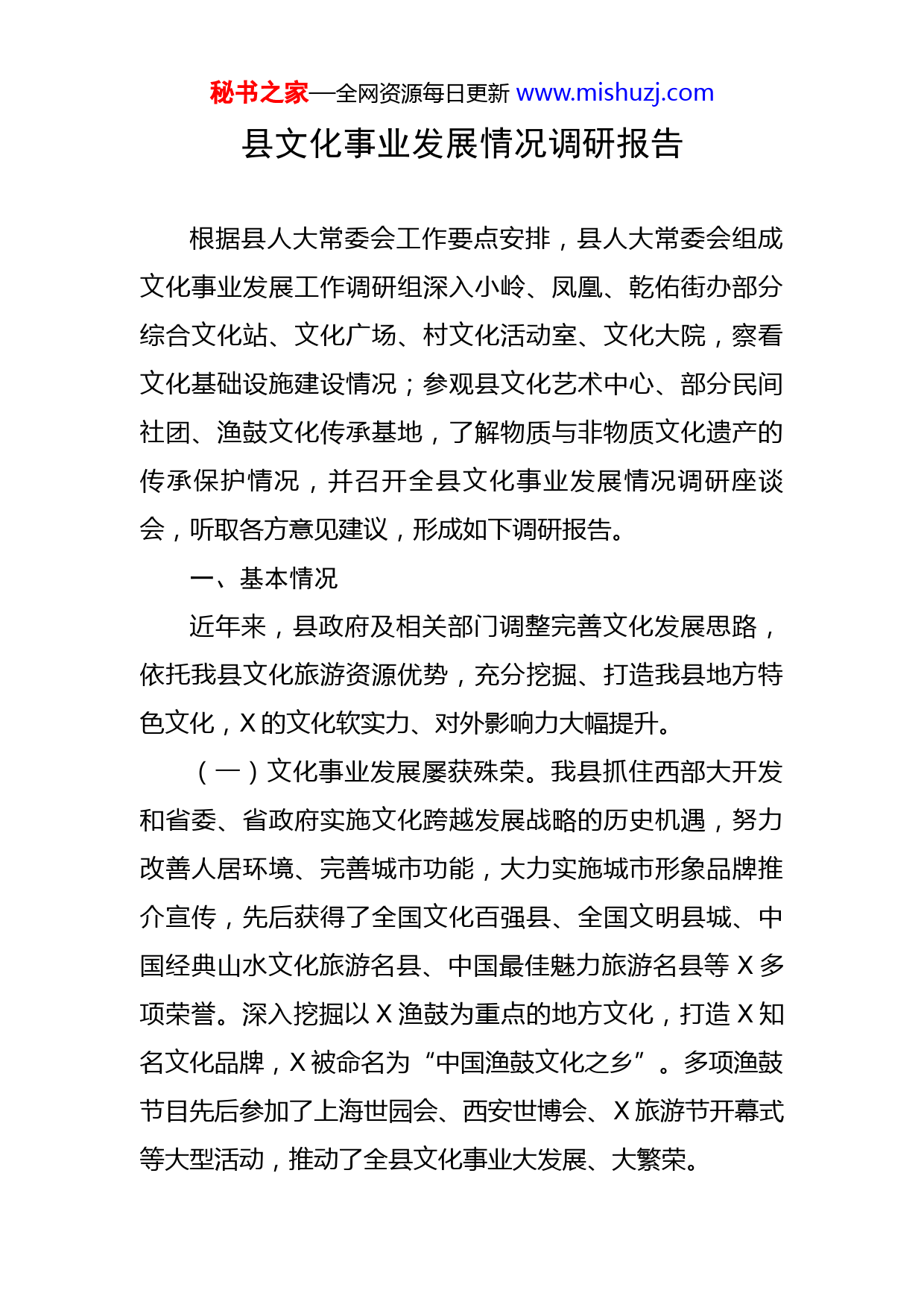 秘书之家—全网资源每日更新www.mishuzj.com县文化事业发展情况调研报告根据县人大常委会工作要点安排,县人大常委会组成文化事业发展工作调研组深入小岭、凤凰、乾佑街办部分综合文化站、文化广场、村文化活动室、文化大院,察看文化基础设施建设情况;参观县文化艺术中心、部分民间社团、渔鼓文化传承基地,了解物质与非物质文化遗产的传承保护情况,并召开全县文化事业发展情况调研座谈会,听取各方意见建议,形成如下调研报告。一、基本情况近年来,县政府及相关部门调整完善文化发展思路,依托我县文化旅游资源优势,充分挖掘、打造我县地方特色文化,X的文化软实力、对外影响力大幅提升。(一)文化事业发展屡获殊荣。我县抓住西部大开发和省委、省政府实施文化跨越发展战略的历史机遇,努力改善人居环境、完善城市功能,大力实施城市形象品牌推介宣传,先后获得了全国文化百强县、全国文明县城、中国经典山水文化旅游名县、中国最佳魅力旅游名县等X多项荣誉。深入挖掘以X渔鼓为重点的地方文化,打造X知名文化品牌,X被命名为“中国渔鼓文化之乡”。多项渔鼓节目先后参加了上海世园会、西安世博会、X旅游节开幕式等大型活动,推动了全县文化事业大发展、大繁荣。秘书之家—全网资源每日更新www.mishuzj.com(二)文化基础设施建设日臻完善。围绕《关于加快构建现代公共文化服务体系建设实施方案》,以建设文化强县为目标,先后建成X县文化艺术中心综合大楼、县影剧院,县文化馆、图书馆分别达到国家一级馆、二级馆标准,并对公众免费开放;镇(办)公用事业服务站、村级文化活动室、农家书屋覆盖率达X%;文化信息资源共享工程县镇、村服务点已全面投入运行,文化公园、文化广场、体育馆、文物及民俗博物馆等文化惠民工程不断完善。基本形成了覆盖城乡、结构合理、功能健全的公共文化服务体系。(三)文艺创作发展不断繁荣。设立了文学艺术创作奖励基金和X渔鼓开发专项基金,鼓励广大文艺工作者创作精品力作。《X》等以X渔鼓为品牌的文艺节目,获得省市多项大奖,省内知名艺术评论家给予了高度评价。《X》等X部宣传片在省市均有一定影响,《X》等X部长篇小说相继问世,X余篇文艺作品在省市刊物发表,X件文艺作品和X余幅书画、摄影作品中省市获奖。(四)文化旅游产业融合发展不断增速。以特色旅游文化为纽带,打造精品景区和文化产业园区,以朱家湾为代表的文化旅游产业示范基地初具规模。深度挖掘“生态文化、民俗文化、演艺文化、中医药文化”资源,打造“中国渔鼓文化之乡”国家级文化品牌,为X山水旅游注秘书之家—全网资源每日更新www.mishuzj.com入了文化元素。进行文化包装,全力推进文艺演出进景区常态化,启动实施“全景X”、“传奇X”、“诗赋X”、“楚音X”四大文旅产品工程。(五)物质文化与非物质文化遗产的传承保护成效显著。建立完善了县级非物质文化遗产名录X项,其中X渔鼓、杏坪手工皮纸技艺等X项进入省级保护名录。县文物馆藏文物X(组)件,县境内不可移动古遗址、古墓葬、古建筑文物点、近现代重要史迹及代表性建筑等X件文物均得到很好保护,凤凰古镇被评为中国历史文化名镇。X渔鼓已成为我县特色文化品牌,X十三花、X洋芋糍粑已成为X旅游的特色饮食文化,X非物质文化遗产陈列室,以文图实物相结合,向公众免费开放。二、存在问题虽然我县文化事业发展有了长足的发展,但是我县文化事业发展还处在一个总量不大、质量不高的发展阶段,仍然存在一些制约发的问题。(一)文化事业重视程度有待提高。一是文化资源整合缺乏统一规划、设计、监管,文化项目的储备不足,对文化产业开发的不足;各部门文化发展的协作意识不强,齐抓共管文化事业发展的整体合力尚未有效发挥。二是个别镇(办)和部门部分领导和群众缺乏文化事业发展理念,对文化事业的地位、作用认识不足;各镇(办)文化秘书之家—全网资源每日更新www.mishuzj.com干部大多身兼数职,投身文化工作的精力受限,导致基层文化活动开展不正常。村组文化活动室、农家书屋由于缺乏管理人员、经费等,维持正常运转较为困难。(二)公共文化服务体系发展不平衡。一是县文化艺术中心综合大楼文化馆、图书馆,虽然对公众免费开放,但公众利用率不高。二是农村公共文化产品供给不足,文化投入总量不足,存在无资金、无场地、无人员等现象,农村的公共文化活动开展难。三是部分基层村组配备的公共设施、文化书屋、文化广场等场地都处于闲置中,配备的音响、乐器等器材都为装箱状态,没有真正发挥其应有的作用。(三)文化产业与旅游产业融合发展的后劲不足。一是文化演艺市场的策划包装不足,大型情景歌舞剧《竹风清音渔鼓情》《孝义川》虽然成功编排,但是到目前为止,还没有包装投放到旅游演艺市场,没有能演示地方民间文化特色的歌舞戏剧的场所,各景区景点也没有可供小型歌舞、民情民俗表演的场所,集中展示我县丰富旅游文化商品的综合购物场所太少。二是旅游文化特色商品开发滞后。富有X地域特色的旅游纪念品很少,缺乏专门研制生产的企业、规模的旅游定点商场,乾佑石、渔鼓纪念品虽完成研制但市场规模不大,难以满足不同层次游客的需要。三是地方民俗文化的发展和市场培育滞后,杏坪皮纸、秘