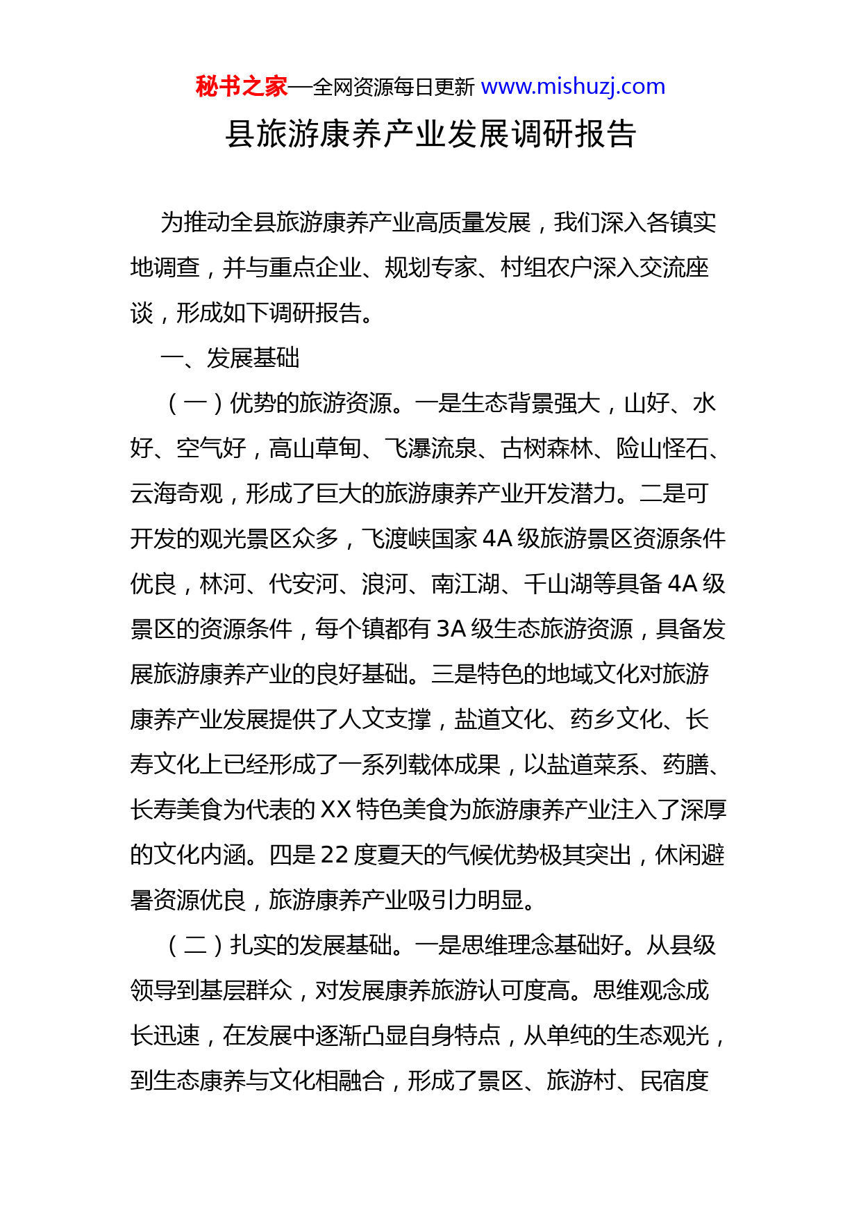 秘书之家—全网资源每日更新www.mishuzj.com县旅游康养产业发展调研报告为推动全县旅游康养产业高质量发展,我们深入各镇实地调查,并与重点企业、规划专家、村组农户深入交流座谈,形成如下调研报告。一、发展基础(一)优势的旅游资源。一是生态背景强大,山好、水好、空气好,高山草甸、飞瀑流泉、古树森林、险山怪石、云海奇观,形成了巨大的旅游康养产业开发潜力。二是可开发的观光景区众多,飞渡峡国家4A级旅游景区资源条件优良,林河、代安河、浪河、南江湖、千山湖等具备4A级景区的资源条件,每个镇都有3A级生态旅游资源,具备发展旅游康养产业的良好基础。三是特色的地域文化对旅游康养产业发展提供了人文支撑,盐道文化、药乡文化、长寿文化上已经形成了一系列载体成果,以盐道菜系、药膳、长寿美食为代表的XX特色美食为旅游康养产业注入了深厚的文化内涵。四是22度夏天的气候优势极其突出,休闲避暑资源优良,旅游康养产业吸引力明显。(二)扎实的发展基础。一是思维理念基础好。从县级领导到基层群众,对发展康养旅游认可度高。思维观念成长迅速,在发展中逐渐凸显自身特点,从单纯的生态观光,到生态康养与文化相融合,形成了景区、旅游村、民宿度秘书之家—全网资源每日更新www.mishuzj.com假、特色体验、产业园区互动融合的发展趋势。二是策划与规划的水平持续增强。在完成全县旅游总体规划、曙河生态旅游经济示范区旅游总体规划的基础上,全县全域旅游规划已完成初稿,正加紧修改完善,一批重点景区规划和旅游重点村规划全面完成。三是设施配套水平长足提升。大的交通瓶颈实现突破,平镇高速公路全线贯通,XX向北1.5小时可到达安康富强机场。2022年底镇巫高速有望开通,届时XX向南可1.5小时到达长江奉节港口。XX作为陕西面向长江经济带的门户地位将更加凸显、作用发挥更加明显。(三)广阔的客源市场。从XX县的旅游资源特色分析客源市场,一是XX县地处重庆、西安、武汉及安康等城市之间,夏季避暑需求总人口数量达到4500万以上,随着平镇高速开通,加上不久后将要开通的镇巫、十巫高速公路,XX的客流量会呈现爆发式增长。二是XX是巴山药乡,是中国首个长寿文化之乡,对发展乡村旅游极其有利。特别是中国药科大学扶贫XX,在中医药文化项目开发上,能够为XX提供顶尖级人才与人脉资源支撑,将XX打造成为领先全国的中医药康养胜地的可行性极强。三是旅游康养资源丰富,有一批适合旅游康养开发的景区景点,生态优良,宜居宜养,在陕渝鄂秦巴山区构成重大影响力。秘书之家—全网资源每日更新www.mishuzj.com(四)蓬勃的市场主体。最有前景的产业最受资本的关注。意向投资XX的考察客商关注的重点是XX旅游康养产业。飞渡峡景区提升、长寿谷景区建设稳步推进;腊味小镇民宿群成为XX旅游的一个亮点,陕西芋硒王国际康养有限公司正式入住腊味小镇运营,金柳山庄康养项目有序推进;阳安、大树、中坝、兴隆等一批旅游村蓬勃兴起。其中由博元集团投资的兴隆村民宿集群建设项目已经达成合作意向;茶旅融合的向阳春、小石茶产业园区,林旅融合的钟宝红杉溪谷,药旅融合的华坪金蕊,农旅融合的马镇、千山产业园区,渔旅融合的南江湖、千山湖库区开发等一批重点旅游项目都在蓬勃发展。涉及旅游发展的服务企业全县达到20余户,建成三星级宾馆2家、民宿15户,全县宾馆(农家乐)床位数达到3000余张。旅游康养产业可谓XX内生动力最强、资本关注最大的经济领域。(五)显著的带动效果。旅游康养产业发展让XX经济优化转型,成为XX发展的核心动力,显示出了富民效果。带动群众创业,曙河旅游经济示范带所在的曙坪镇农家乐集群发展迅速,区域内农家乐、民宿达到41户,占全县农家乐、民宿总数的40%。曾家镇-普安寨-小石茶-千山湖北环线旅游多种业态的旅游经济初具规模。带动农业增值,“农户找市场”变成了“市场找农户”,仅曙河流域内发展生猪、水产、养蜂、蔬菜、林下养鸡协会组织16个。带秘书之家—全网资源每日更新www.mishuzj.com动生态保护,旅游消费让广大群众切实感受到了绿水青山就是金山银山,保护生态、建好家园、旅游致富,成为群众的共识行动。二、存在问题XX县旅游康养产业虽然具备较好的发展基础,但依然存在一些问题。一是规划统筹方面。现有的旅游规划普遍侧重于旅游行业的标准范式,可供生态、交通、水利、农林、卫计等相关部门纳入引用、争取项目支持的较少。二是龙头引领方面。受“8.29”、“9.19”两次洪灾袭击,景区损失惨重,主要景点多处毁坏、景区道路不通、基础配套受损严重,无法正常营业,景区的核心龙头作用需进一步加强。三是宣传策划方面。理念上,偏重于自身对旅游市场的认知,往往是根据个人有限的旅游经历看旅游经济,缺少真刀实枪的市场碰撞与交流,对旅游市场、游客需求的判断存在较多的偏差。关注点上,侧重于重资产的旅游建设项目,对轻资产、智慧型、人文型、平台型的产业项目、人才投资引进不足、合作不足,既缺意识,更缺探索与实践。同时,在盈利模式、运作方式、游客体验项目上较为传统。三、对策建议(一)准确定位,发展壮大康养产业。一是提升产业地位。把旅游康养提升为XX乡村振兴的重点产业,通过“旅秘书之家—全网资源每日更新www.mishuzj.com