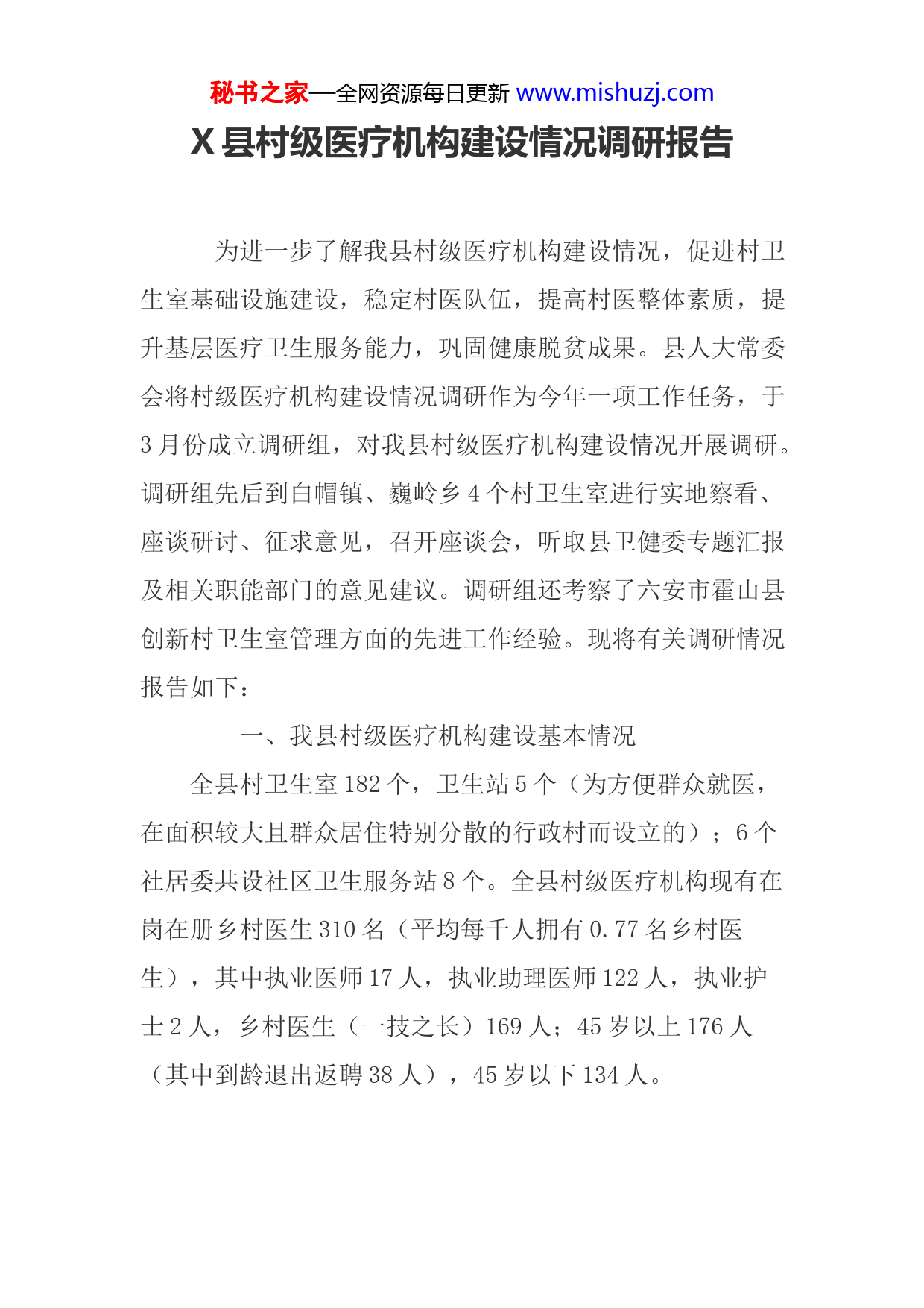 秘书之家—全网资源每日更新www.mishuzj.comX县村级医疗机构建设情况调研报告为进一步了解我县村级医疗机构建设情况,促进村卫生室基础设施建设,稳定村医队伍,提高村医整体素质,提升基层医疗卫生服务能力,巩固健康脱贫成果。县人大常委会将村级医疗机构建设情况调研作为今年一项工作任务,于3月份成立调研组,对我县村级医疗机构建设情况开展调研。调研组先后到白帽镇、巍岭乡4个村卫生室进行实地察看、座谈研讨、征求意见,召开座谈会,听取县卫健委专题汇报及相关职能部门的意见建议。调研组还考察了六安市霍山县创新村卫生室管理方面的先进工作经验。现将有关调研情况报告如下:一、我县村级医疗机构建设基本情况全县村卫生室182个,卫生站5个(为方便群众就医,在面积较大且群众居住特别分散的行政村而设立的);6个社居委共设社区卫生服务站8个。全县村级医疗机构现有在岗在册乡村医生310名(平均每千人拥有0.77名乡村医生),其中执业医师17人,执业助理医师122人,执业护士2人,乡村医生(一技之长)169人;45岁以上176人(其中到龄退出返聘38人),45岁以下134人。秘书之家—全网资源每日更新www.mishuzj.com(一)基础设施建设得到改善。我县于2007年至2009年利用农村卫生服务体系建设项目对全县村卫生室进行了全面改扩建,面积为80-120平方米。诊断室、治疗室(处置室)、药房、观察室、资料室(健康教育室)、值班室等六室分开,并配备了常用的诊疗设备、急救设施和办公设施,村级卫生室基础设施建设得到了全面提升。2015年以来,县卫计委每年整合资金分批分期进行房屋维修、器械设备更新;2017年县政府安排专项资金308.5万元对全部村卫生室进行改造改建,基本达到标准化要求;2018年争取省卫计委项目支持为各村卫生室集中配备了健康一体机,2019年推行公共卫生服务“两卡制”,为各乡村医生添置了平板电脑,县财政每年预算村卫生室房屋管护经费1000元/室,用于村卫生室修缮,村卫生室医疗条件得到了改善。(二)村医服务水平有所提升。自2016年起,县卫计委依托县医院、县中医院等两个县域医共体牵头医院,每年对辖区内所有乡村医生进行1至2轮专业技能培训。为了鼓励村医主动进修和接受学历教育,县卫计委联合县财政局出台《X县乡村医生培养方案》,对到县乡医疗机构免费进修且考核合格的乡村医生给予适当补助,三年来,151名乡村医生到乡镇卫生院或县级医院进修培训;14名乡村医生参加半脱产学习,取得医学类成人专科以上学历,村秘书之家—全网资源每日更新www.mishuzj.com医医疗服务水平得到提升。2016年全县开展了“群众满意的村卫生室”创建活动,截止目前,我县有2家村卫生室被授予省级群众满意的村卫生室称号,6家村卫生室被评为市级群众满意的村卫生室称号。(三)村医待遇逐步提高。近几年来,随着各级政府对村级医疗卫生工作的重视,村医的待遇有所提高。我县村医收入主要由基本公共卫生补助、药品零差率销售补助、一般诊疗费、家庭医生签约服务等四部分补助经费以及一般诊疗费患者自付部分、有偿签约服务对象自付部分和提供中医药服务药品提成等几部分组成,年平均收入约3-5万元,较前几年村医收入状况有了很大改观。另外,县财政每年补助每个村卫生室3600元办公经费,用于村卫生室水电、网络等办公费用。2015年,我县对1109名乡村医生进行了身份和工作年限认定,对退出村医采取了相应措施保障其生活,村医可自主选择购买农村居民养老保险,到龄退出后可以享受农村居民养老保险金,退出的村医年满60周岁时根据其工作年限,可以享受一定数额退出村医生活补助(补助标准:2018年12月份以前为30元—330元/月,自2019年1月份开始,提高到48元—528元/月,补助标准提高了60%),截止2019年1月份,已有629名退出乡村医生领取生活补助。秘书之家—全网资源每日更新www.mishuzj.com(四)村医风险防控机制初步形成。一是为有效预防村医上下班途中、出诊等面临的意外伤害事件,县卫计委每年自筹资金为在岗村医购买了意外伤害保险。二是为强化村医责任意识,增强抵御医疗风险能力,县卫计委引导全县乡村医生成立了X县乡村医生协会,每名在岗乡村医生缴纳1万元执业风险金,共计310万元集中投资到X县城投公司,利用投资利息收益对乡村医生医疗责任纠纷赔偿进行适当补助。截止2018年底,利用投资收益共赔付医疗事故(纠纷)6起,赔付金额达到40.4万元,极大地缓解了村卫生室医患纠纷经济赔付的压力。三是县政府对村卫生室和村医抗医疗风险能力高度重视,自2019年起县财政预算安排40万元村级医疗风险基金补助,滚存使用。二、当前存在的主要问题(一)基础设施已不能满足工作需要。我县的村卫生室基本上都是2007年至2011年期间所建,建筑面积80—120平方米,占地面积小,且没有厨房、卫生间等配套设施,部分村卫生室因生活需要自行改变了村卫生室房屋用途,个别村卫生室至今没有通自来水,村医的工作和患者的生活十分不便,已经不能满足基本医疗和基本公共卫生服务需求。随着社会经济的发展,特别是国家省市各级政府对农村卫生工作都提出了更高的标准,我县村卫生室的基础设施建设严重滞后。秘书之家—全网资源每日更新www.mishuzj.com(二)设备设施陈旧,维修维护成本较高。大部分村室医疗设备、办公设施仍是2007年村室建设时统一配备的