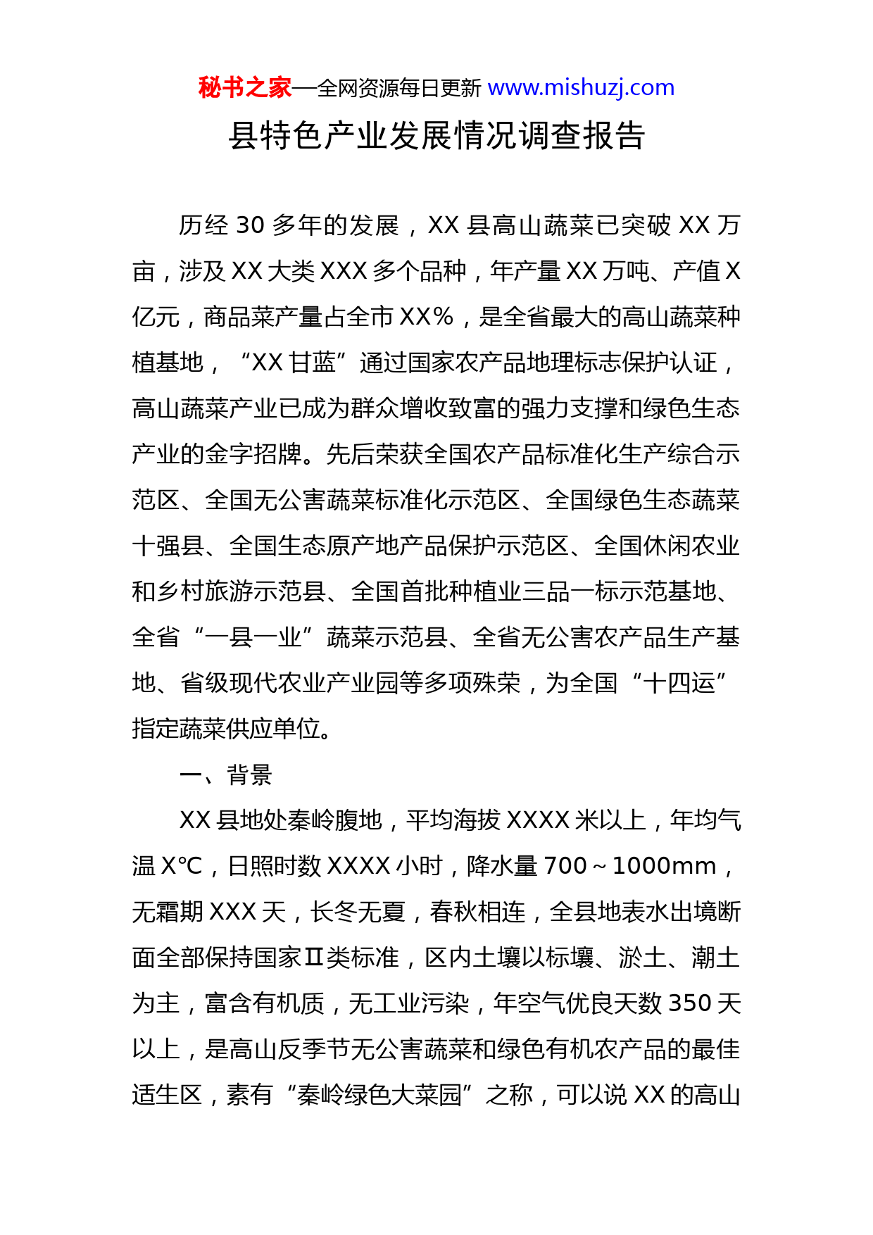 秘书之家—全网资源每日更新www.mishuzj.com县特色产业发展情况调查报告历经30多年的发展,XX县高山蔬菜已突破XX万亩,涉及XX大类XXX多个品种,年产量XX万吨、产值X亿元,商品菜产量占全市XX%,是全省最大的高山蔬菜种植基地,“XX甘蓝”通过国家农产品地理标志保护认证,高山蔬菜产业已成为群众增收致富的强力支撑和绿色生态产业的金字招牌。先后荣获全国农产品标准化生产综合示范区、全国无公害蔬菜标准化示范区、全国绿色生态蔬菜十强县、全国生态原产地产品保护示范区、全国休闲农业和乡村旅游示范县、全国首批种植业三品一标示范基地、全省“一县一业”蔬菜示范县、全省无公害农产品生产基地、省级现代农业产业园等多项殊荣,为全国“十四运”指定蔬菜供应单位。一、背景XX县地处秦岭腹地,平均海拔XXXX米以上,年均气温X℃,日照时数XXXX小时,降水量700~1000mm,无霜期XXX天,长冬无夏,春秋相连,全县地表水出境断面全部保持国家Ⅱ类标准,区内土壤以标壤、淤土、潮土为主,富含有机质,无工业污染,年空气优良天数350天以上,是高山反季节无公害蔬菜和绿色有机农产品的最佳适生区,素有“秦岭绿色大菜园”之称,可以说XX的高山秘书之家—全网资源每日更新www.mishuzj.com蔬菜住的是风景区,喝的是矿泉水,吃的是有机质,养分最足、口感最佳、色泽最鲜、品质最优。随着全国高速路网的全面贯通和互联网的逐步普及,全国各地的蔬菜涌入周边县区市场,对XX的蔬菜价格造成巨大冲击,加之XX县山大沟深,外出交通不便利,蔬菜“下山”难、“出山”难,连续几年出现甘蓝、菜花、萝卜滞销,每年烂在地里的蔬菜XX多万吨,损失近亿元。全县支柱产业停滞不前,群众增收困难,上访事件时有发生,媒体动辄负面炒作,大搞悲情营销,“辛辛苦苦一整年,不如打工两个月”成为广大菜农的口头禅。二、做法(一)科学化设计。县委、县政府以打响“XX高山蔬菜品牌”为目标,以巩固设施菜、培育精细菜、创优特色菜、发展有机菜为重点,坚持做大做强蔬菜种植这一传统产业,成立由县政府县长任组长,县委副书记、县政府主管副县长任副组长,各镇、各有关部门主要负责人为成员的蔬菜产业发展工作领导小组,研究制定《“十四五”蔬菜产业发展规划》《关于进一步加强蔬菜产业发展的实施意见》,把蔬菜产业作为首位产业,举县一致建基地、兴产业、树品牌、促营销。每年安排到户贴息贷款XXXX万元、产业扶持资金XXXX万元,扶贫互助资金借贷XXX余万元,对园区建设、质量认证、品牌打造、龙头企业等给秘书之家—全网资源每日更新www.mishuzj.com予重点扶持,全县蔬菜产业逐步实现品种多样化、种植精细化、产品系列化、质量无害化,形成了早中晚熟品种搭配,名优新特品种并举,大路菜与精细菜、露地菜与大棚菜互补的生产格局。(二)规模化发展。按照“一县一业”发展定位,持续巩固蔬菜首位产业地位,向规模要效益、以集约促发展,不断推动产业提档升级。一是发展龙头企业。以现代农业园区建设为抓手,逐年加大农业建设用地、基础设施等方面政策资金配套,鼓励蔬菜企业做大做强,投资XX亿元,高标准建设秦西、秦绿等现代农业园区XX个,其中秦西、绿农、雪岭被评为省级现代农业园区,引进米禾公司发展蔬菜冷链物流,扶持绿蕾建成粤港澳大湾区菜篮子直供基地,支持秦西、秦绿、朝邑等龙头企业发展设施蔬菜,带动全县蔬菜产业由零散杂向集约化、规模化、现代化发展。二是壮大合作组织。按照“依法、资源、有偿”原则,采取互换、转包、反租倒包等形式,推动闲置、撂荒土地向合作社有序流转,做大合作社规模,发展集约化农业,培育黄菜花、盛禾等蔬菜种植营销合作社XXX家,通过分户生产、订单收购方式,让周边菜农搭上“致富便车”,带动包装、餐饮、运输等相关产业快速发展。三是培育种植大户。出台《XX县蔬菜产业发展奖励扶持办法》,每年列支300万元对蔬菜专业村、种植大户进行专秘书之家—全网资源每日更新www.mishuzj.com项奖励扶持,调动农民群众发展产业积极性,培育100亩以上种植大户XXX户,实现了农户从“单打独斗”向规模化、集约化的转变。(三)品质化建设。把质量安全作为蔬菜产业的生命线,坚定不移推进质量提升工程,保障高山蔬莱产业安全发展、提质增效。一是强化源头管控。出台农产品质量安全监管办法,明确属地管理责任,建立种子、化肥、农膜等农业投入品生产经营单位诚信档案,对外公布25家农资生产经营主体信用等级名单,落实生产经营台账、索证索票、实名购买等制度,实施土地健康体检工程,加大农业废弃物无害化、资源化利用力度,减少农业面源污染,从源头上提升品质。二是强化过程监管。严格落实产地准出制度,实行田间档案管理,积极落实农产品生产主体对农产品生产全过程质量控制,生产加工企业建立全过程监管制度,做到产品有标识、质量可追溯、责任可追究。加大蔬菜生长全过程抽检送检,2022年省级监督抽检送样XX个,市级监督抽检X批XX个,自检速测XXXXX个,合格率均为100%。三是强化产后追溯。实行整县推进质量追溯和合格农产品许可经营制度,实行XX县高山蔬菜身份证管理,建立“合格证+追溯”体系多级平台,全县XX家生产经营主体全部纳入信息追溯平台管理,统一标准、统一模式制发蔬菜产业合格证,累计发放合格