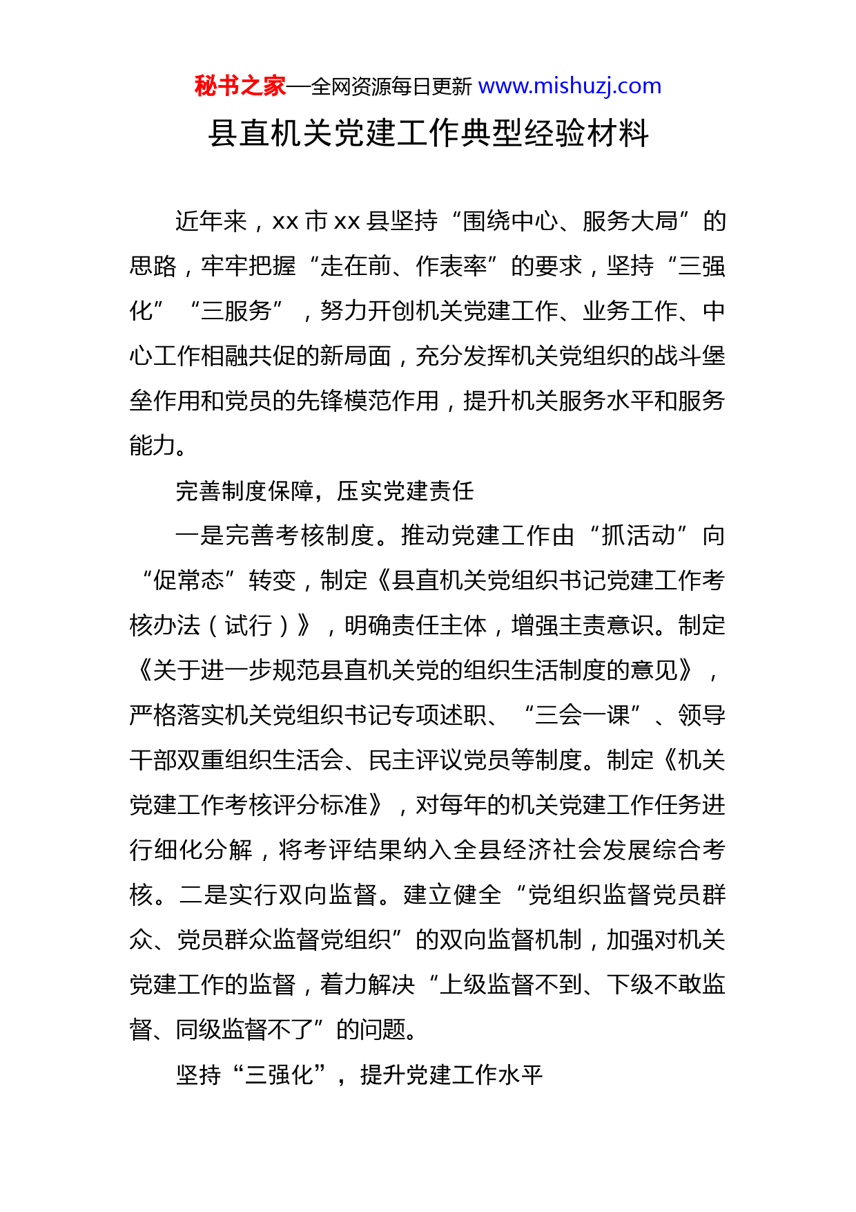 秘书之家—全网资源每日更新www.mishuzj.com县直机关党建工作典型经验材料近年来,xx市xx县坚持“围绕中心、服务大局”的思路,牢牢把握“走在前、作表率”的要求,坚持“三强化”“三服务”,努力开创机关党建工作、业务工作、中心工作相融共促的新局面,充分发挥机关党组织的战斗堡垒作用和党员的先锋模范作用,提升机关服务水平和服务能力。完善制度保障,压实党建责任一是完善考核制度。推动党建工作由“抓活动”向“促常态”转变,制定《县直机关党组织书记党建工作考核办法(试行)》,明确责任主体,增强主责意识。制定《关于进一步规范县直机关党的组织生活制度的意见》,严格落实机关党组织书记专项述职、“三会一课”、领导干部双重组织生活会、民主评议党员等制度。制定《机关党建工作考核评分标准》,对每年的机关党建工作任务进行细化分解,将考评结果纳入全县经济社会发展综合考核。二是实行双向监督。建立健全“党组织监督党员群众、党员群众监督党组织”的双向监督机制,加强对机关党建工作的监督,着力解决“上级监督不到、下级不敢监督、同级监督不了”的问题。坚持“三强化”,提升党建工作水平秘书之家—全网资源每日更新www.mishuzj.com一是强化上下联动。坚持全员动员、全员参与、上下联动,建立县级领导干部机关党建联系点制度,县级领导干部每人联系x~x个机关党组织,定期深入联系点调研指导、帮助解决难题。建立区域性联动共建机制,以区域性党建为着力点,打破体制限制,组织xx个县直部门机关党组织与xx个社区结成联动共建对子,形成了县直机关与社区“共建共享”的工作新格局。xxxx年结合xx,组织有关部门开展各类联建活动xx余次,努力营造齐抓共管的良好氛围。二是强化典型引领。结合县直机关各单位具体实际,xxxx年共评选出先进基层党组织xx个、优秀党务工作者xx名、优秀共产党员xx名。此外,累计打造市级“红旗高扬”示范党支部xx个。三是强化作风建设。制定《xx县县直机关党员干部不作为不担当问责实施意见(试行)》,围绕重大项目推进、重大决策部署落实,深入推进作风效能整治、正风肃纪等专项行动。以党史学习教育、“红旗高扬”红色品牌创建为契机,提高机关工作质量、服务水平和党员素质,切实转变工作作风。坚持“三服务”,提升为民服务水平一是服务中心工作。有针对性地设计抓手、平台和载体,结合疫情防控、乡村振兴等中心工作,开展“对标先进”主题党日活动,广大机关党员干部立足本职、对标先进、补齐短板,保障了各项中心工作落实落地。二是服务秘书之家—全网资源每日更新www.mishuzj.com党员干部。通过开展党员志愿者服务、“我来讲党课”等活动,进一步增强党组织的凝聚力和战斗力,充分调动县直机关党员干部干事创业的积极性、主动性和创造性。关心关爱机关党员干部,积极开展退休干部、老干部“送学上门”、走访慰问等活动。xxxx年“七一”期间,发放“光荣在党xx年”纪念章xxxx枚,慰问机关退休老干部xxx余人。三是服务基层群众。扎实开展“我为群众办实事”实践活动,坚持工作重心下移,“身入”基层、“心到”群众、接好“地气”,密切关注民生,不断拓展联系和服务群众的渠道。县直机关选派xx名“加强农村基层党组织建设”工作队队员,深入xx个乡镇(街道)、xx个村开展驻村帮扶。xx个部门单位、xxxx余名党员扎实开展“双报到”,帮助群众解决问题xxxx余件,为xx县推进乡村振兴、优化基层治理、提升群众满意度和幸福感提供了坚强组织保证。