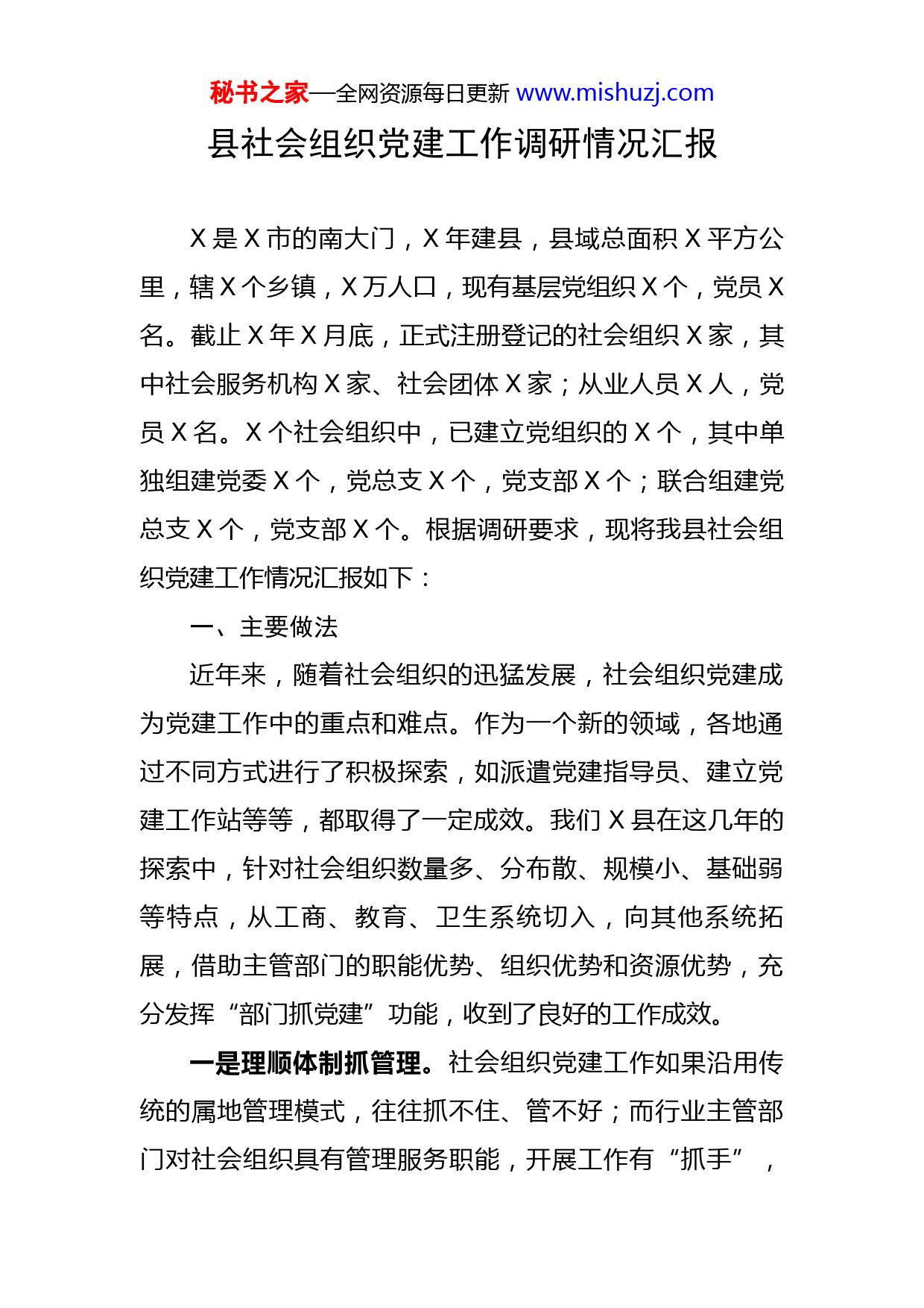 秘书之家—全网资源每日更新www.mishuzj.com县社会组织党建工作调研情况汇报X是X市的南大门,X年建县,县域总面积X平方公里,辖X个乡镇,X万人口,现有基层党组织X个,党员X名。截止X年X月底,正式注册登记的社会组织X家,其中社会服务机构X家、社会团体X家;从业人员X人,党员X名。X个社会组织中,已建立党组织的X个,其中单独组建党委X个,党总支X个,党支部X个;联合组建党总支X个,党支部X个。根据调研要求,现将我县社会组织党建工作情况汇报如下:一、主要做法近年来,随着社会组织的迅猛发展,社会组织党建成为党建工作中的重点和难点。作为一个新的领域,各地通过不同方式进行了积极探索,如派遣党建指导员、建立党建工作站等等,都取得了一定成效。我们X县在这几年的探索中,针对社会组织数量多、分布散、规模小、基础弱等特点,从工商、教育、卫生系统切入,向其他系统拓展,借助主管部门的职能优势、组织优势和资源优势,充分发挥“部门抓党建”功能,收到了良好的工作成效。一是理顺体制抓管理。社会组织党建工作如果沿用传统的属地管理模式,往往抓不住、管不好;而行业主管部门对社会组织具有管理服务职能,开展工作有“抓手”,秘书之家—全网资源每日更新www.mishuzj.com指导推进党建工作就会推得动,行得通。我们先后在工商、教育、卫生系统等规模较大、人员较多、影响力强的社会组织成立了私个协会党委、民办教育协会党委、民办医院联合会党委,并向其他业务主管部门拓展,明确行业主管部门、协会和属地党委抓党建工作职责,建立以职能部门党委(党组)统一管理指导,协会党委自我管理为主、乡镇党委属地管理为辅的“一统双管”管理体制。对一些专业性不强、规模较小,不适合归口管理的社会组织,由所在乡镇党委实施“兜底”管理。二是扩大覆盖抓组建。行业主管部门工作机构最健全,联系社会组织最密切,推进党的组织覆盖最有力。我们在创建“协会+党委”的组织模式的同时,根据社会组织的实际情况,在定期梳理“隐性党员”基础上,对有正式党员三名以上、有合适的党支部书记人选的,采用“内建”方式,单独建立党的组织;对党员人数少、暂不具备单独建立党组织条件的,采取“外建”方式,由业务主管单位或行政挂靠单位党组织管理或依托较稳定的行业自律组织组建党支部;对没有党员的,通过选派党建工作指导员“帮建”,做好培养入党积极分子和发展党员工作;对符合建立工会组织的,先建立工会组织,为建立党组织创造条件;建立了党群组织建设“登记申报、年审年检”制度,夯实基础工作。全县形成了业务主管单位或行政挂靠秘书之家—全网资源每日更新www.mishuzj.com单位党组织、行业协会党组织、社会组织党组织三级组织体系。三是创新载体抓活动。主管部门抓党建,能够更加贴近行业系统实际和党员需求,使基层党建与业务工作有机融合、相互促进、形成特色。我们针对不同领域开展了各具特色化的党建活动,比如在私个协会党委通过开办“诚信经营课堂”,争创“党员示范店”、“青年文明号”和“巾帼示范岗”为主题的“一课三创”活动,凸显了诚信党建特色;在民办医院联合会党委以“三好一满意”为载体,开展“医德好、技术好、服务好、群众满意”党员标兵评比,提升群众满意度;在民办教育协会党委实施“三化关爱工程”,号召各民办学校党组织围绕“亲情化教育教学、信息化家校互动、社会化监护管理”,打造留守儿童的温馨家园。县×学校成为苏北最大的留守儿童寄宿学校,并被评为“中国民办教育百强校”。四是统筹资源抓保障。社会组织党建基础往往比较薄弱,而主管部门拥有丰富的党建工作经验和厚实的党建工作资源,主管部门抓党建,能够整合行业主管部门和行业协会组织的优势资源,支持和保障系统内党组织建设。我们通过建立主管部门党委(党组)领导分片挂联党组织、秘书之家—全网资源每日更新www.mishuzj.com定点指导薄弱党组织制度,并从各系统选派了×多名经验足、威望高的党员干部担任党建指导员,力争做到“一人双岗、双向兼职”,确保党建工作有人抓。通过党费划拨一点、部门支持一点、系统内筹集一点的办法,建立×万元专项基金,保证党组织活动有经费。按照“一站五中心”模式,建设区域性、开放式党群工作站,开展“业主支持、职工拥护、党员欢迎”的各类活动,引领党员创先争优。私个协会党委党群工作站模式被评为全省非公企业和社会组织党建十佳创新项目。五是完善制度抓规范。我们从建立健全制度着手,为社会组织党建工作的规范、有效开展提供有力的制度保障。在先后下发《关于加强行业系统党建工作的意见》、《关于发挥部门职能优势加强社会组织党建工作的意见》等文件的基础上,结合“两学一做”学习教育,制定了《关于在社会组织党员中开展“学党章党规、学系列讲话,做合格党员”学习教育的指导方案》,对社会组织党秘书之家—全网资源每日更新www.mishuzj.com建工作提出了明确的任务和要求。各社会组织业务主管部门也纷纷从制度建设入手,建立健全社会党组织“三会一课”、民主生活会、民主评议党员、党员联系群众工作、党员党内监督、党员经常性教育管理、发展党员工作、党费收缴等一系列制度,促使全县社会组织党建工作逐步走上