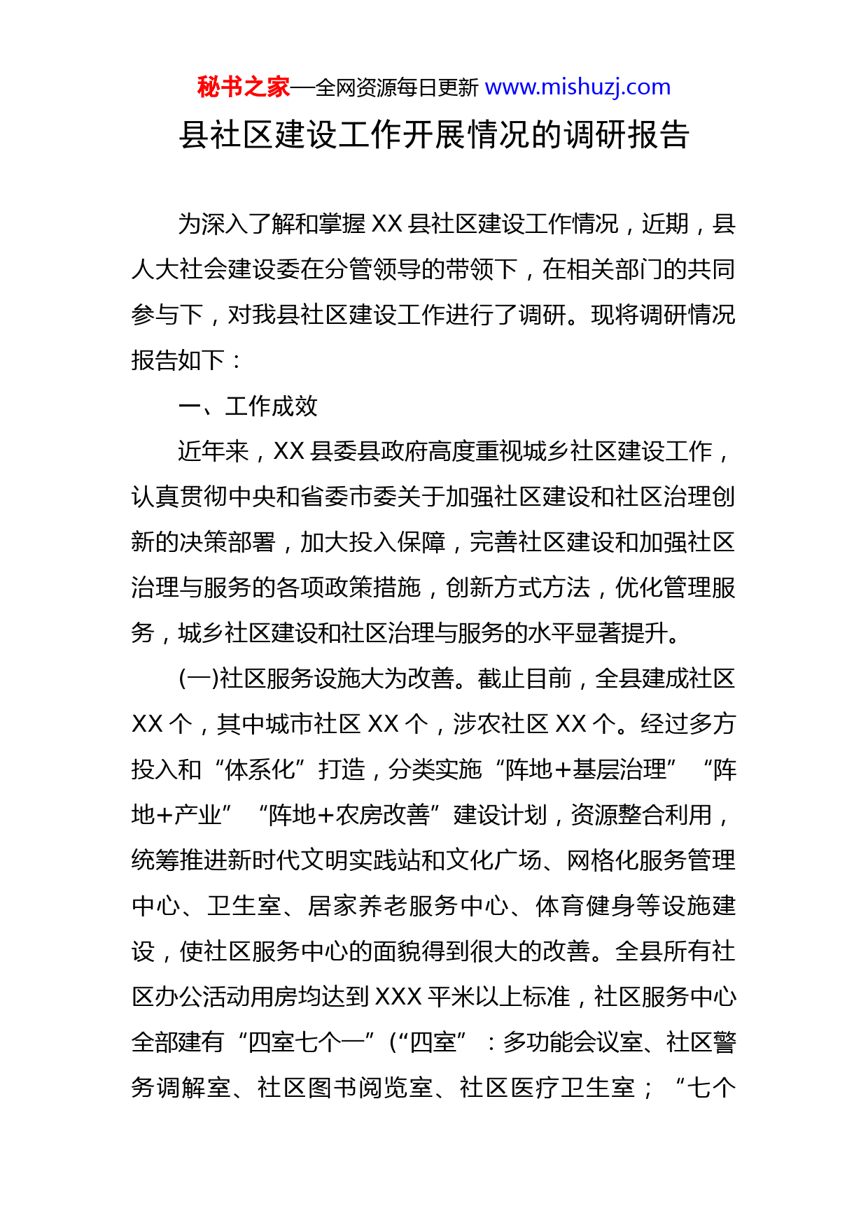 秘书之家—全网资源每日更新www.mishuzj.com县社区建设工作开展情况的调研报告为深入了解和掌握XX县社区建设工作情况,近期,县人大社会建设委在分管领导的带领下,在相关部门的共同参与下,对我县社区建设工作进行了调研。现将调研情况报告如下:一、工作成效近年来,XX县委县政府高度重视城乡社区建设工作,认真贯彻中央和省委市委关于加强社区建设和社区治理创新的决策部署,加大投入保障,完善社区建设和加强社区治理与服务的各项政策措施,创新方式方法,优化管理服务,城乡社区建设和社区治理与服务的水平显著提升。(一)社区服务设施大为改善。截止目前,全县建成社区XX个,其中城市社区XX个,涉农社区XX个。经过多方投入和“体系化”打造,分类实施“阵地+基层治理”“阵地+产业”“阵地+农房改善”建设计划,资源整合利用,统筹推进新时代文明实践站和文化广场、网格化服务管理中心、卫生室、居家养老服务中心、体育健身等设施建设,使社区服务中心的面貌得到很大的改善。全县所有社区办公活动用房均达到XXX平米以上标准,社区服务中心全部建有“四室七个一”(“四室”:多功能会议室、社区警务调解室、社区图书阅览室、社区医疗卫生室;“七个秘书之家—全网资源每日更新www.mishuzj.com一”:一厅一栏一所一超市一支队伍一校一场所),群众休闲有去处、看报有地方、健身有器材、购物有超市、小病有卫生室。(二)社区队伍建设明显加强。县委县政府将社区队伍建设纳入全县干部人才队伍建设规划,通过学历提升班、乡村夜课、头雁领航培训班等一系列全覆盖轮训,提升了社区干部的工作能力;不断优化我县城乡社区工作者人员结构,加快职业化、专业化的社区工作者队伍建设步伐,持社会工作者职业资格证书的人员达XXX人,专职网格员XXX人,网格覆盖率达XXX%;以社区“两委”换届为契机,依法选配城乡社区“两委”领导班子,每个社区配备了X-X名的专职社区队伍,形成以“70后”书记、“80后”骨干力量、“90后”后备干部为主体的“789”社区干部队伍,城市社区大专及以上学历占比XX%,涉农社区大专及以上学历XX%。社区干部队伍的年龄、学历等结构较以前明显改善,整体功能进一步增强。(三)社区基本运转经费得到保障。从XXXX年起我县城乡社区基本运转经费已纳入县级基本财力保障范围,并逐步提高社区建设保障水平,平均每个社区保障经费已达XX万元。同时,深化社区干部“XX”建设,构建“XXXXX”待遇保障体系,城市社区书记年平均报酬达XX万元,其他“两委”达XX万元;涉农社区书记年平均报酬达XX万秘书之家—全网资源每日更新www.mishuzj.com元,其他“两委”达XX万元;非“两委”社区工作者年平均报酬达XX万。(四)社区服务能力显著增强。基本公共服务体系形成了以网格为载体,推动“人员整合、数据聚合、工作联合”,发挥警务人员“专业优势”和网格员的“本土优势”,实现“数据联采、矛盾联调、治安联防、事件联处”的工作机制;社区均建有“社会工作站、社区志愿者工作站”,让“三社联动”有载体,让社会工作者施展才华有平台;社区按照“一站式”服务要求,将城乡低保、特困群体供养、大病救助、临时救助、“两残”补贴、优抚对象补助、“三留守”补助、尊老金申领等民政服务事项办理全部纳入“一门受理、协同办理”机制,政策、制度、程序、要求等上墙明示,所有事项一目了然,减轻群众奔波之苦;部分社区针对老年人和弱势群体较多的问题,还开展了“爱心呼叫器”等帮扶业务。二、存在问题和不足(一)社区工作负担过重。虽然各镇街每年动态调整《村(居)民委员会依法履行职责事项》和《村(居)民委员会协助政府工作事项》两张清单,明确了《不应由基层群众性自治组织出具证明事项清单》,但是各镇街、机关单位和部门仍然交办各种名目繁多的行政性任务,额外增加了各项工作考核指标,社区实际上成为一级准行政组织,社区行秘书之家—全网资源每日更新www.mishuzj.com政化倾向较为严重。有的部门、单位还把一些不应由社区出具证明事项的收入证明、婚姻状况证明、亲属关系证明等转嫁给社区;还有的要求每年向群众收取综治、安康、计生、妇女防癌保险等多项保险,百姓多有怨言,大大增加了基层干部的负担。(二)城市社区基本公共服务设施配置不达标。对照《江苏省“十三五”时期基层基本公共服务功能配置标准(试行)》规定的标准还有较大差距,公益性服务设施跟不上社区建设的需要。如,在公共教育幼儿园设置上要求的,城市社区每一万人左右常住人口设置1个幼儿园,设活动用房、办公用房等;在社会居家养老服务方面,要求每个社区设置一个居家养老服务中心等都还不达标。特别是在城市社区综合服务设施建设上,要求按照每百户居民不低于30平方米的标准配置,而我县的居民小区中:老旧小区没有配套建设社区服务设施;近几年新建小区有的规划建设不到位;有的虽然规划建设了但是却被挪作他用。(三)投入渠道较为单一。近几年来,虽然政府对社区硬件建设方面资金投入颇多,但是,随着城镇化进程不断加快,城市社区人口数量不断增加,社区服务区域不断拓展,社区建设管理所需要的资金不断增多,工作经费怎样落实等问题无章可循,社会多元投入机制尚未建立。一是财政投入不足。目前,县财政为