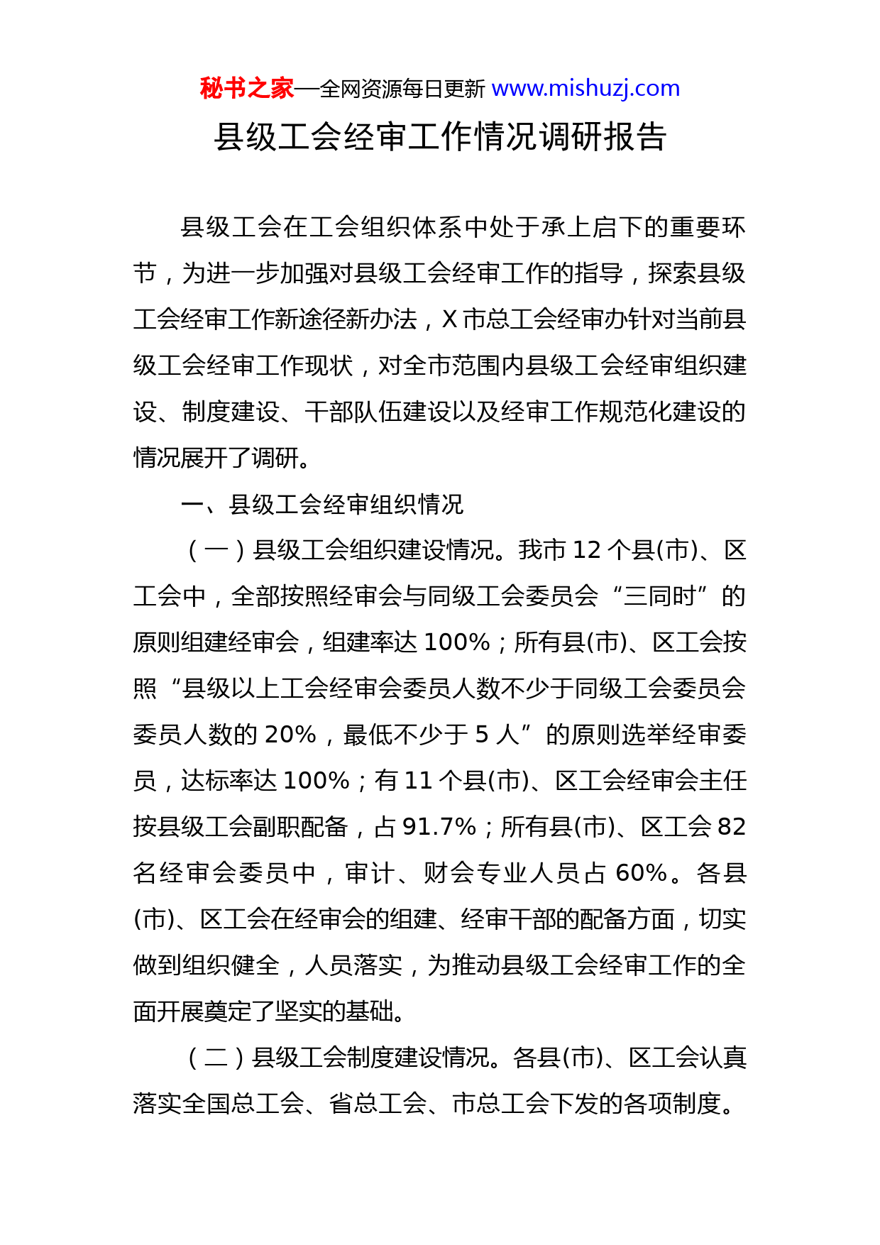 秘书之家—全网资源每日更新www.mishuzj.com县级工会经审工作情况调研报告县级工会在工会组织体系中处于承上启下的重要环节,为进一步加强对县级工会经审工作的指导,探索县级工会经审工作新途径新办法,X市总工会经审办针对当前县级工会经审工作现状,对全市范围内县级工会经审组织建设、制度建设、干部队伍建设以及经审工作规范化建设的情况展开了调研。一、县级工会经审组织情况(一)县级工会组织建设情况。我市12个县(市)、区工会中,全部按照经审会与同级工会委员会“三同时”的原则组建经审会,组建率达100%;所有县(市)、区工会按照“县级以上工会经审会委员人数不少于同级工会委员会委员人数的20%,最低不少于5人”的原则选举经审委员,达标率达100%;有11个县(市)、区工会经审会主任按县级工会副职配备,占91.7%;所有县(市)、区工会82名经审会委员中,审计、财会专业人员占60%。各县(市)、区工会在经审会的组建、经审干部的配备方面,切实做到组织健全,人员落实,为推动县级工会经审工作的全面开展奠定了坚实的基础。(二)县级工会制度建设情况。各县(市)、区工会认真落实全国总工会、省总工会、市总工会下发的各项制度。秘书之家—全网资源每日更新www.mishuzj.com积极落实市总工会制定的经审会主任年度述职制度,坚持每年向同级工会党组汇报经审工作,积极争取工会领导的支持,增强做好经审工作的责任感和使命感。全市12个县(市)、区工会中,都根据要求,执行了全国总工会8个审计操作规程,制定了内部会议制度或议事规则,制定了对下一级工会经审工作规范化建设考核标准。同时,市总工会每年对县(市)、区工会经审工作规范化建设情况进行综合考核。目前我市有11个县(市)、区工会经审规范化建设达到A级单位,达标率占91.7%。通过不断规范完善县(市)、区工会经审工作制度,创新经审工作方式,建立起经审工作规范化建设的长效机制。(三)县级工会经审干部培训情况。各县(市)、区工会根据《X市工会经审干部2011-2015年教育培训规划》的要求,积极组织经审干部参加由市总工会举办的经审业务培训,同时选派经审干部参加省总工会、省市内审协会举办的业务培训和继续教育,进一步提升了经审干部的政治素质和业务素质。(四)县级工会审计整改落实情况。2011年,各县(市)、区工会对市总工会提出的64条审计整改意见,整改55条,整改率达86%;2012年,提出的40条审计整改意见,整改37条,整改率达93%;2013年,提出的52条审计整改意见,整改49条,整改率达94%;2014年,秘书之家—全网资源每日更新www.mishuzj.com提出审计意见49条,已整改47条,整改率达到96%。审计整改率逐年提升。各县(市)、区工会在积极整改落实上级工会整改意见的同时,还通过建立“特邀审计员”制度,借助社会审计力量,不断加强对乡镇工会、基层工会进行计拨工会经费和财务收支情况的审计,构建经审监督工作的新格局,实现充实审计队伍与提升审计公信力的“双赢”。二、县级工会经审工作存在的问题(一)经审组织不够健全。一是县级工会经审会主任绝大部分是由同级工会副主席兼任的,由于他们本身分管的工作比较多,没有过多的精力过问经审工作,致使经审工作受到一定的影响;二是受内设机构编制限制,大部分县级经审会未设立经审办公室,有的只是配备了兼职的经审干部,致使经审工作开展不够规范。(二)经审工作制度建设亟待加强。近年来工会经审工作制度建设取得了突破性进展,但还需要不断完善。经审工作制度本身还存在缺陷,缺乏刚性、强制性,对不接受审计监督或经审监督不力的,缺少制约措施和问责手段。另外各地制度建设发展不平衡,特别是县级以下工会经审组织,存在上级有章不知道遵循、本级又无章可循的现象,导致经审监督出现随意性、盲目性,造成审计监督职能缺失。秘书之家—全网资源每日更新www.mishuzj.com(三)经审工作水平不高。虽然各县(市)、区工会的内部审计工作水平在逐年提高,但和政府审计部门工作水平相比还存在一定差距。政府审计部门在对同级县(市)、区工会进行审计时,往往会发现内部审计人员未发现的问题。(四)不同地区经审工作开展不平衡。受各种因素的影响,不同地区的工会经审工作开展情况不够平衡,在机构设置、人员配备、工作开展、经费保证等方面存在较大的差别,导致总体的审计职能作用发挥不够。(五)部分基层工会经审会未发挥作用。部分基层工会的经审会形同虚设或经审委员没有发挥作用,存在有组织无人员,有人员无制度,有制度无内容,有内容走形式的情况,甚至存在未设立工会经费专户的情况。县级工会对此类基层工会的审计往往无法正常开展。(六)经审干部整体素质还须提高。工会经审工作是一项政策性、专业性较强的工作,经审干部没有较高的政治业务素质,就难以有效开展工作。近些年来,各级工会虽然加大了干部培训工作力度,但经审干部队伍仍然难以适应新形势、新任务的要求,高素质的专业人才少,一些兼职人员责任意识不强、业务知识缺乏、专业水平不高,因而常常出现“不愿审、不想审、不敢审、不会审”的情况。三、对加强县级工会经审工作的对策及建议(一)加强经审干部队伍建设。配齐配强经审干部是秘书之家—全网资源每日更新www.mishuzj.com经审工作能否顺利开展的前提,县级工会应积