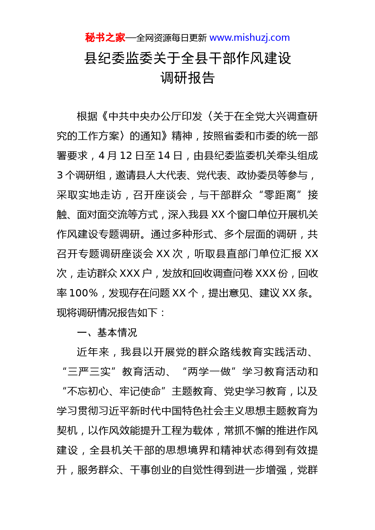 秘书之家—全网资源每日更新www.mishuzj.com县纪委监委关于全县干部作风建设调研报告根据《中共中央办公厅印发〈关于在全党大兴调查研究的工作方案〉的通知》精神,按照省委和市委的统一部署要求,4月12日至14日,由县纪委监委机关牵头组成3个调研组,邀请县人大代表、党代表、政协委员等参与,采取实地走访,召开座谈会,与干部群众“零距离”接触、面对面交流等方式,深入我县XX个窗口单位开展机关作风建设专题调研。通过多种形式、多个层面的调研,共召开专题调研座谈会XX次,听取县直部门单位汇报XX次,走访群众XXX户,发放和回收调查问卷XXX份,回收率100%,发现存在问题XX个,提出意见、建议XX条。现将调研情况报告如下:一、基本情况近年来,我县以开展党的群众路线教育实践活动、“三严三实”教育活动、“两学一做”学习教育活动和“不忘初心、牢记使命”主题教育、党史学习教育,以及学习贯彻习近平新时代中国特色社会主义思想主题教育为契机,以作风效能提升工程为载体,常抓不懈的推进作风建设,全县机关干部的思想境界和精神状态得到有效提升,服务群众、干事创业的自觉性得到进一步增强,党群秘书之家—全网资源每日更新www.mishuzj.com干群关系进一步密切,形成了推进转型发展的强大动力。此次调研主要围绕机关干部4个方面作风问题和8个方面评价内容进行调研,据问卷调查显示,XX%的调查对象对机关干部作风总体评价为好和较好;XX%的调查对象对机关干部在勤业精神方面评价为好和较好;XX%的调查对象对机关干部在工作态度方面评价为好和较好;XX%的调查对象对机关干部在开拓进取方面评价为好和较好;XX%的调查对象对机关干部在工作纪律方面评价为好和较好;XX%的调查对象对机关干部在为群众方办事效率评价为满意和比较满意;XX%的调查对象对机关干部作风评价为有明显好转和有所好转。二、机关干部在作风建设方面存在问题及原因剖析当前,我县机关干部作风建设总体上是好的,但也要清醒地看到,各级机关干部作风建设中还不同程度地存在着思想“松”、作风“散”、能力“弱”、状态“差”的问题。一是思想“松”,缺乏执着信念。有的干部精神状态比较懈怠,思想空虚,精神萎靡,缺少责任意识,缺少进取精神,缺少执着信念,不愿意吃苦出力,更不想创造性地开展工作。有的干部在破解发展难题上缺少章法,碰到困难和问题绕道走,尤其在处理一些棘手、急需解决的问题时,态度暧昧,不敢碰硬,怕担当、怕出事,存在多一秘书之家—全网资源每日更新www.mishuzj.com事不如少一事的思想。二是作风“散”,缺乏服务意识。一些单位衙门作风突出,对群众的疾苦充耳不闻,或故意刁难、推诿扯皮,门难进、脸难看、话难听、事难办的问题依然存在。少部分干部上班时间迟到早退,无所事事,上网聊天、玩游戏、炒股票;个别干部随心所欲,不讲组织纪律,不请示不报告长期缺岗。有些执法人员视规章制度于不顾,工作粗枝大叶,态度慵懒散漫。三是能力“弱”,缺乏敬业精神。有的干部习惯于按部就班,循规蹈矩,墨守成规,领导安排做什么就做什么,推一下动一下,对工作缺乏积极主动、执行力差。有的干部没有危机感、紧迫感和前瞻意识,对本职工作业务不钻研,对政策法规不熟悉,身在其位不谋其政,业务素质不高,办事能力弱,谋不到点子、干不到实处。个别部门干部存在着不同程度的“知识恐慌”、“能力恐慌”,知识结构和专业技能老化。四是状态“差”,缺乏奋斗热情。主要表现在干部意识慢、工作节奏慢、部门协调慢、职能转变慢。部分干部开始从事工作时往往热情很高、干劲十足,但时间一长,饱满的激情逐渐被平淡的工作磨平,取而代之的是精神不振和不在状态。有的在现实和理想出现落差时精神上萎靡不振、暮气沉沉,工作被动应付,缺乏主动服务的热情。秘书之家—全网资源每日更新www.mishuzj.com个别科股长自持劳苦功高、业务熟悉,把行政权力部门化、部门权力利益化,对上级决策部署阳奉阴违、落实不力,对工作合意的就干,不合意的就拖着干;致使岗位调动困难、工作难以推进,“中梗阻”等问题突出。机关干部作风方面存在的问题,产生的原因是复杂的。通过调查分析,主要有以下三个方面的原因。一是思想教育不到位。一些单位“重业务、轻教育”的观念还没有从根本上转变,长期忽视机关干部职业素养及业务知识培训;或者是思想教育形式化,平时不注重政治理论和业务的学习,缺乏经常性、主动性、实效性,满足于教育搞过了、文件学过了、录相看过了,造成干部精神缺“钙”。二是职能划分不清晰。一些单位机构臃肿、人员老化,干部工作效率低。虽然党政机关经过了多次精简与调整,依然存在机构重叠,职责交叉等问题。加上机构人员老龄化,职责关系理不顺,工资待遇跟不上,导致干部调动难、推诿扯皮时有发生、工作效率低下等问题。三是监督管理不严格。一些单位主体责任和监督责任落实不力,对机关干部作风问题不愿管、不敢管;一些工作纪律、规章制度、考评机制形同虚设,或者有的在执行中变形、走样,导致“庸、懒、散、漫”风气得不到有效遏止。加上部门领导在干部升迁评定上无话语权,以及差旅费、绩效奖金等差异幅度小,无法通过政治待遇、经济待秘书之家—全网资源每日更新www.mishuzj.com遇等